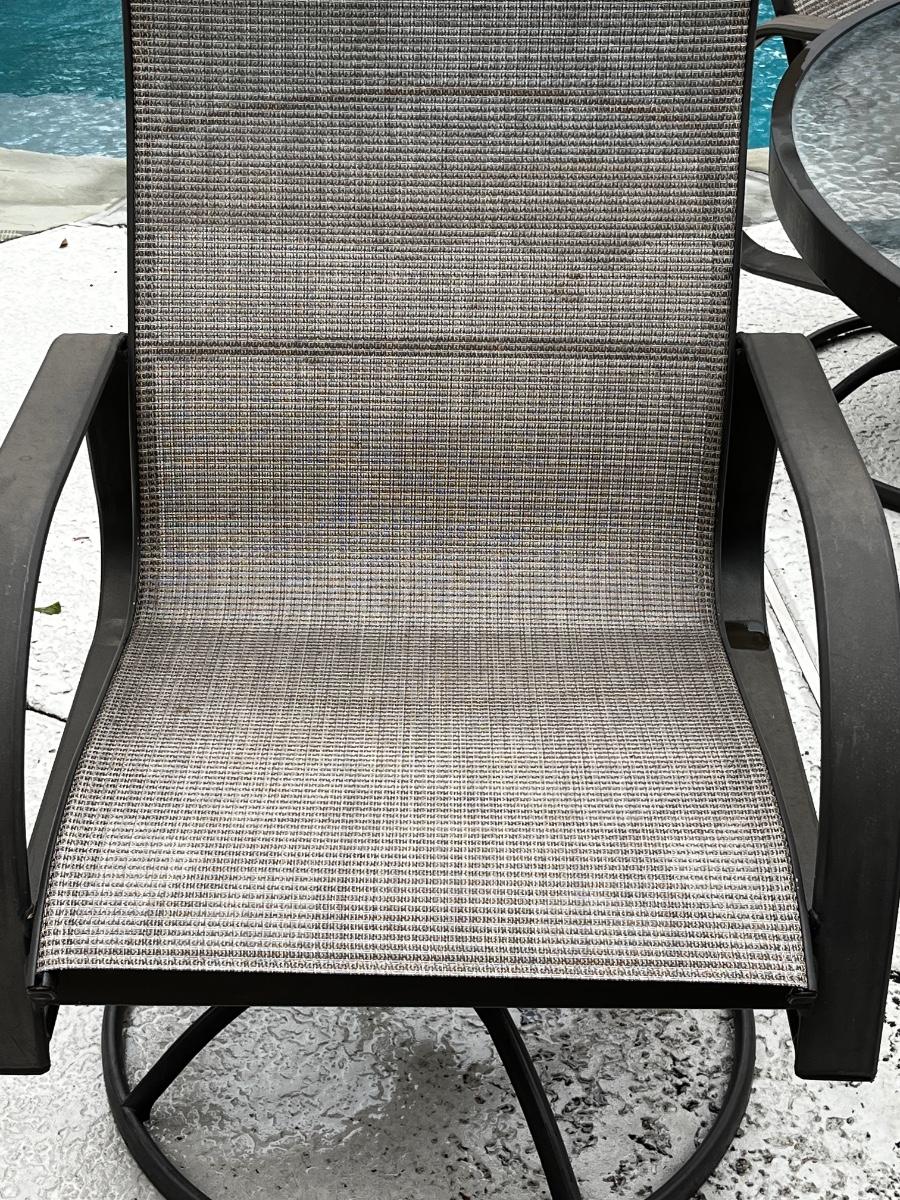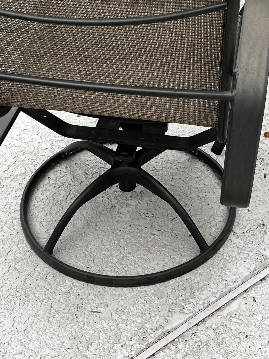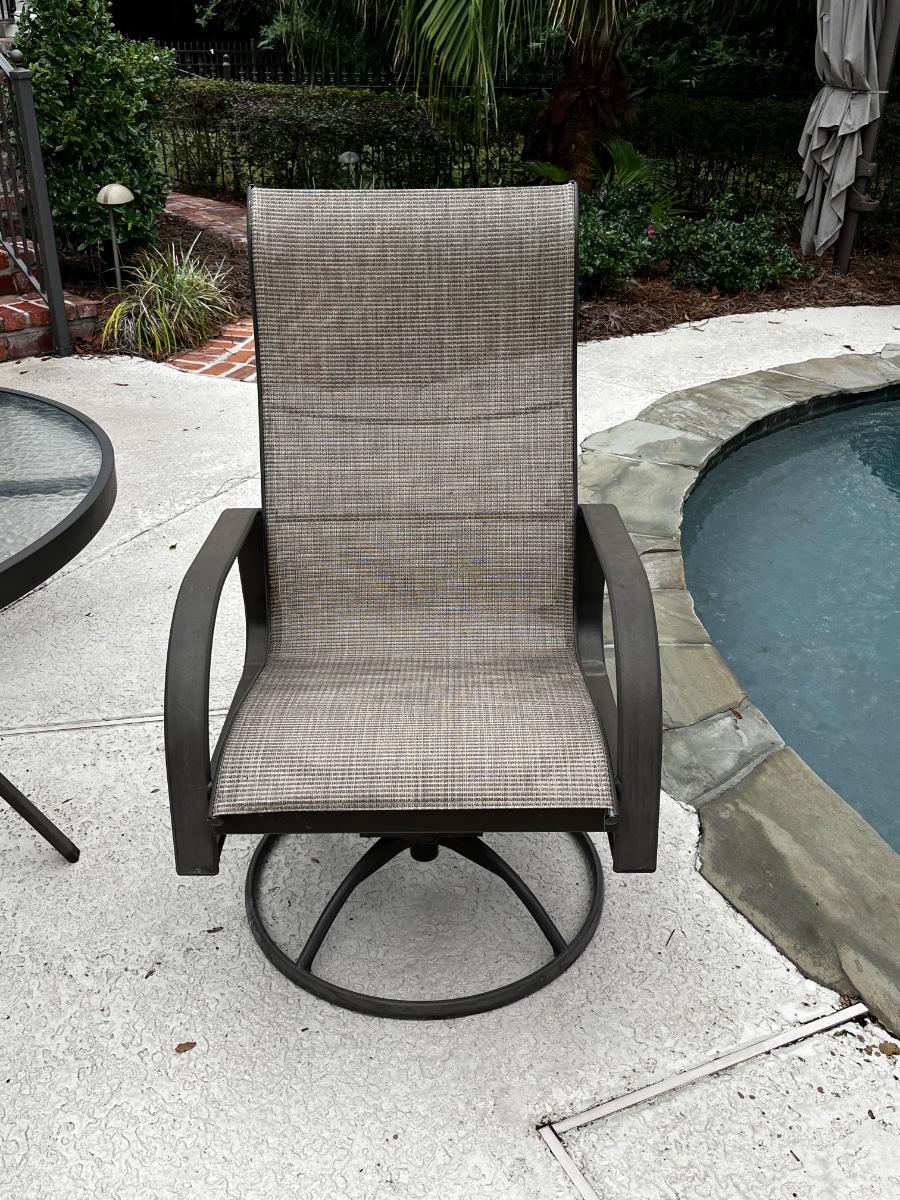 Table = 28” H x 48” round ~ 4 chairs = 42.5” H x 26” W x 26” D ~ chairs swivel & rock ~