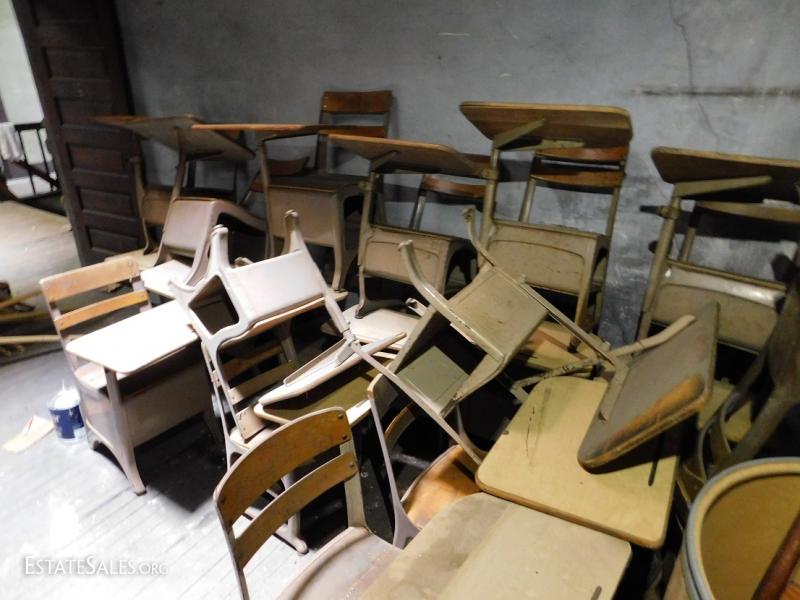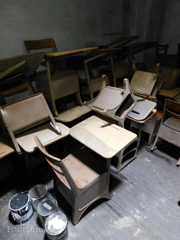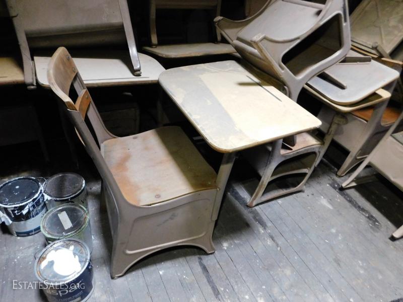 Set Four of 5 Metal Seat and Wood Top School Desks need cleaning. Have some scratches and dings. All are in equal shape and condition. Have 4 sets total.
