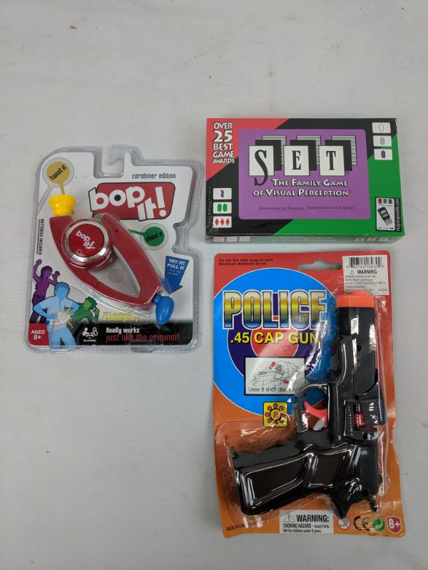 Set Game & Bop It & Police .45 Cap Gun - New, Damaged Package