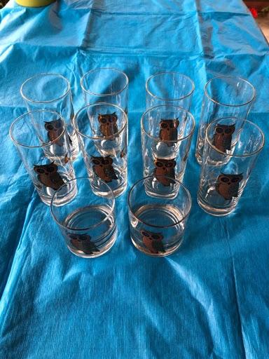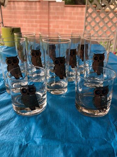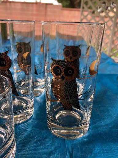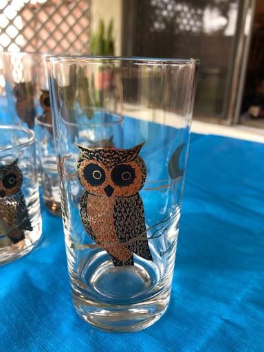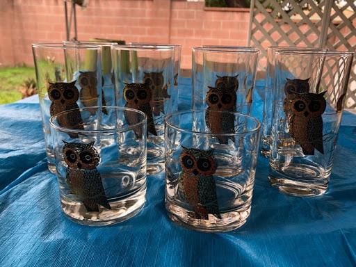 Vintage set of Couroc Drinking glasses. Golden Owl pattern. Set is made of 8 tall glasses and 2 short glasses. All are in good condition.