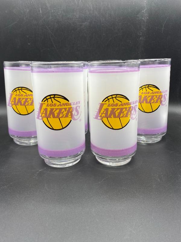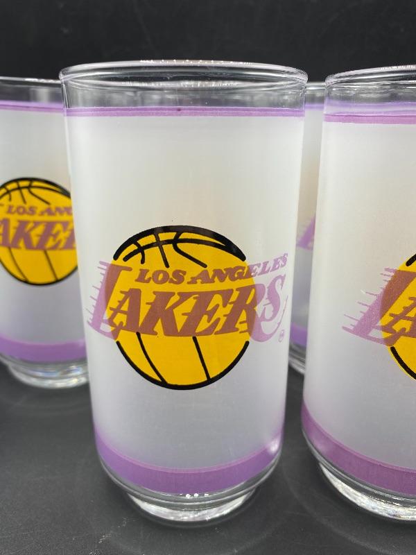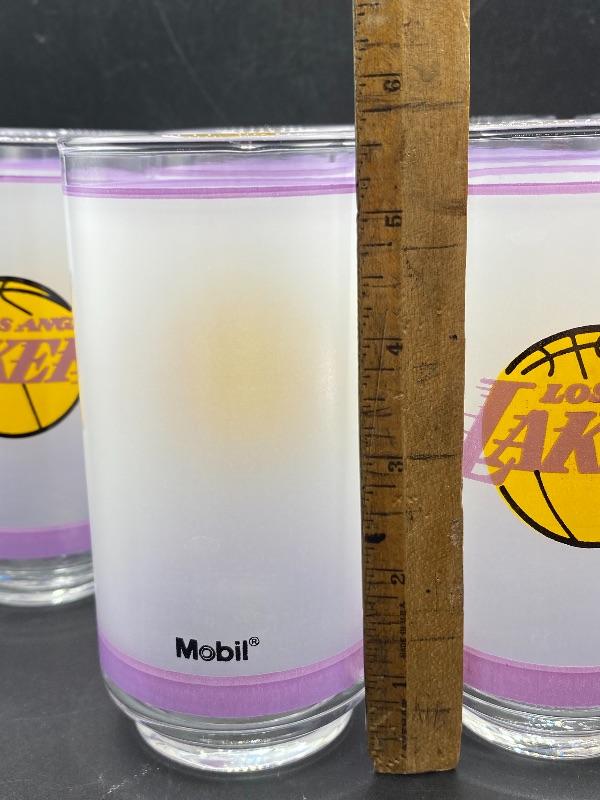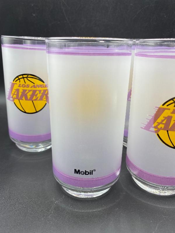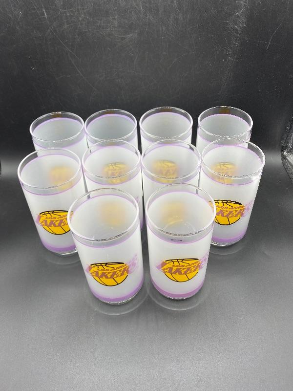 Set of 10 retro Los Angeles Lakers drink glasses. Frosted glass with purple stripe and team name. These are in excellent condition. Released by Mobil gas in the 1980's. A little over 5.5" tall.