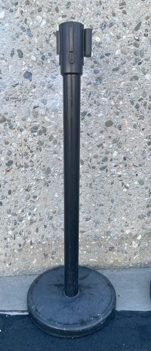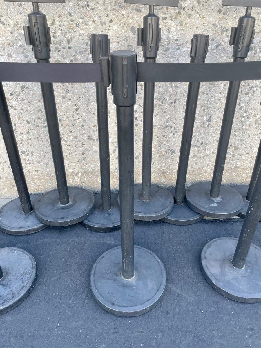 Set of 11 Crowd Control Stanchions with Retractable Belt Line Dividers (photo shows 10, actually selling 11). Steel bases and posts, bases are weighted to keep them upright when belt lines are fully extended. Includes 3 post-top sigh holders. Belts extend approx. 72", are designed to be clipped to other stanchions (see photos).