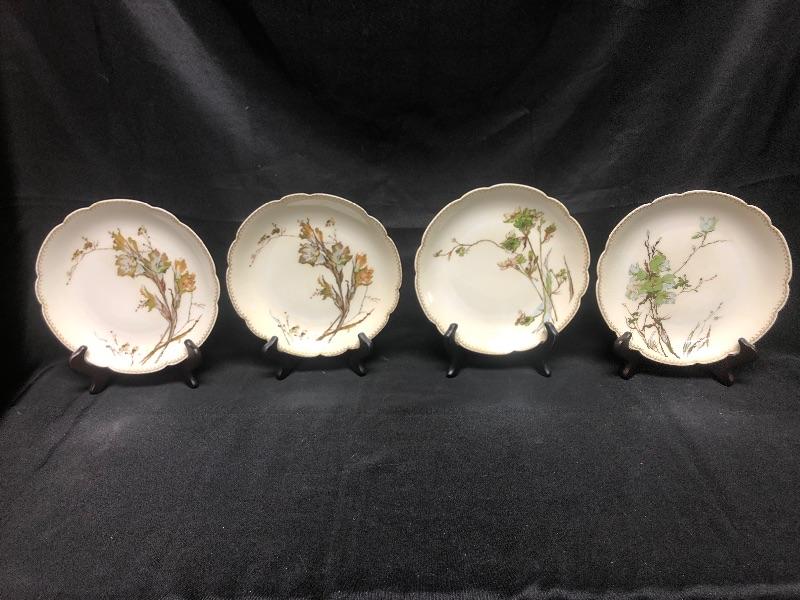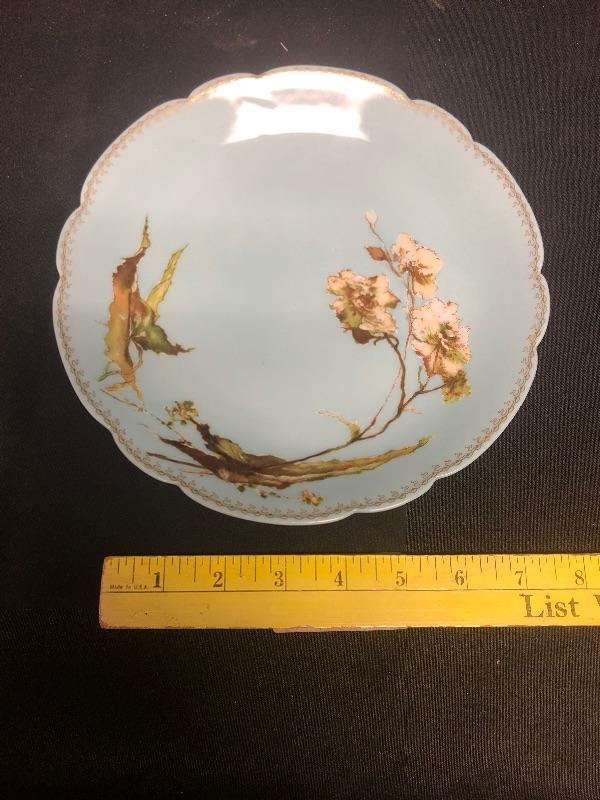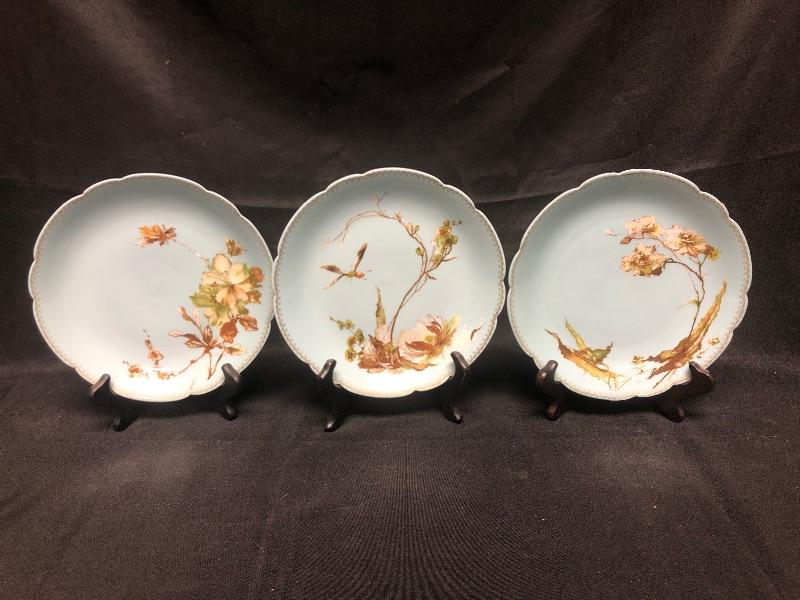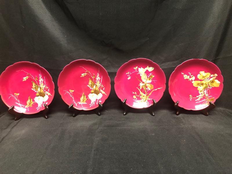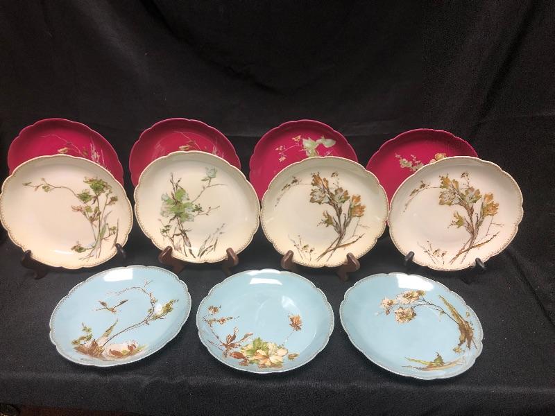 Set of 11 Floral Pattern Plates. Limoges France, scalloped edge luncheon plates. 4 red, 4 white, and 3 blue. Interesting plates, they are heavy glaze on the red and blue plates. Good Condition.