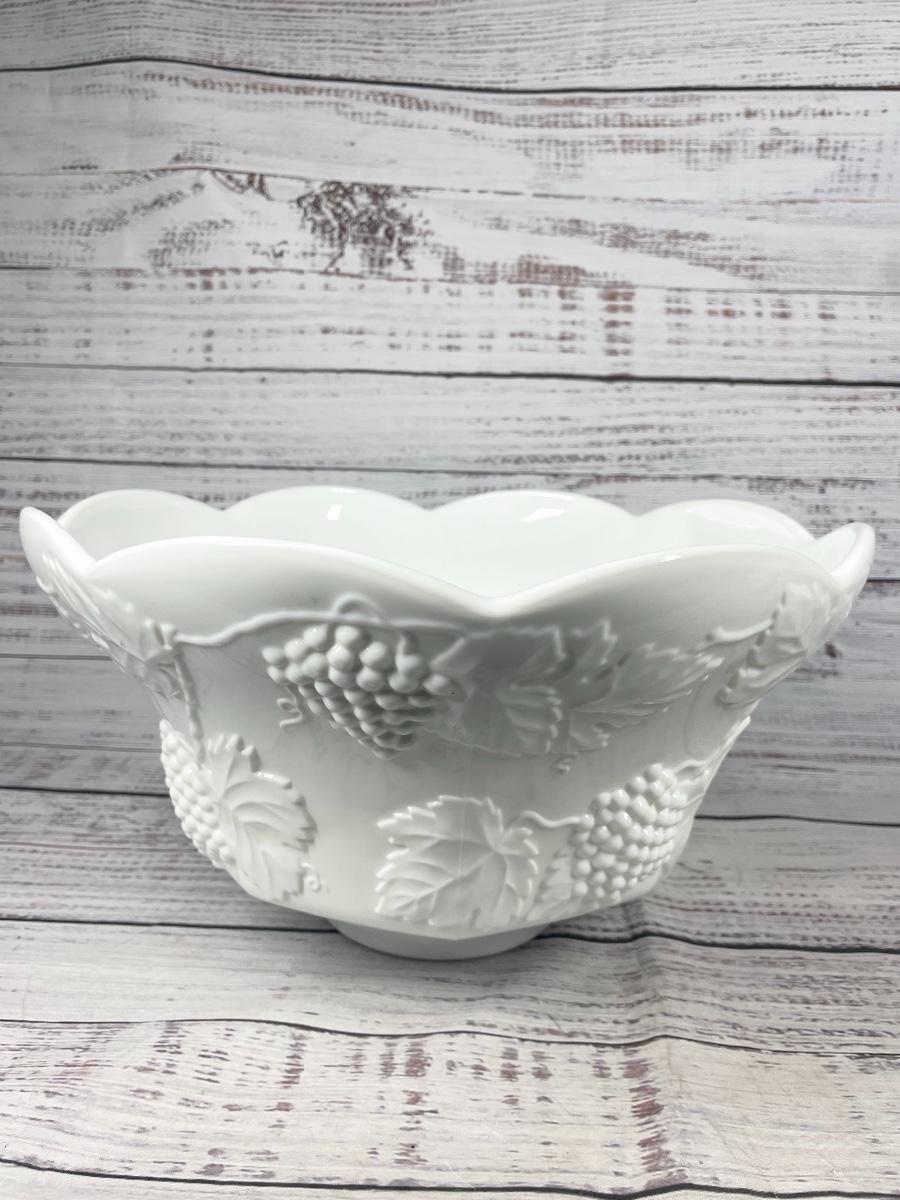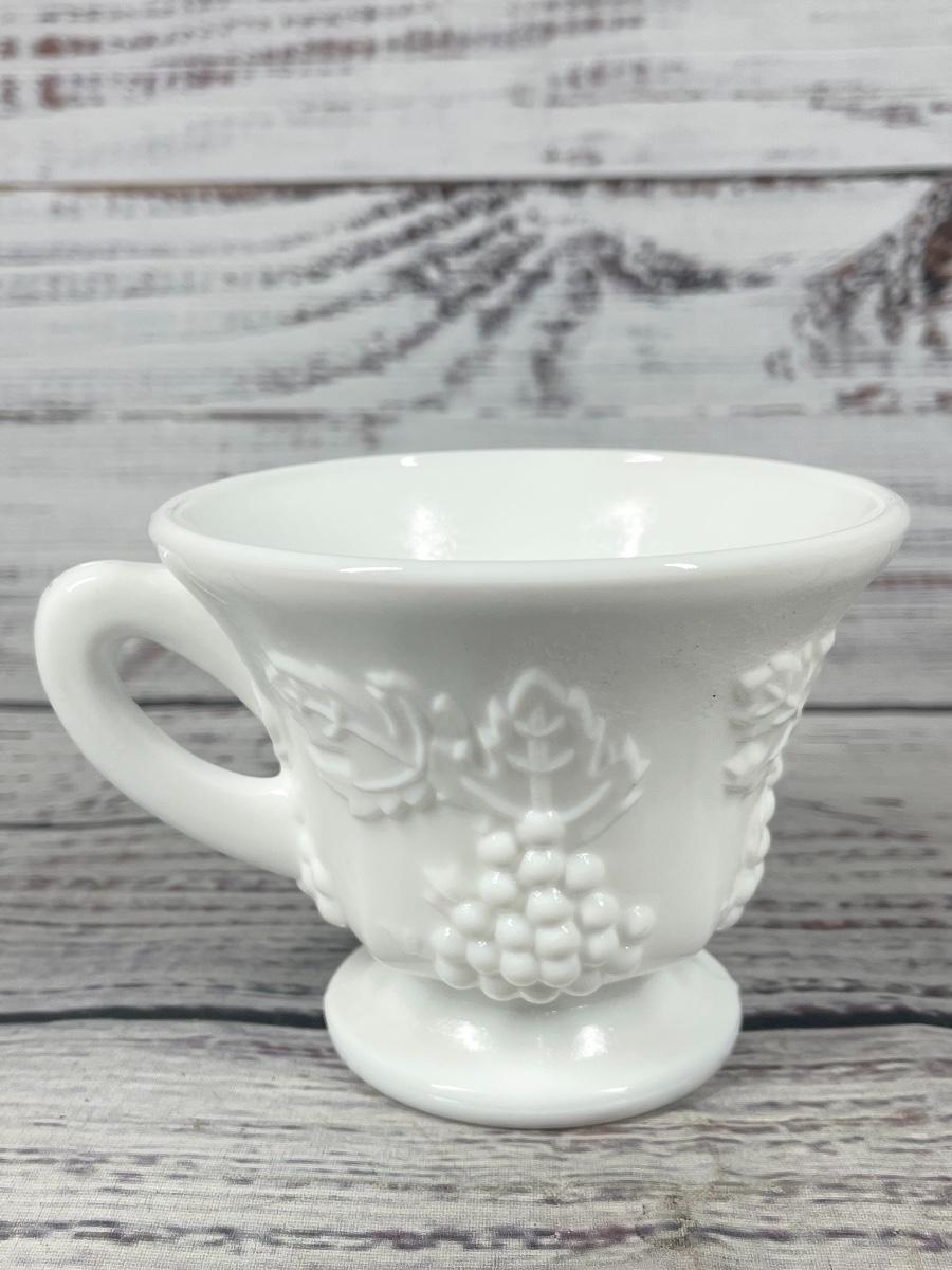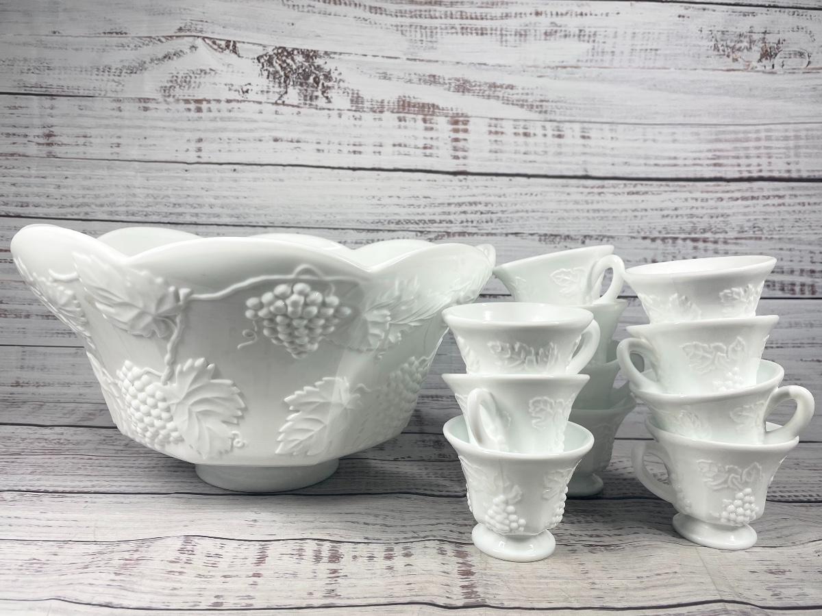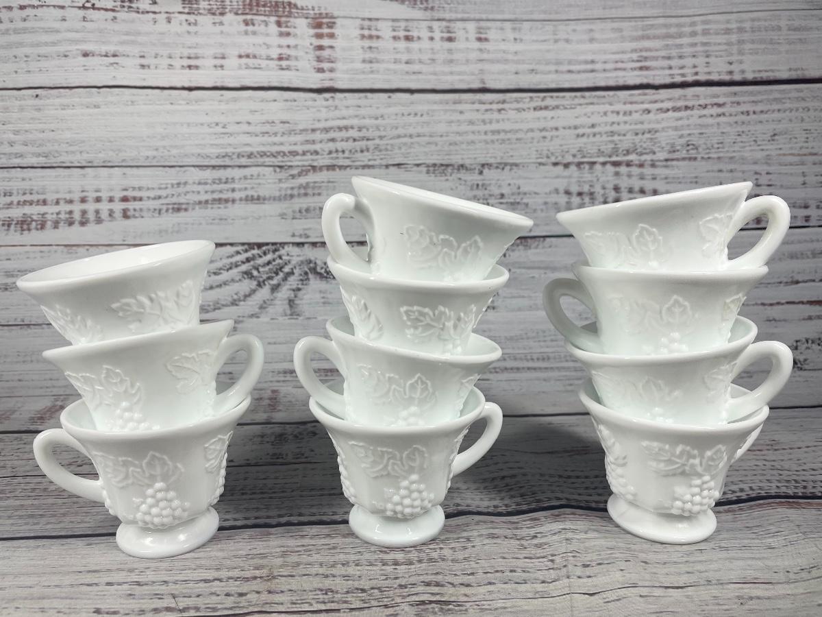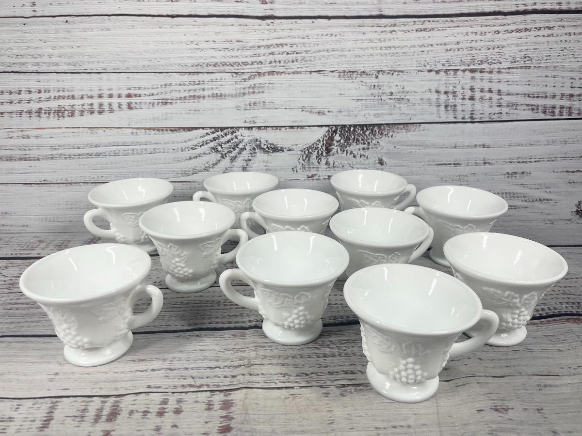Set of 11 Vintage Harvest Grape Milk Glass Tea Cup Mug and Large White Fruit Bowl