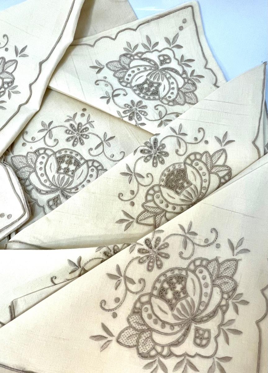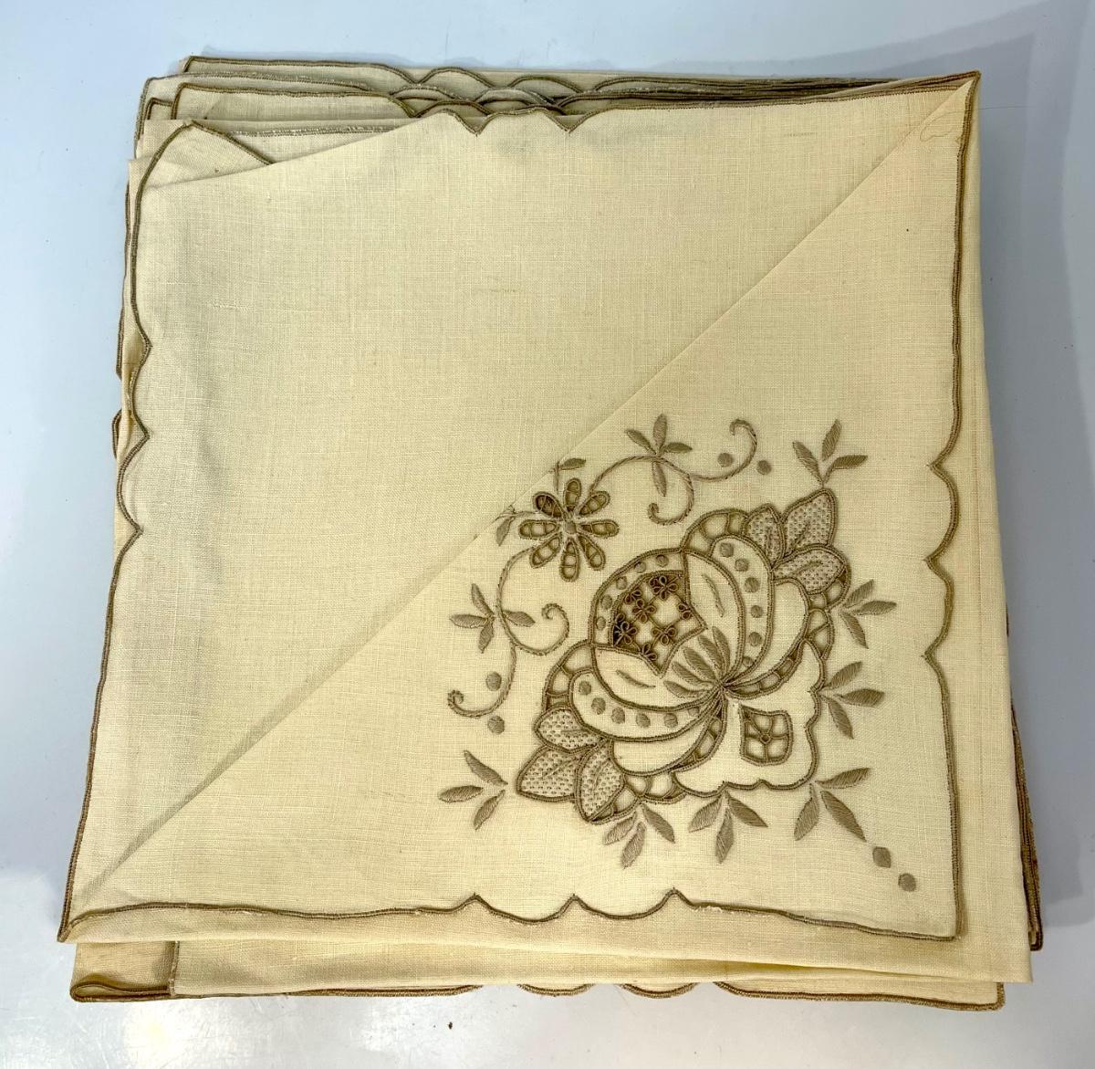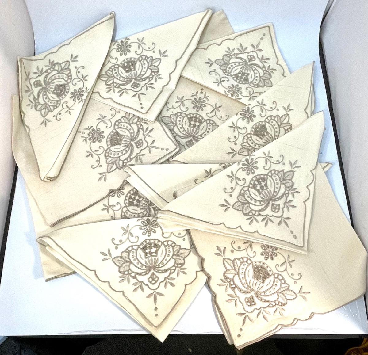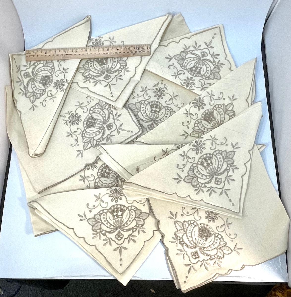 Set of 12 linen napkins with embroidery pattern on corner, vintage, used condition