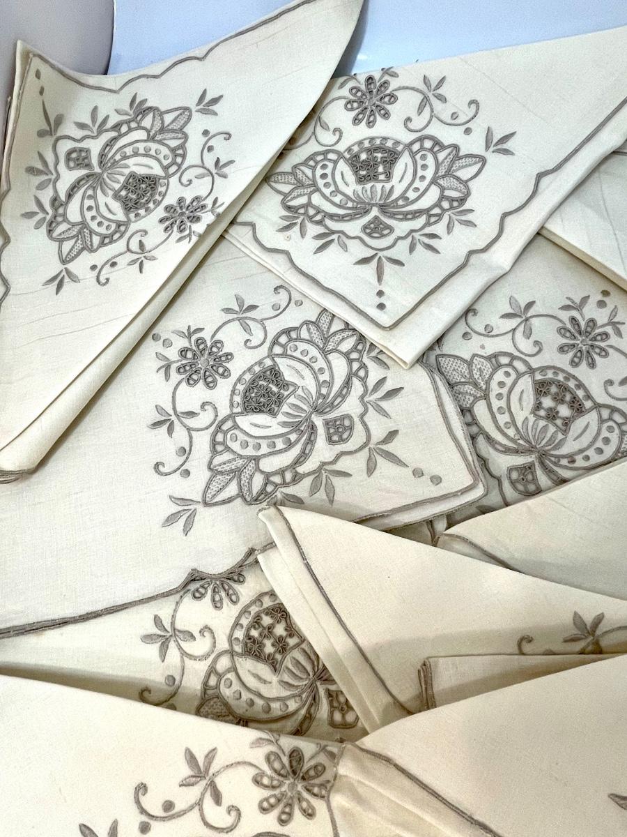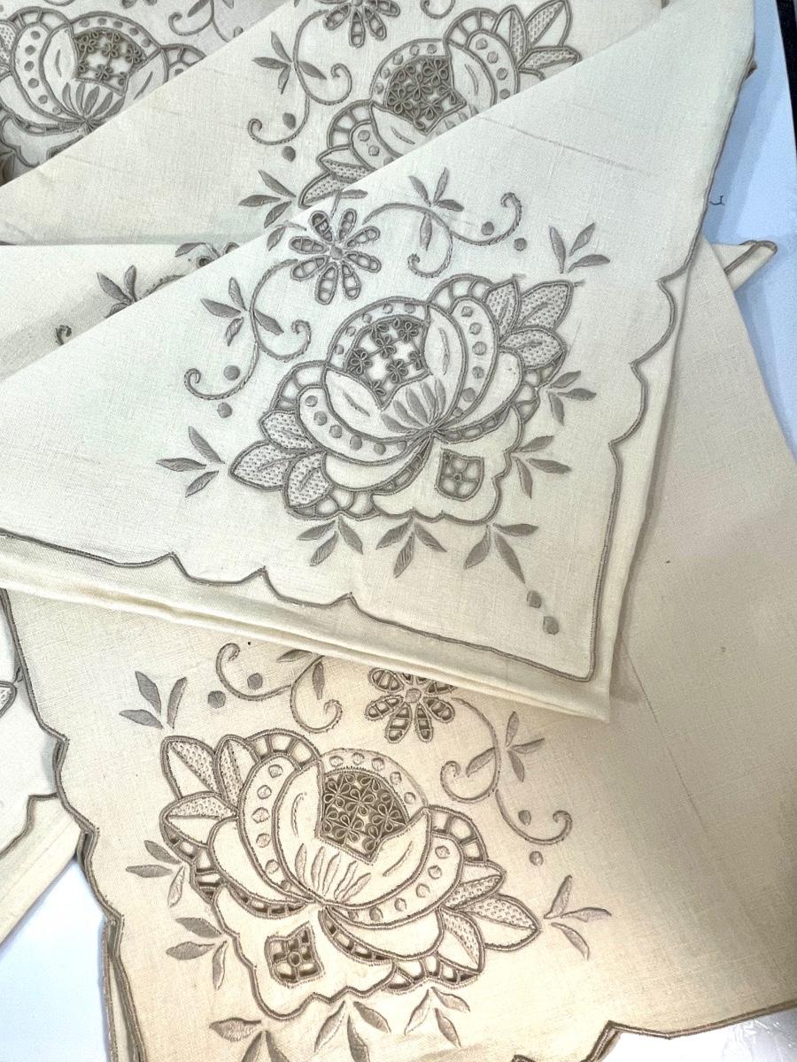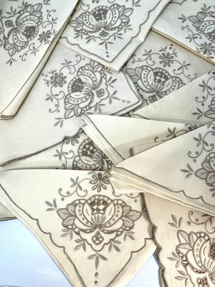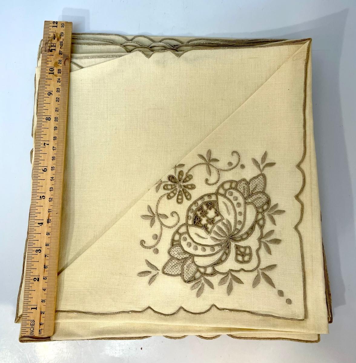 Set of 12 linen napkins with embroidery pattern on corner, vintage, used condition