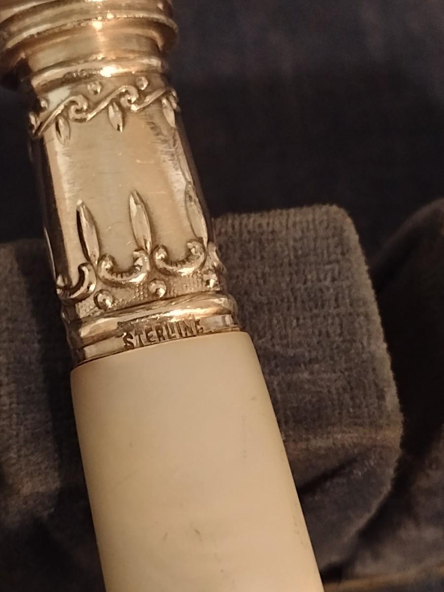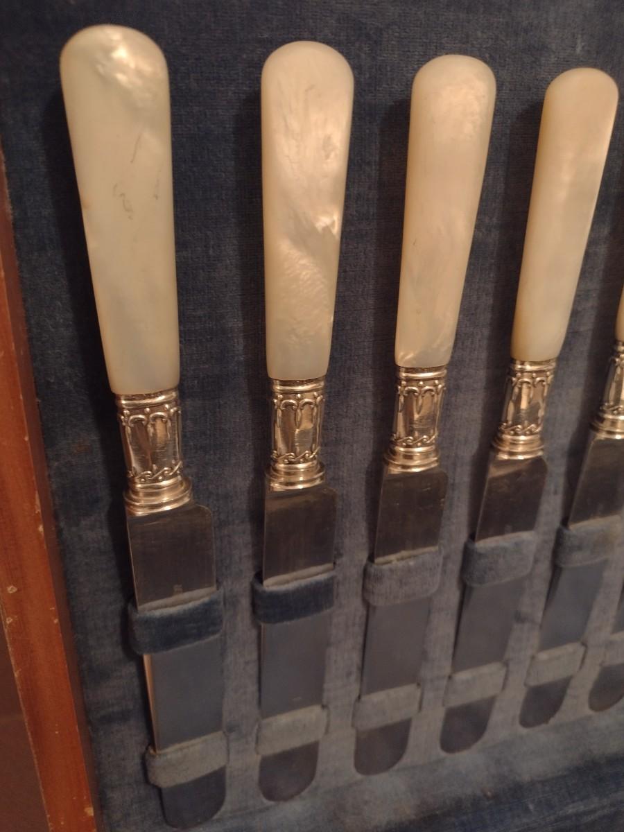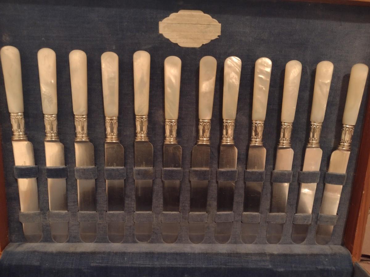 Set of 12 Mother of Pearl Handle E. C. Simmons Keen Kutter Cutlery with Sterling Ferrules (No Box)