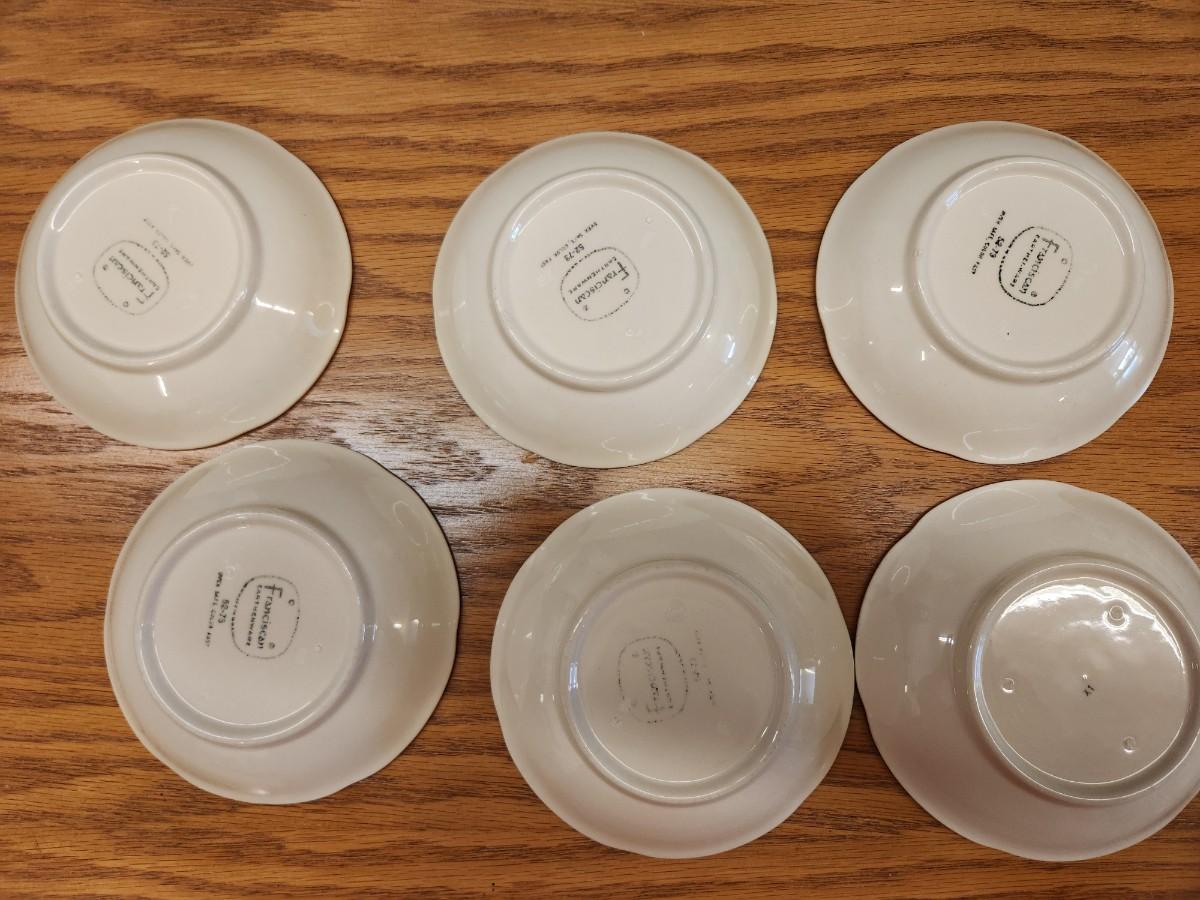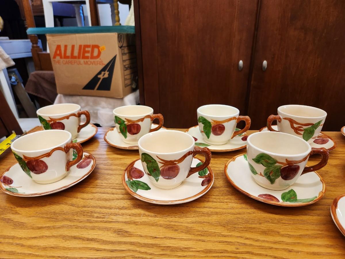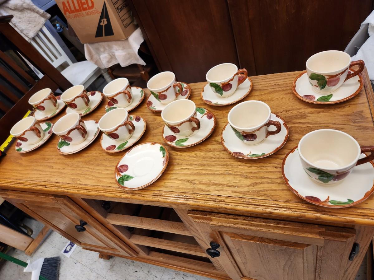 12 teacups and saucers, plus one extra saucer. Tried to match up the marks accurately. Many different years