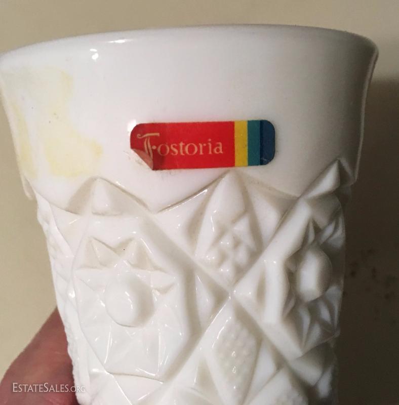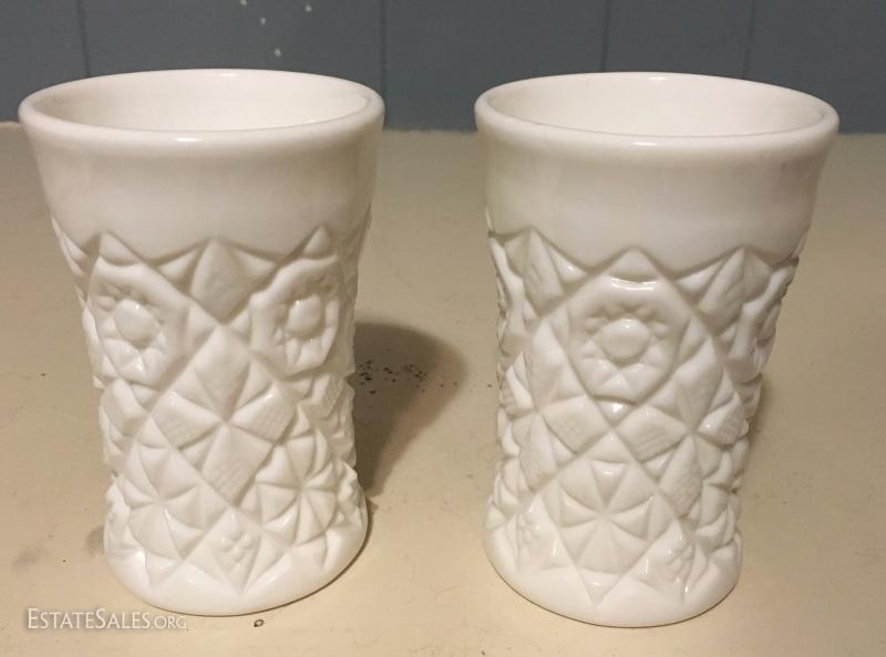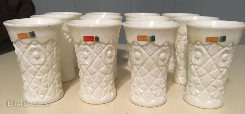 Set of 14 Winburn by Fostoria milk glass tumblers includes 12 large tumblers (maybe 10oz) and 2 small tumblers (6oz). Some of the glasses do have minor stains or marks, but are still in good condition.