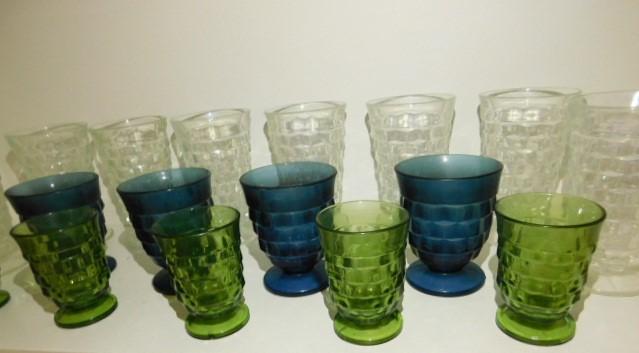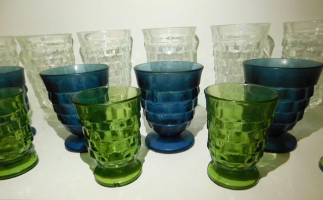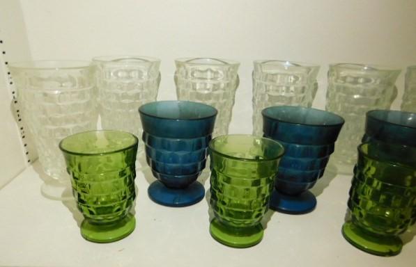 Set of 17 Footed Cube Pattern Drinking Glasses Clear, Blue, and Green