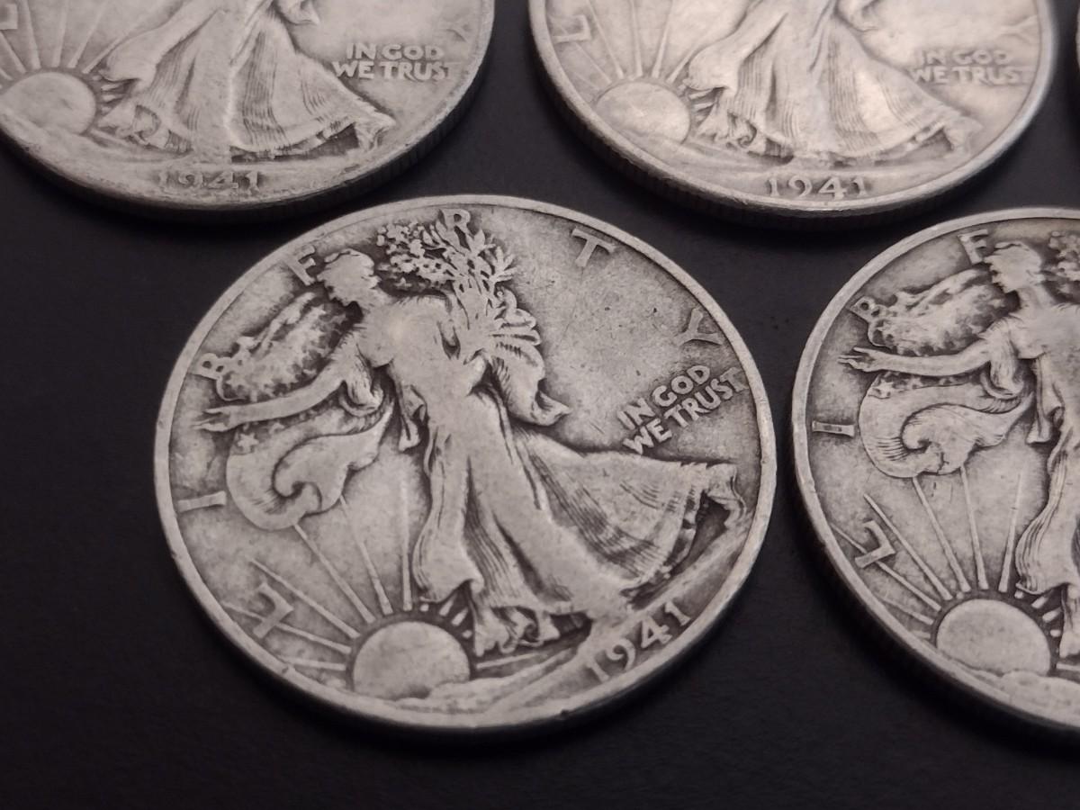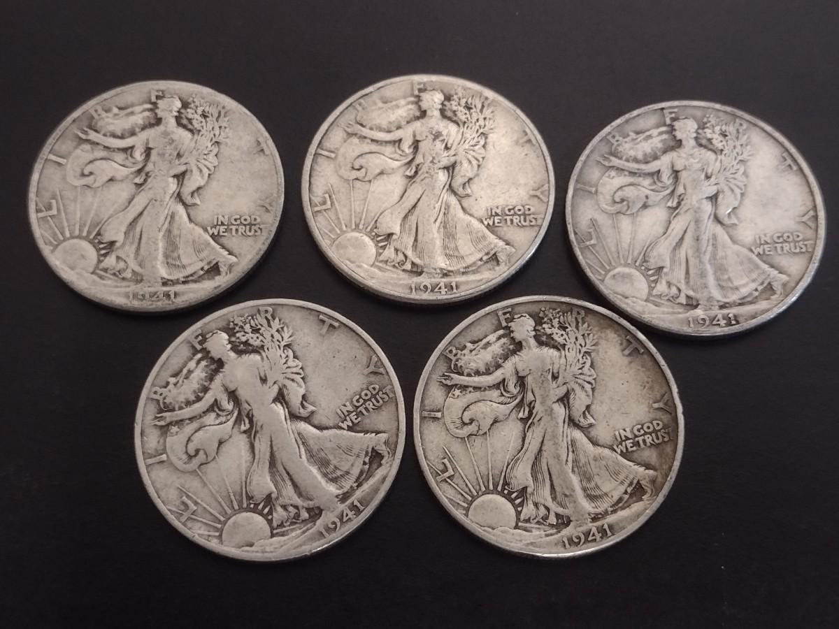 Set of 5 1940's U.S. Mint Walking Liberty Silver Half-Dollars Circulated (#118)