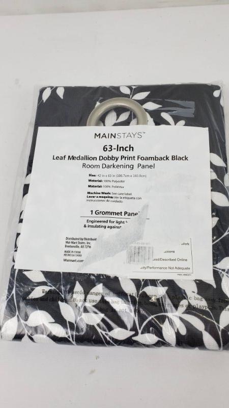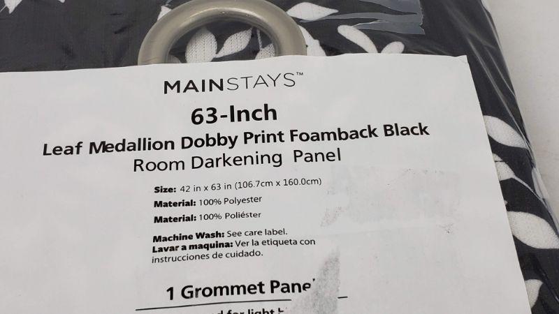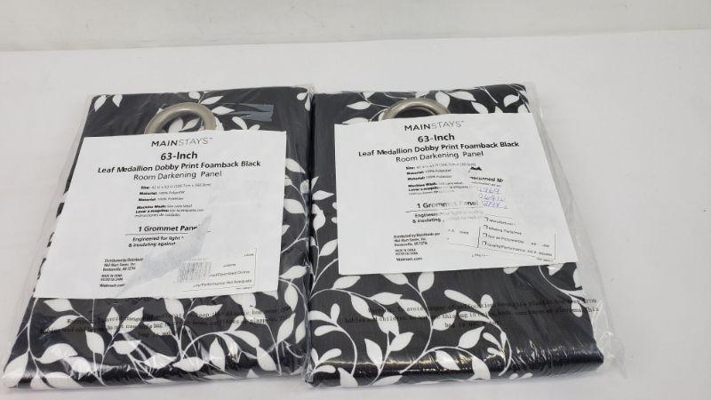 Set of 2 63-Inch Grommet Panels, Leaf Medallion, Dobby Print, Foamback, Black & White, Room Darkening - New
