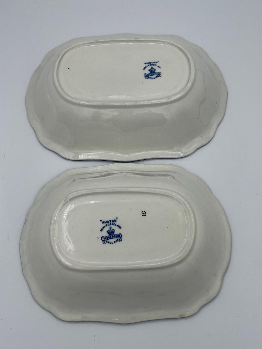 Set of 2 Vintage Wood & Son England "Khotan" Oval Blue & White Porcelain Platters. One platter is 9" and the other is 8". Based on the maker's mark, these pieces were most likely produced at the end of the 19th century, early 20th century. Each is in very good condition with very minor visible wear. # 93