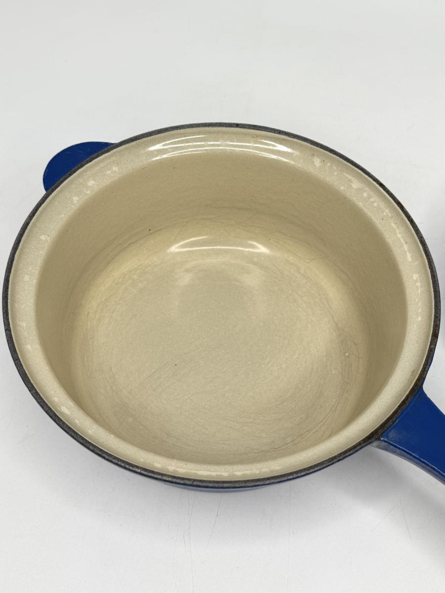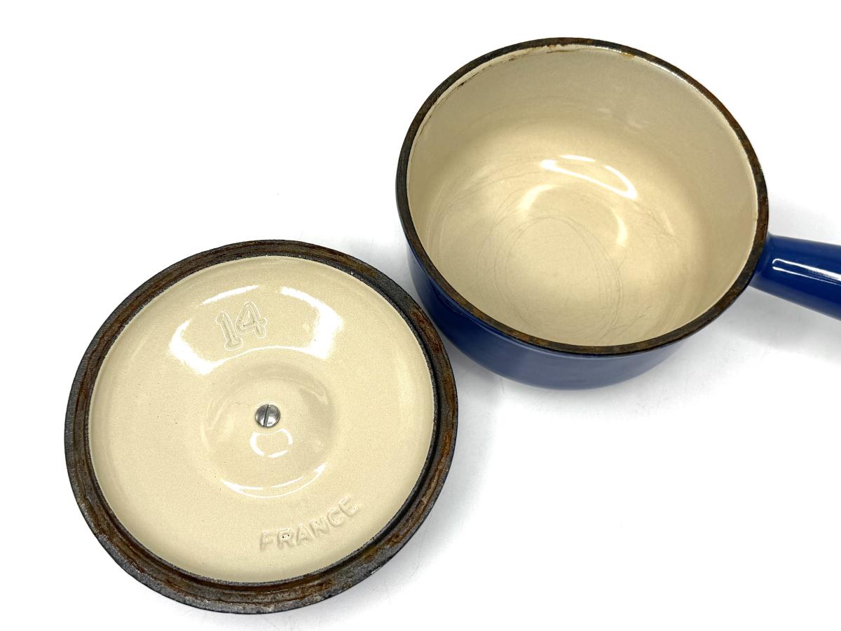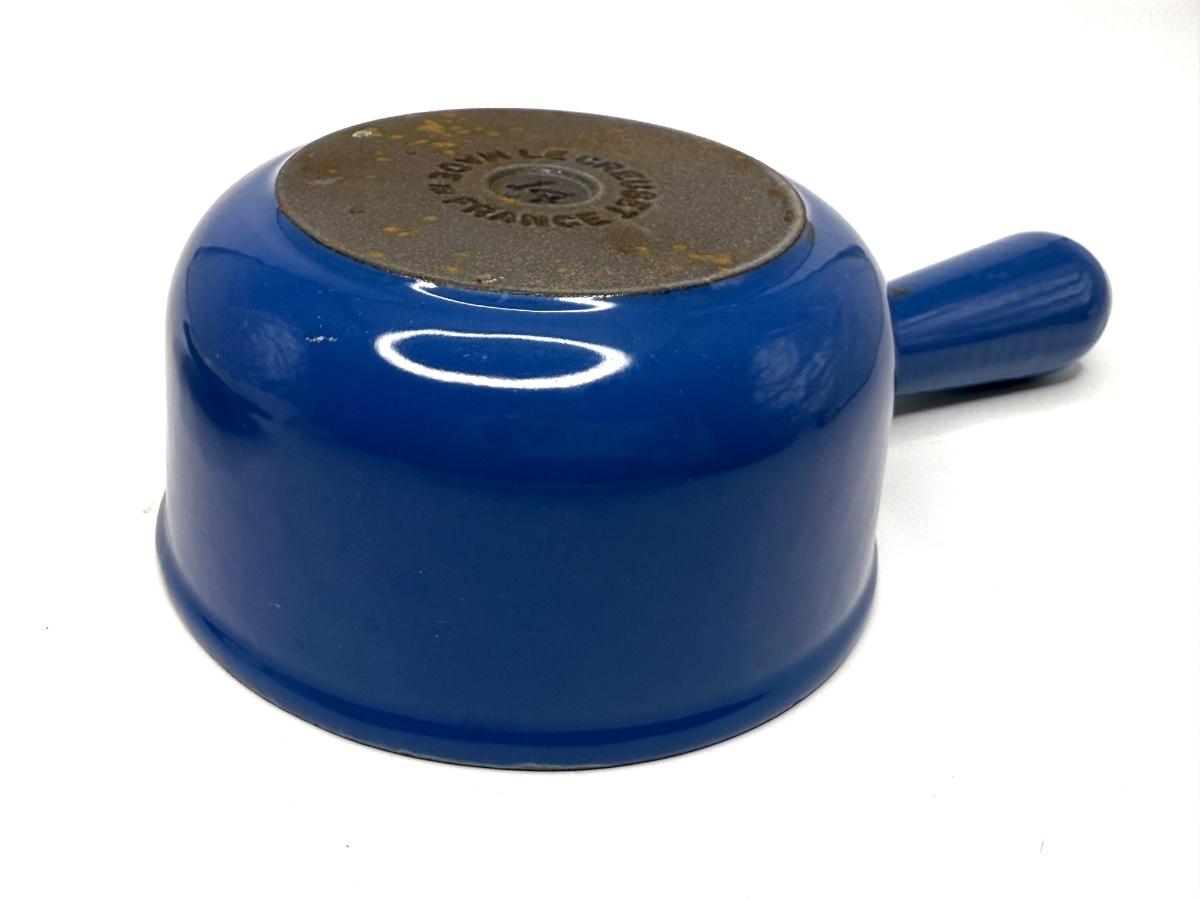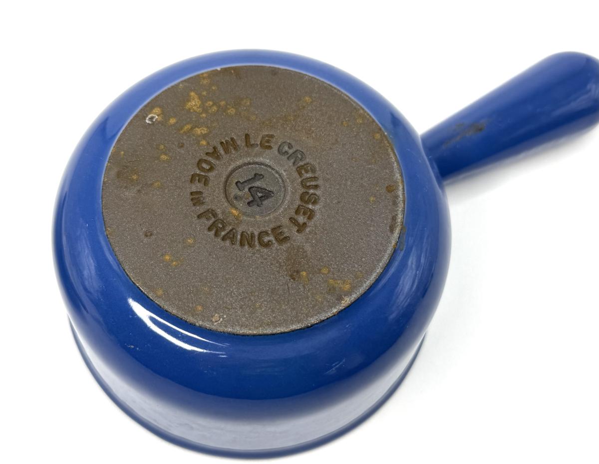 2. Small lidded Le Creuset sauce pot with the number 14 on the bottom. Has 2 brown stains inside the pot as shown. Measures 5-1/2” diameter x 2/3/4” tall.