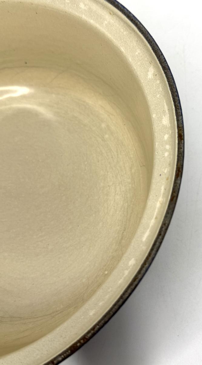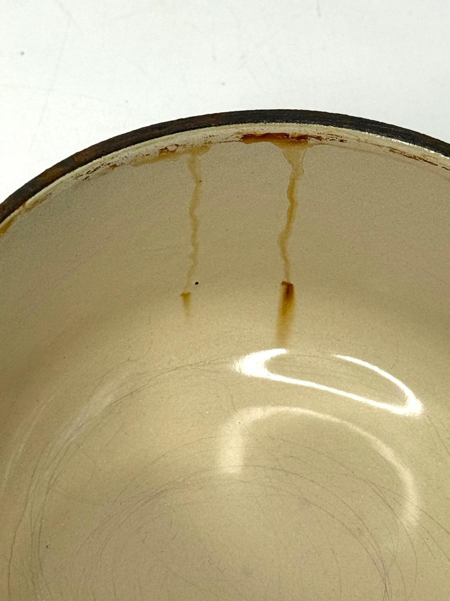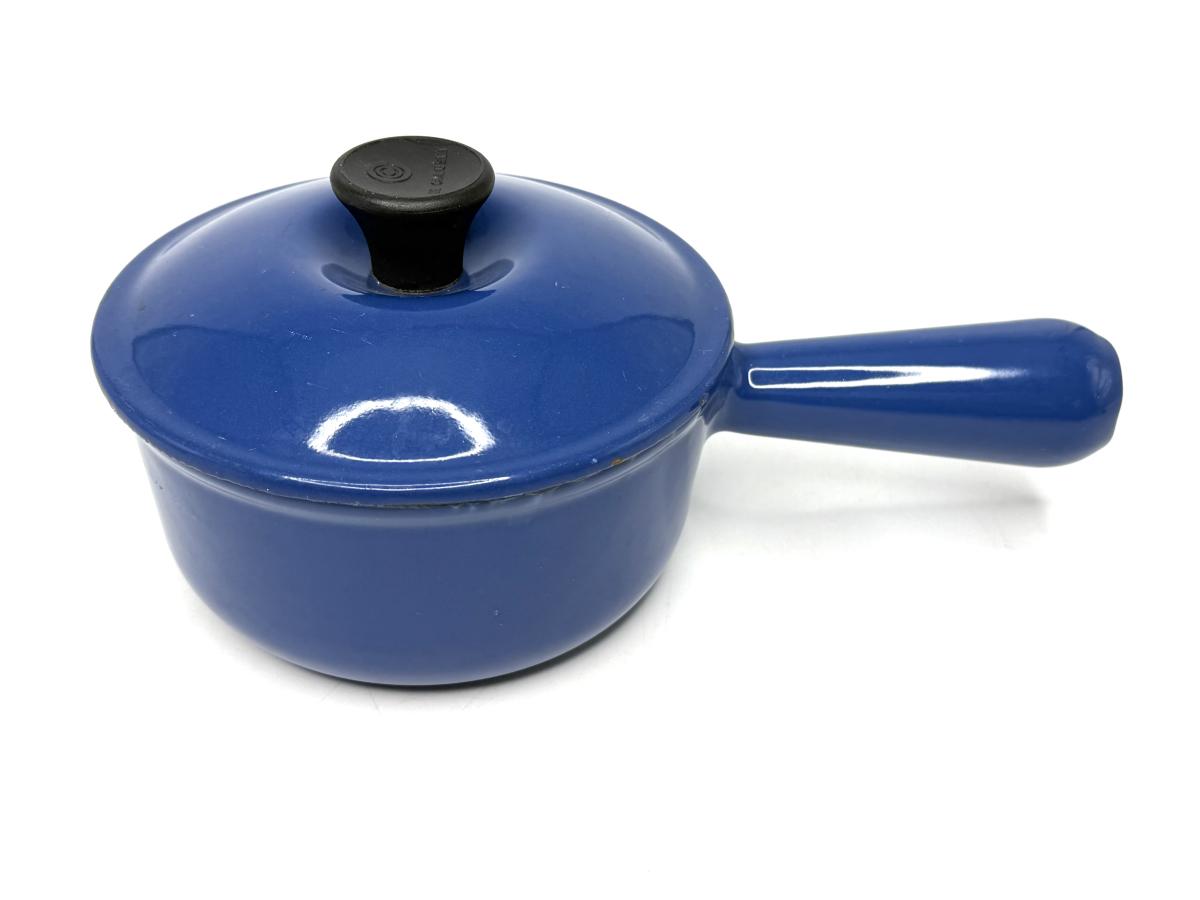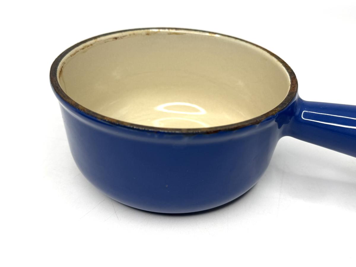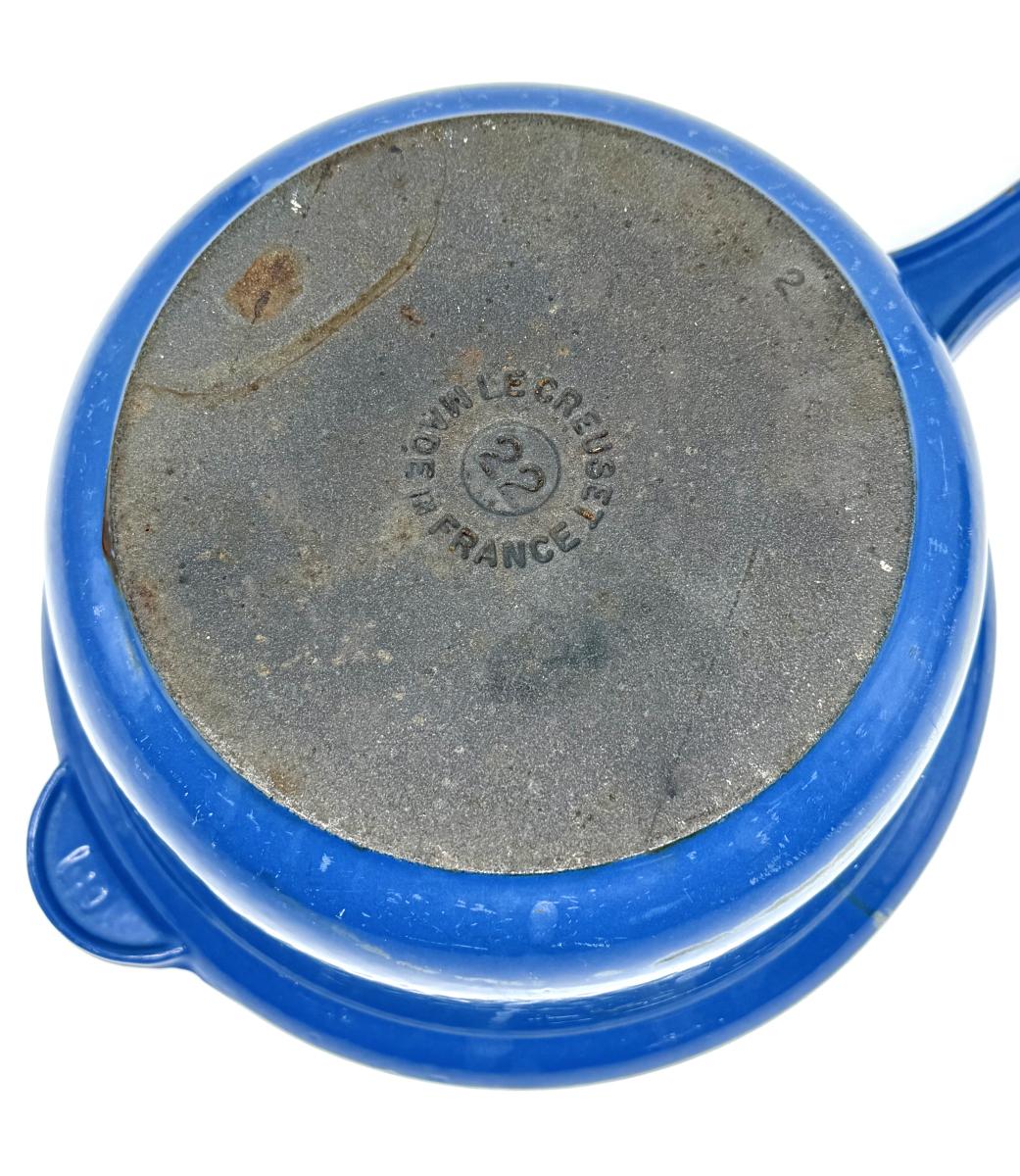 2. Small lidded Le Creuset sauce pot with the number 14 on the bottom. Has 2 brown stains inside the pot as shown. Measures 5-1/2” diameter x 2/3/4” tall.