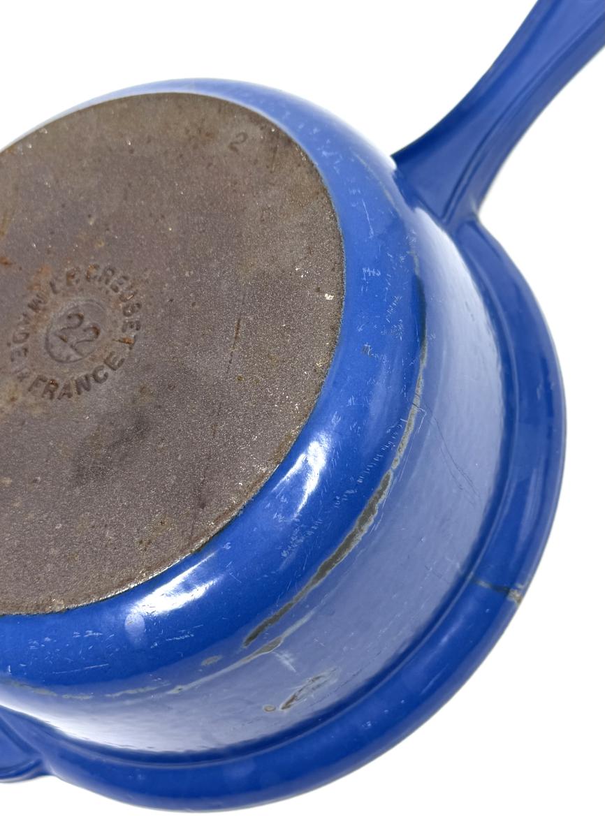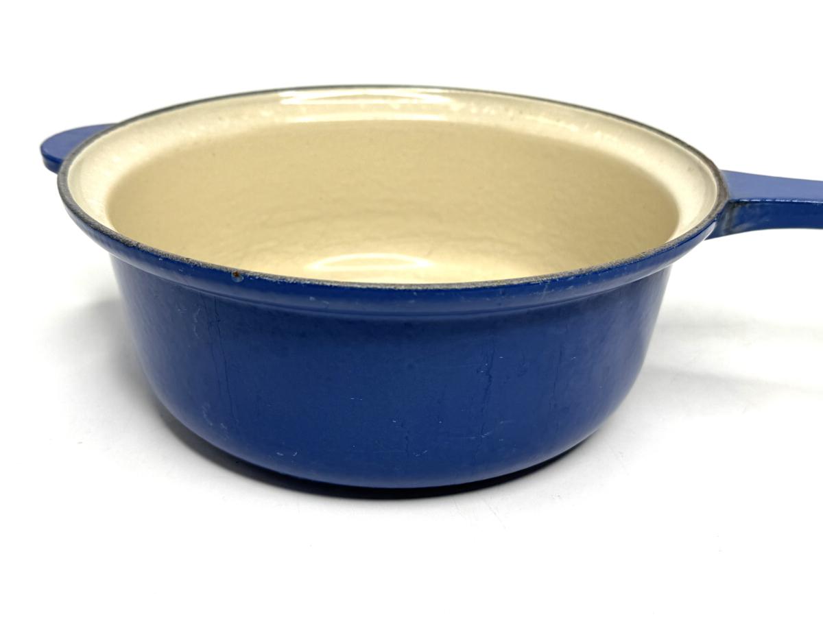 1. Le Creuset pan with the number 22 on the bottom. Measures 8-1/2” diameter x 3-1/2” tall.