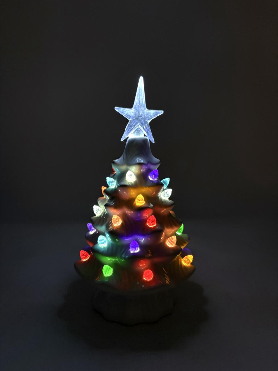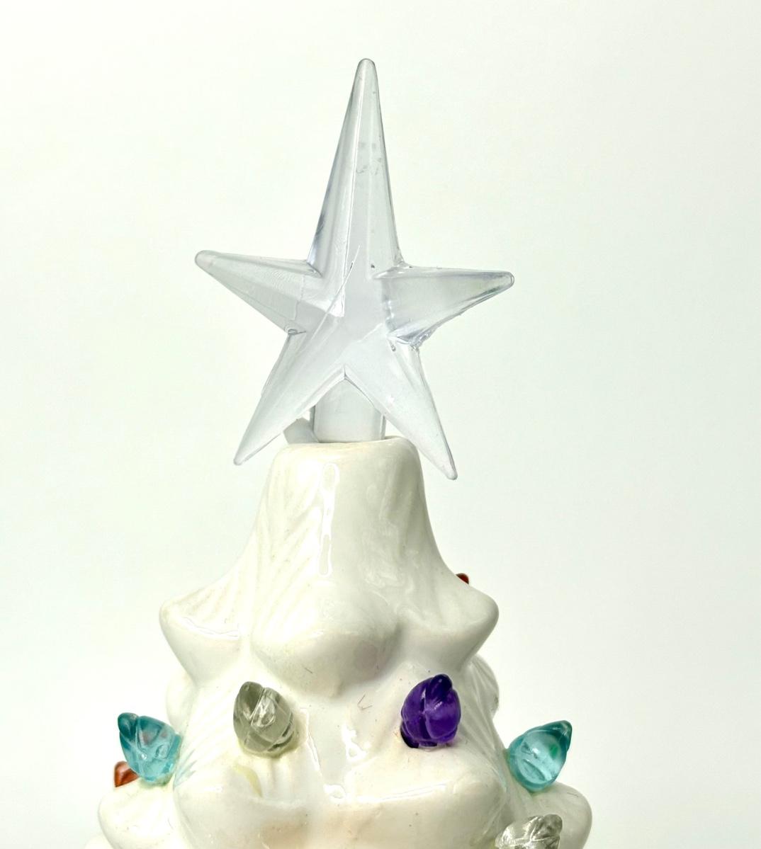 White tree is 7-1/2” tall x 4-1/2” diameter and is powered by 2 AAA batteries.