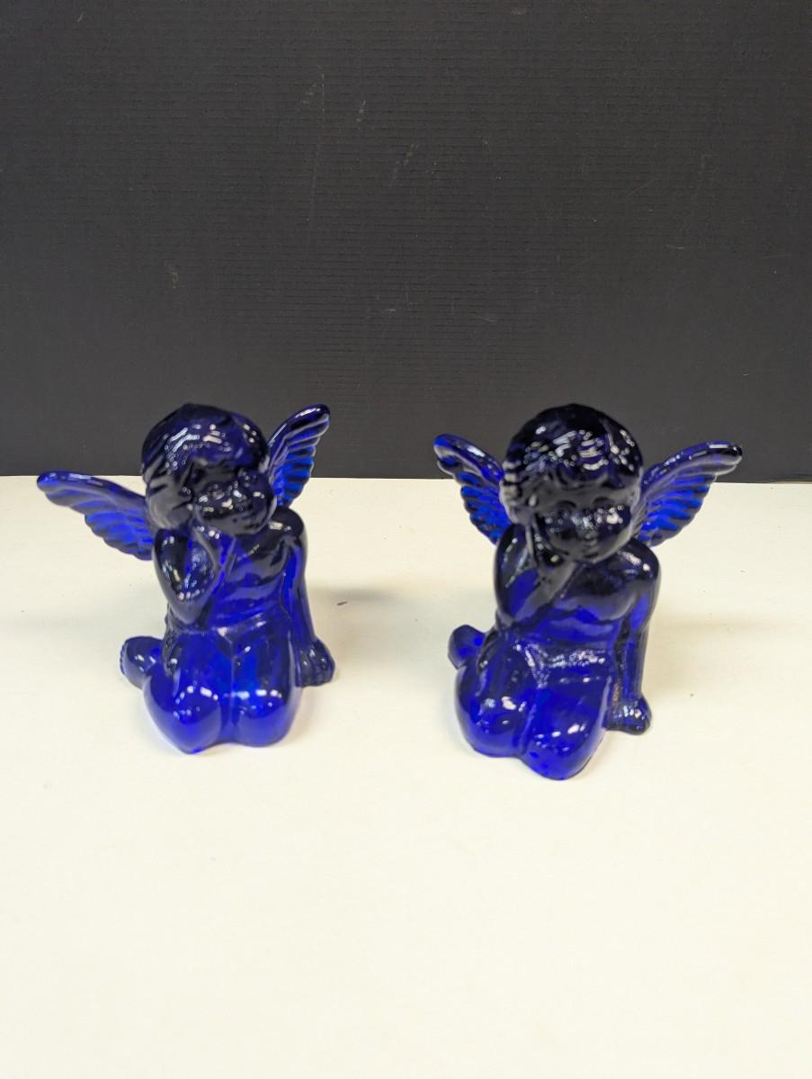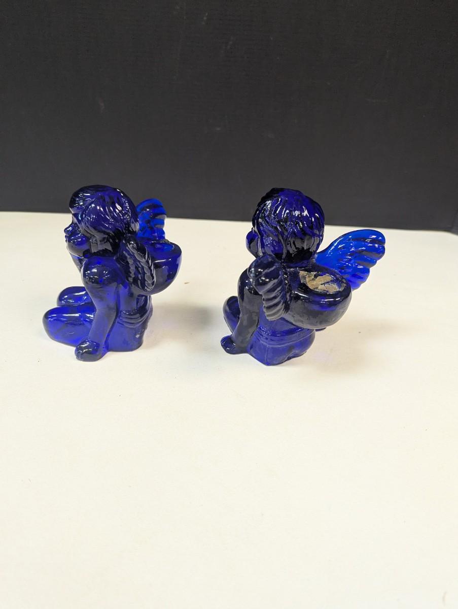 Set Of 2 Cobalt Blue Glass Sitting Angel Cherub Taper Candle Holders