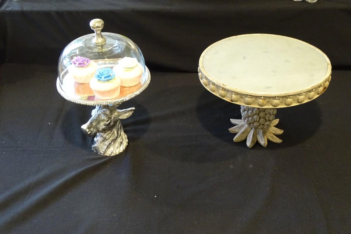 Set of Stag Head Cake Plate with Glass Dome, and Sculpted Pineapple Cake Plate Stands