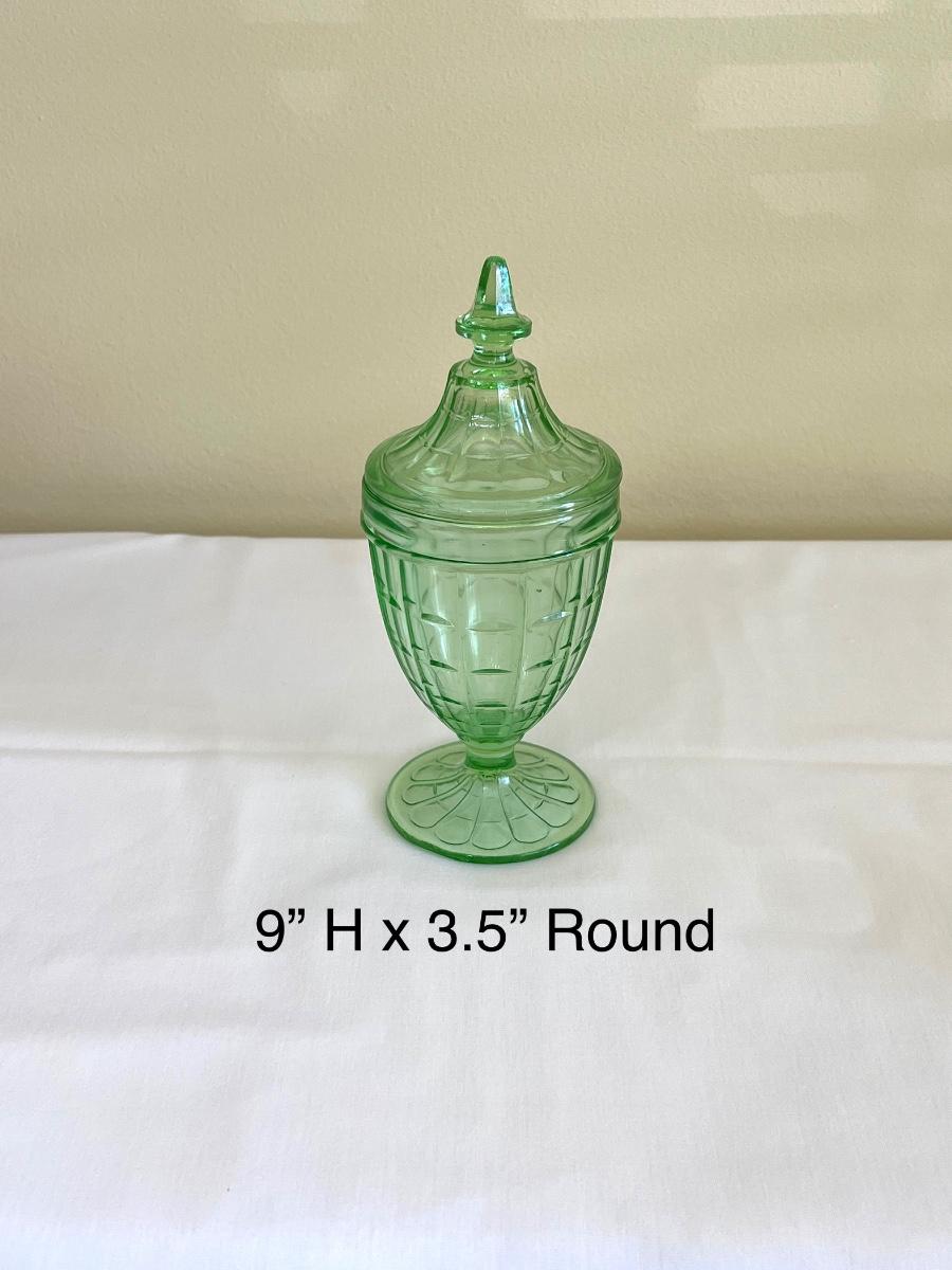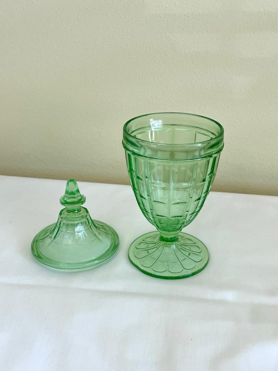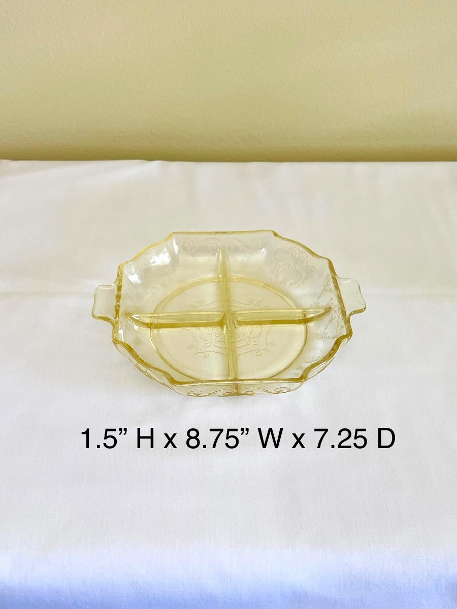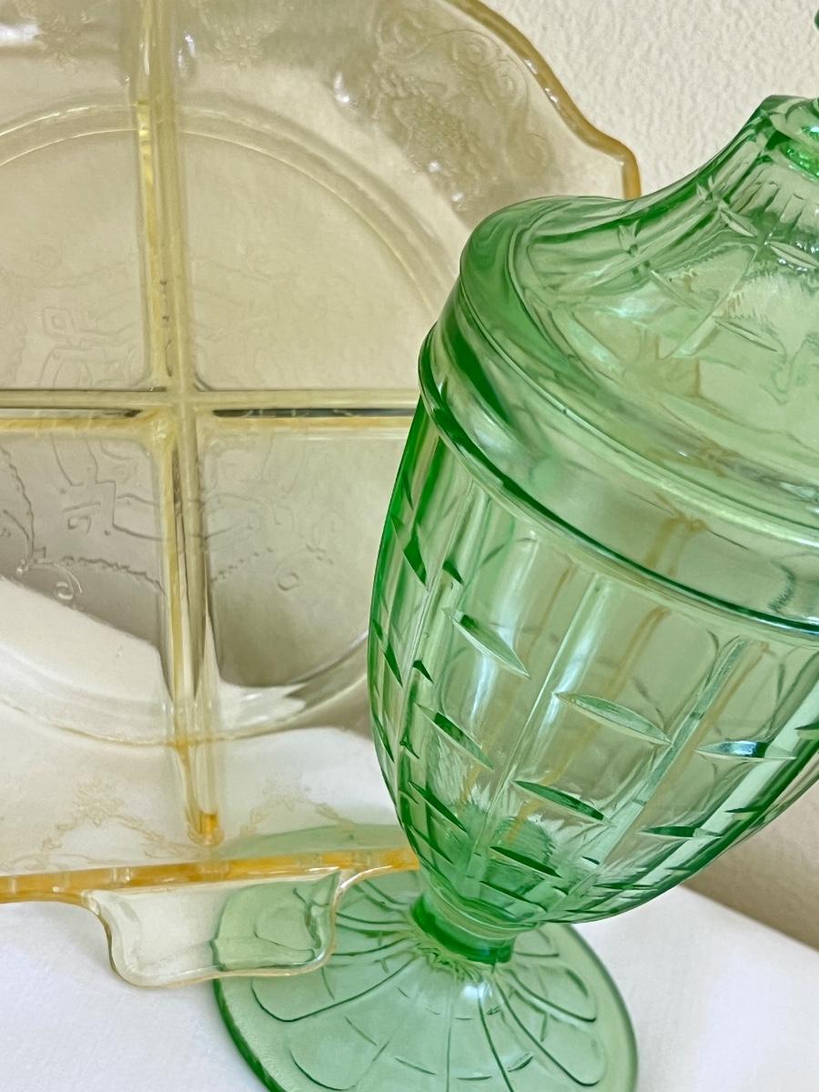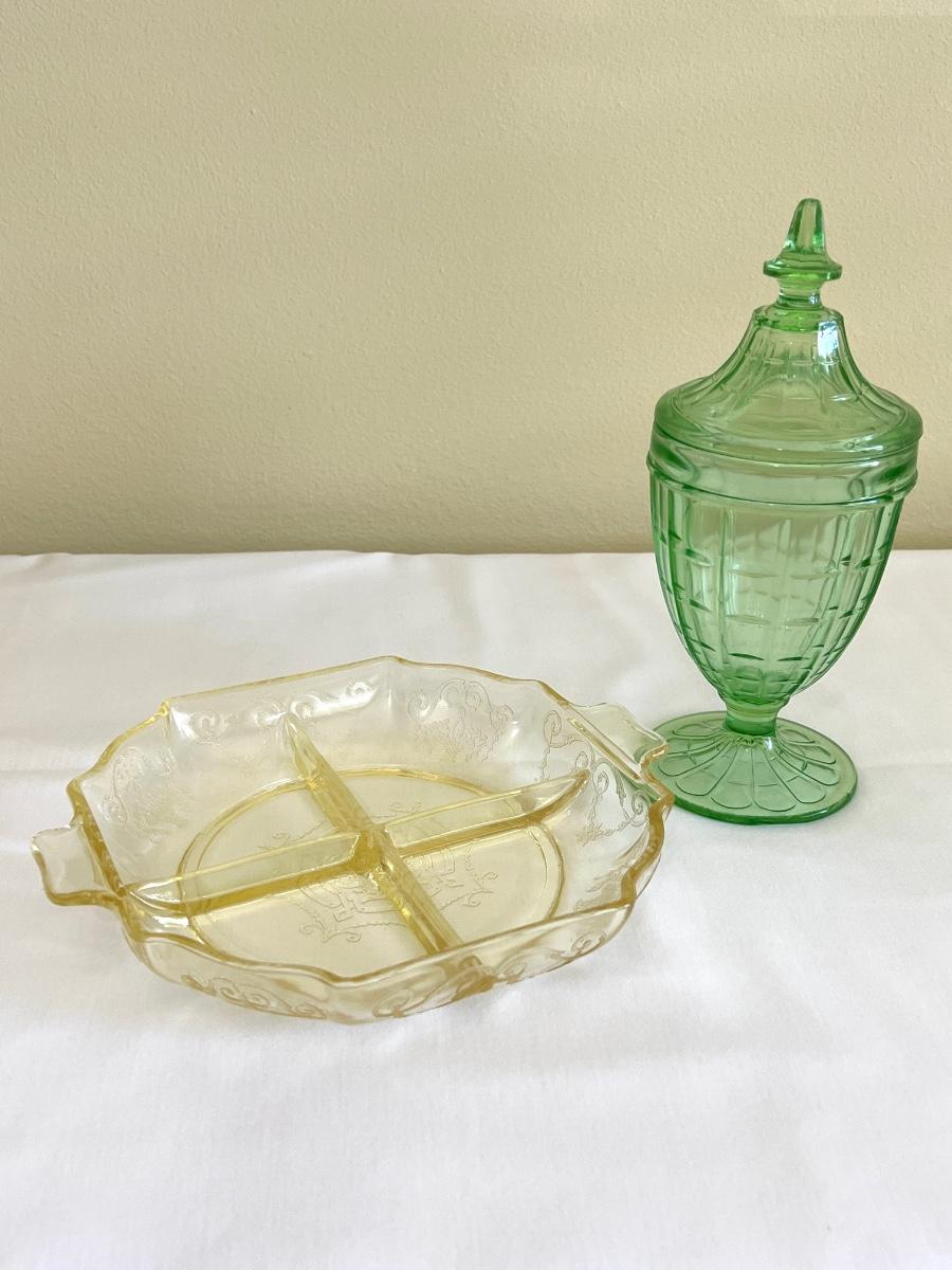 Depression Glass ~ Yellow Divided Dish & Green Lidded Dish