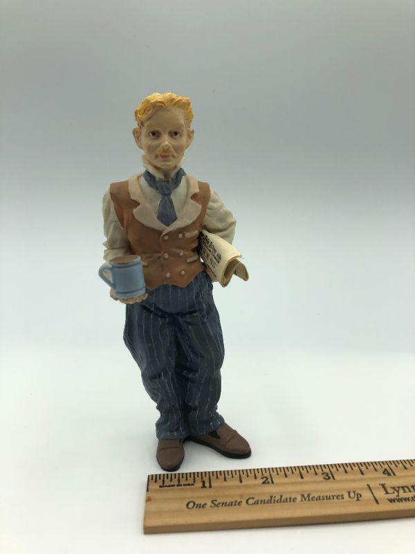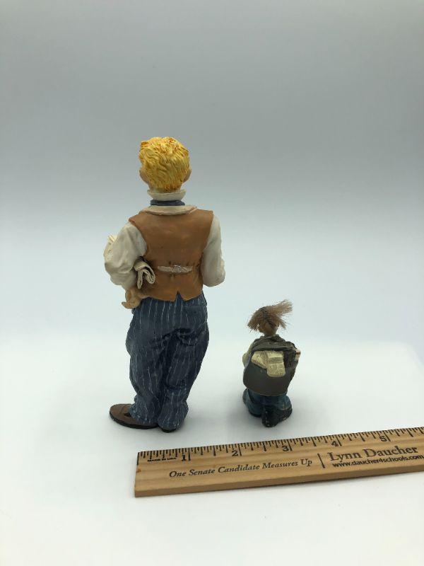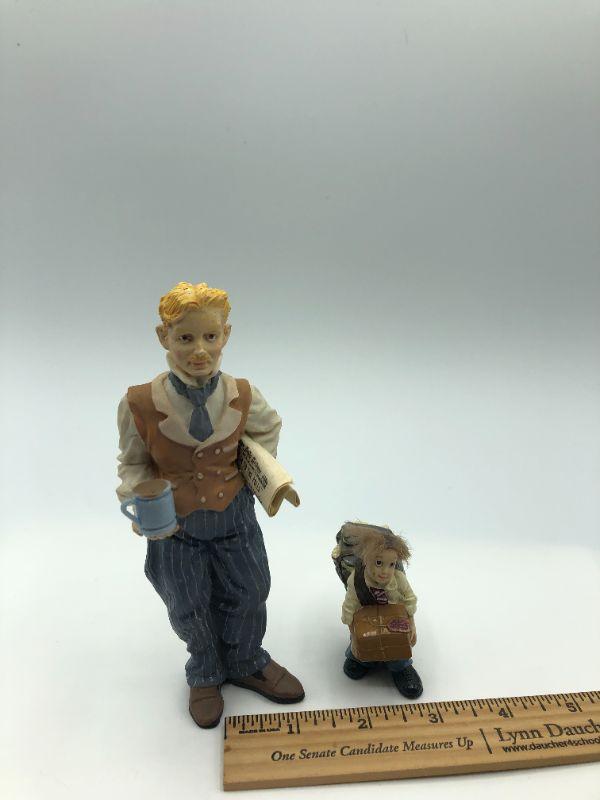 Set of 2 figurines. Dollhouse sized. The gentleman holding the newspaper is 6" tall. The smaller child/man with package is 2.5" tall. Both are painted hard plastic.