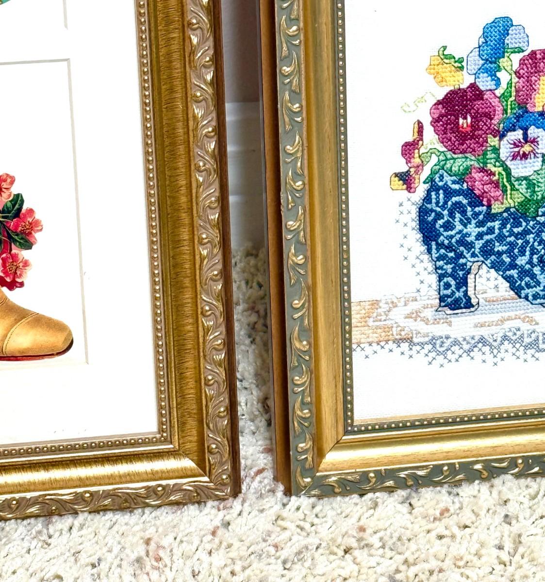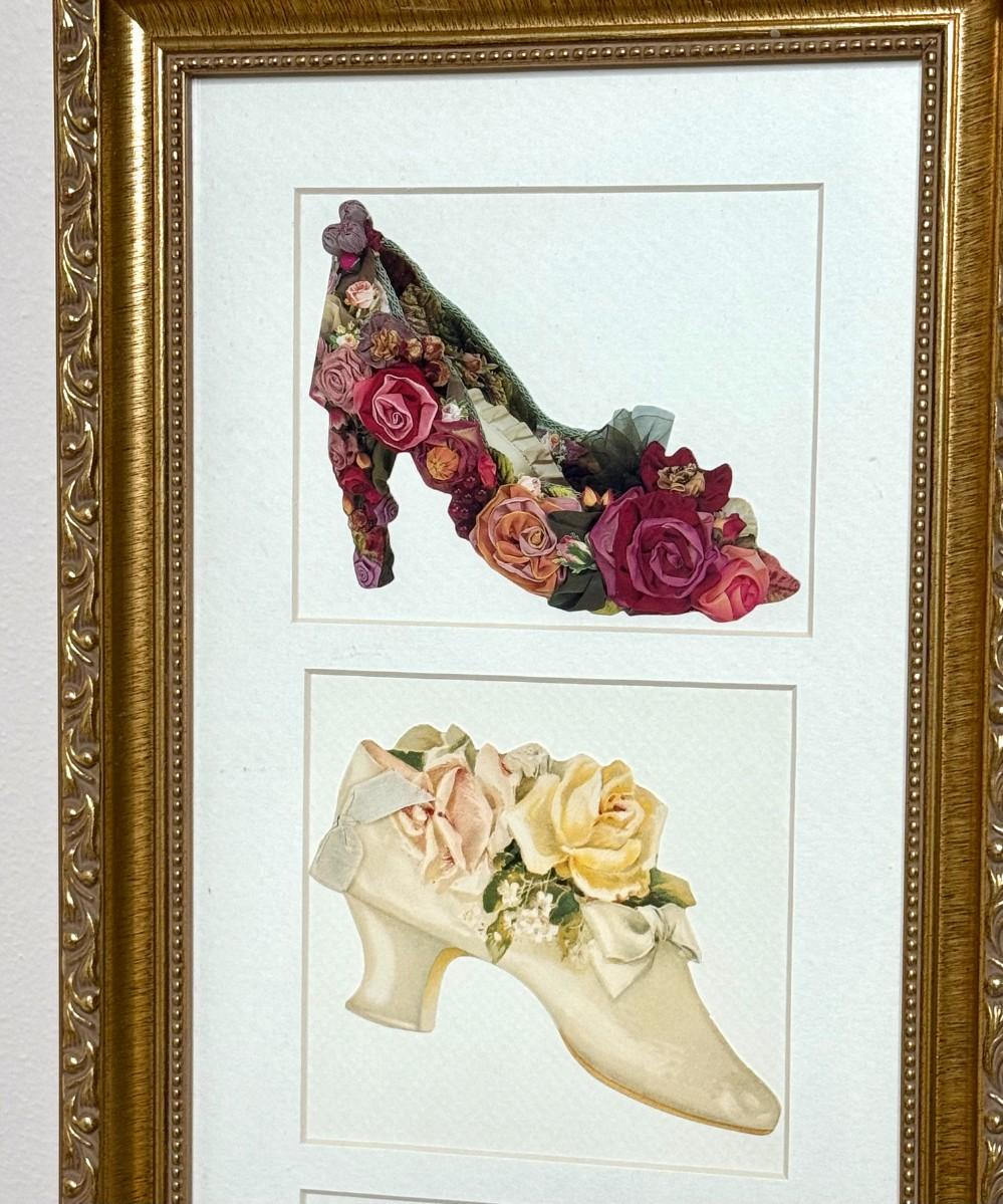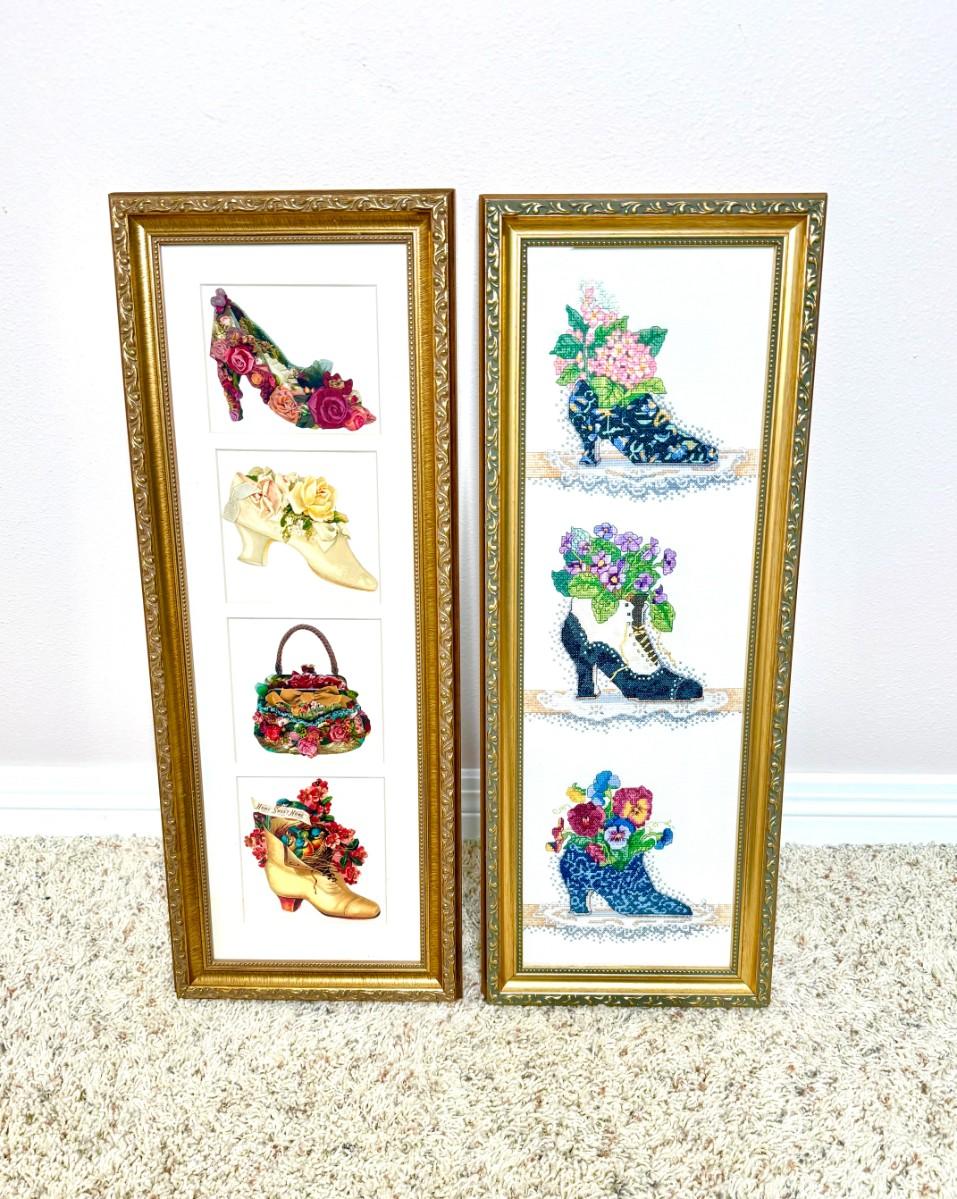 Set of 2 Gold Framed Victorian Shoe Pictures - Needlepoint and Prints