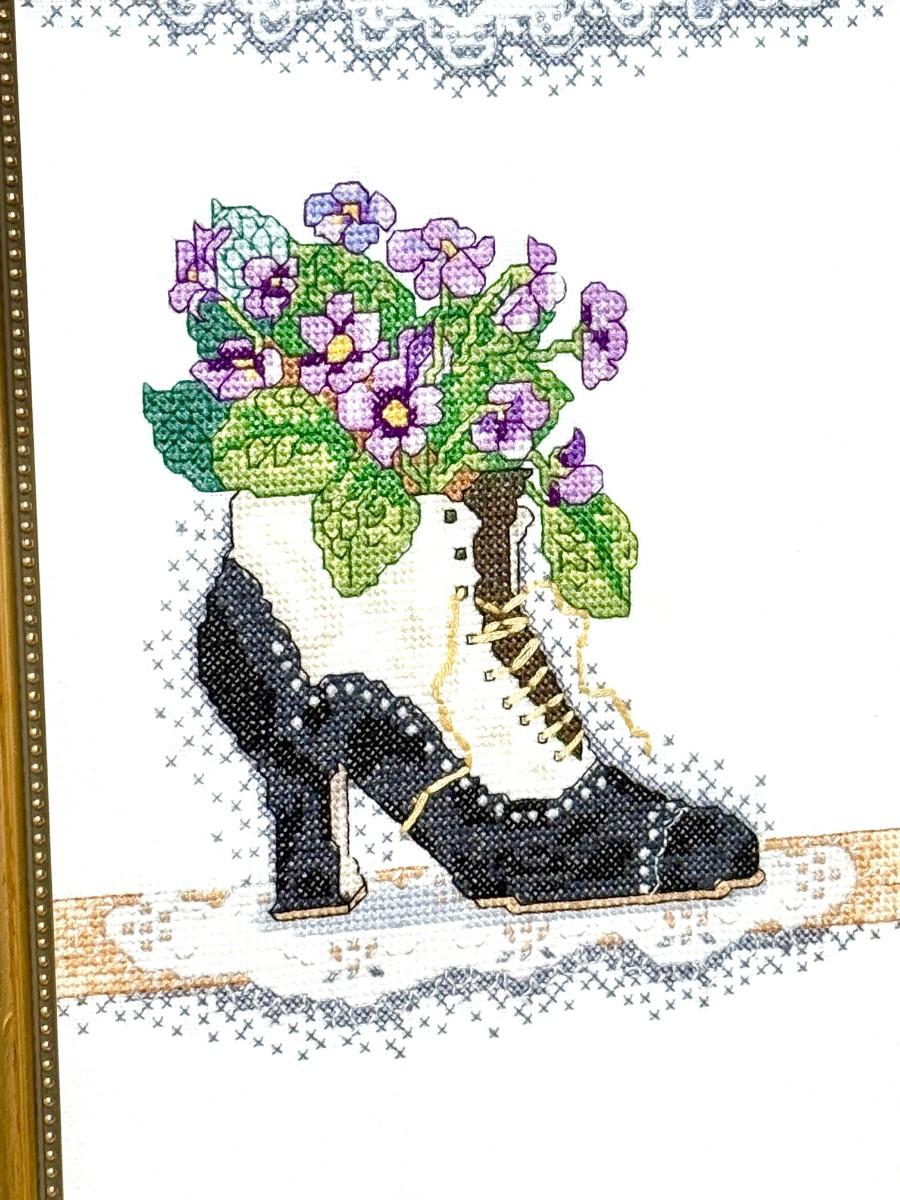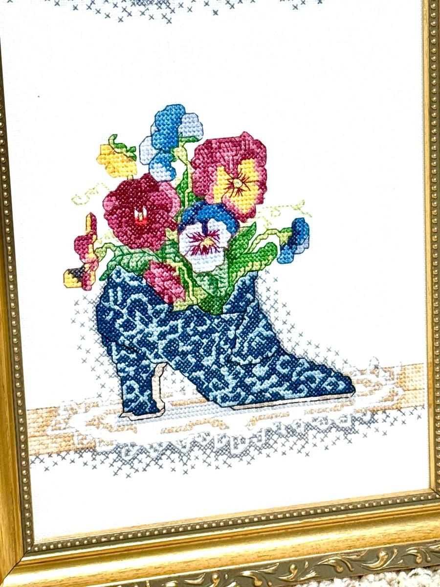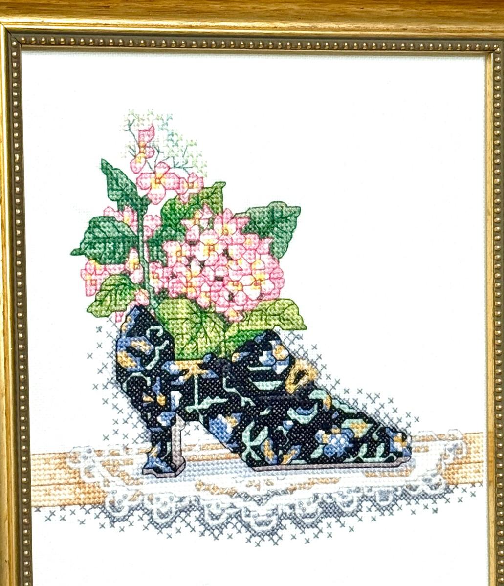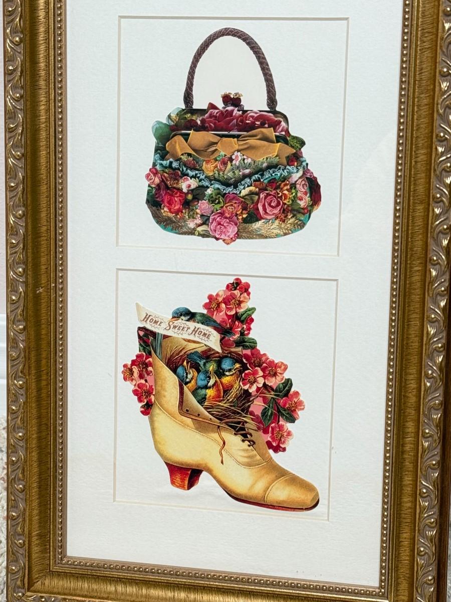 Set of 2 Gold Framed Victorian Shoe Pictures - Needlepoint and Prints