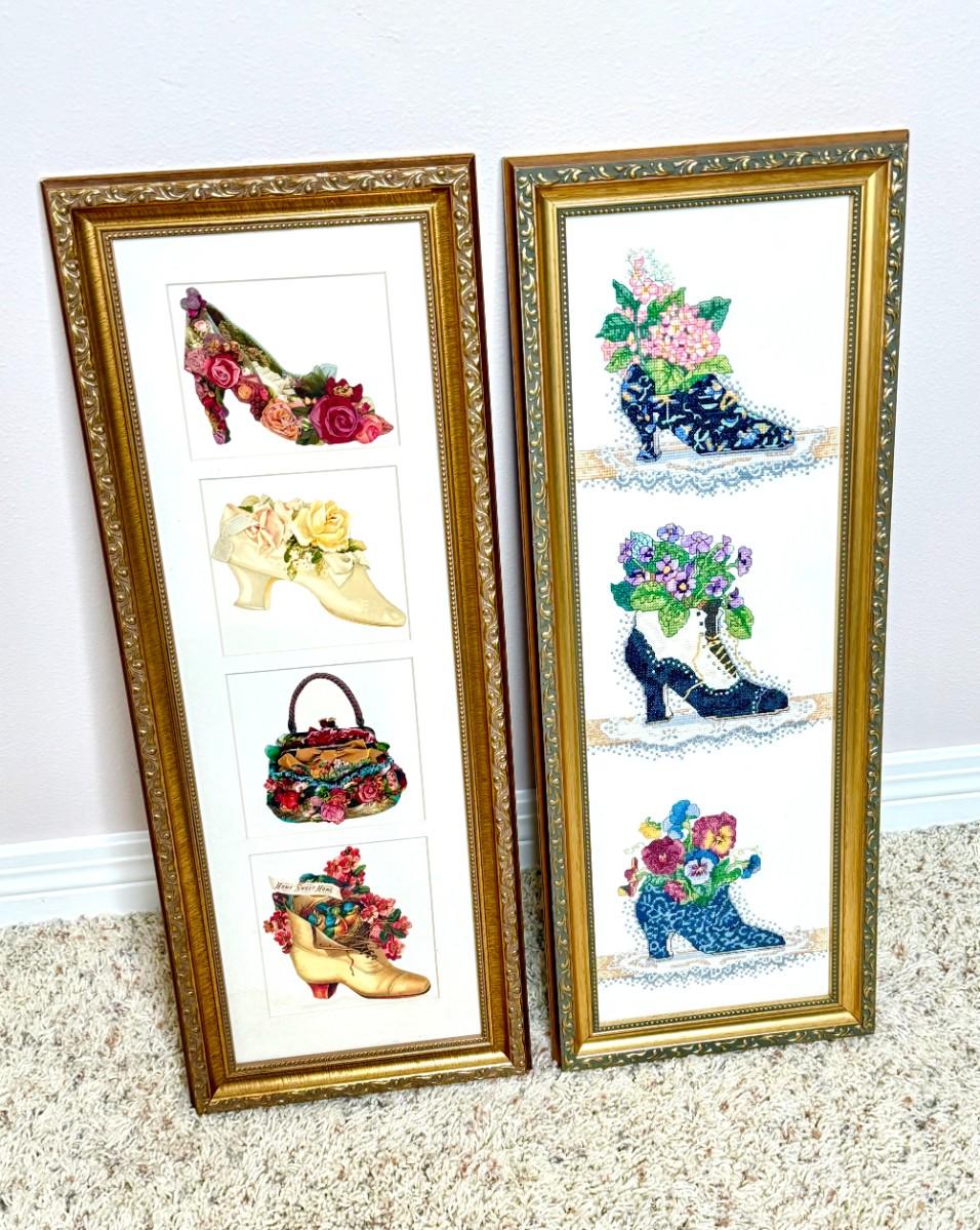 The one on the right has 3 shoes that are needlepoint. The one on the left has 4 Victorian prints.