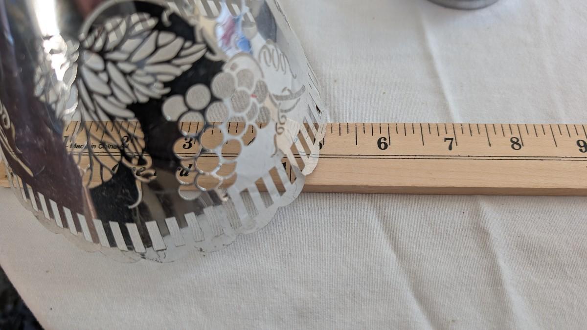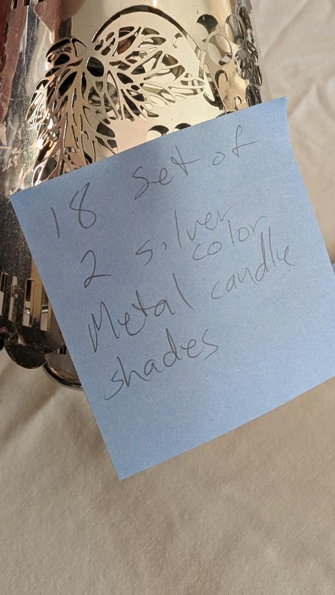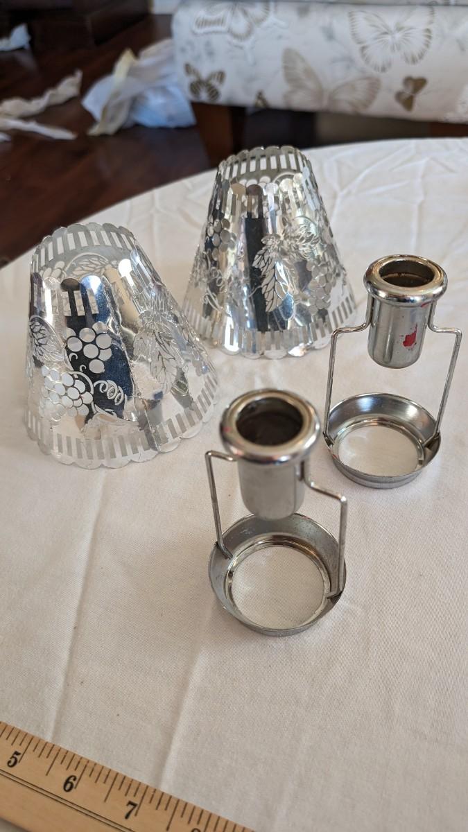 This is a nice set of two grapes and leaves decorated candle shades in a silver-colored metal.