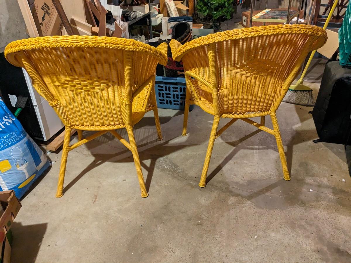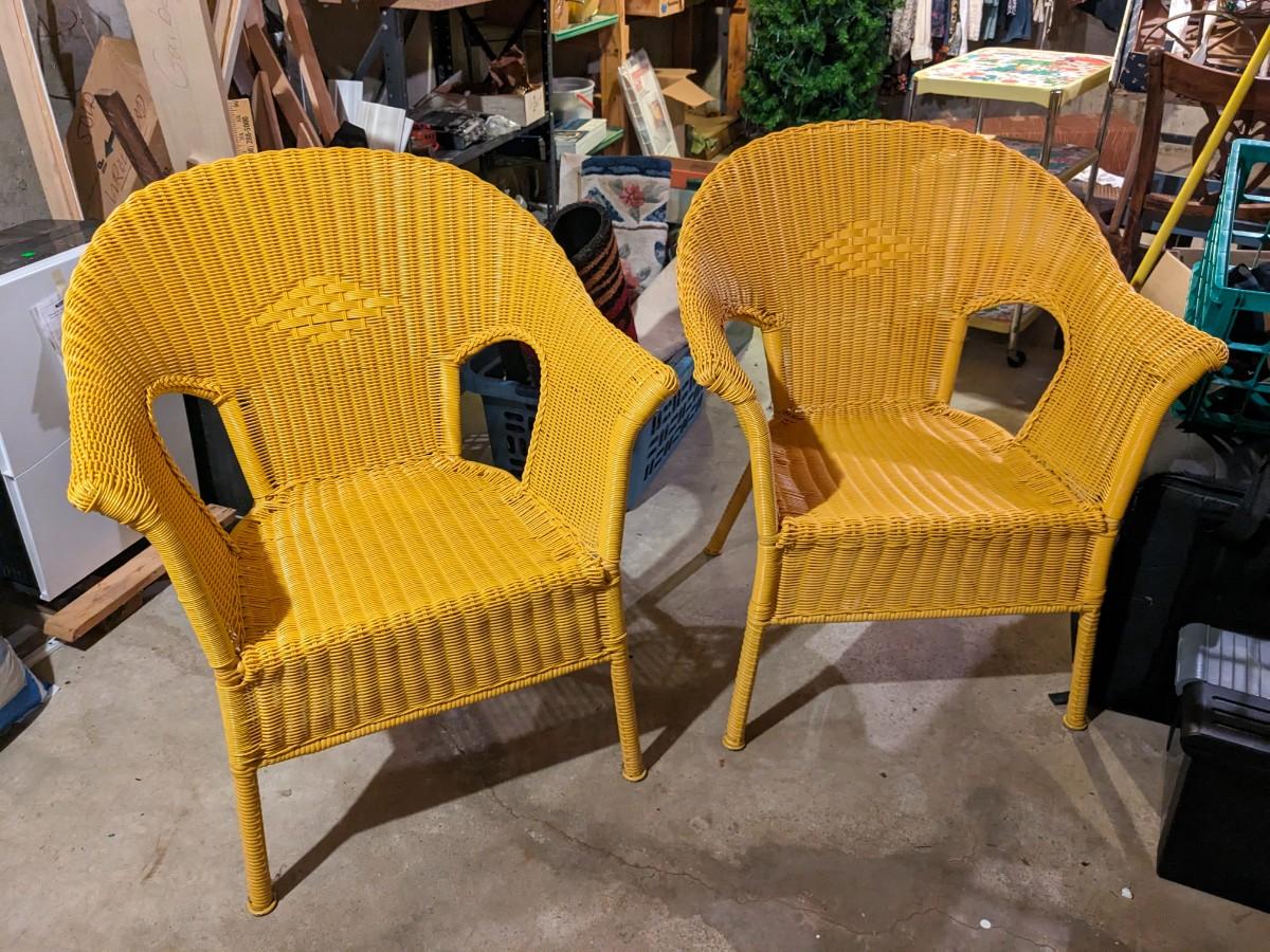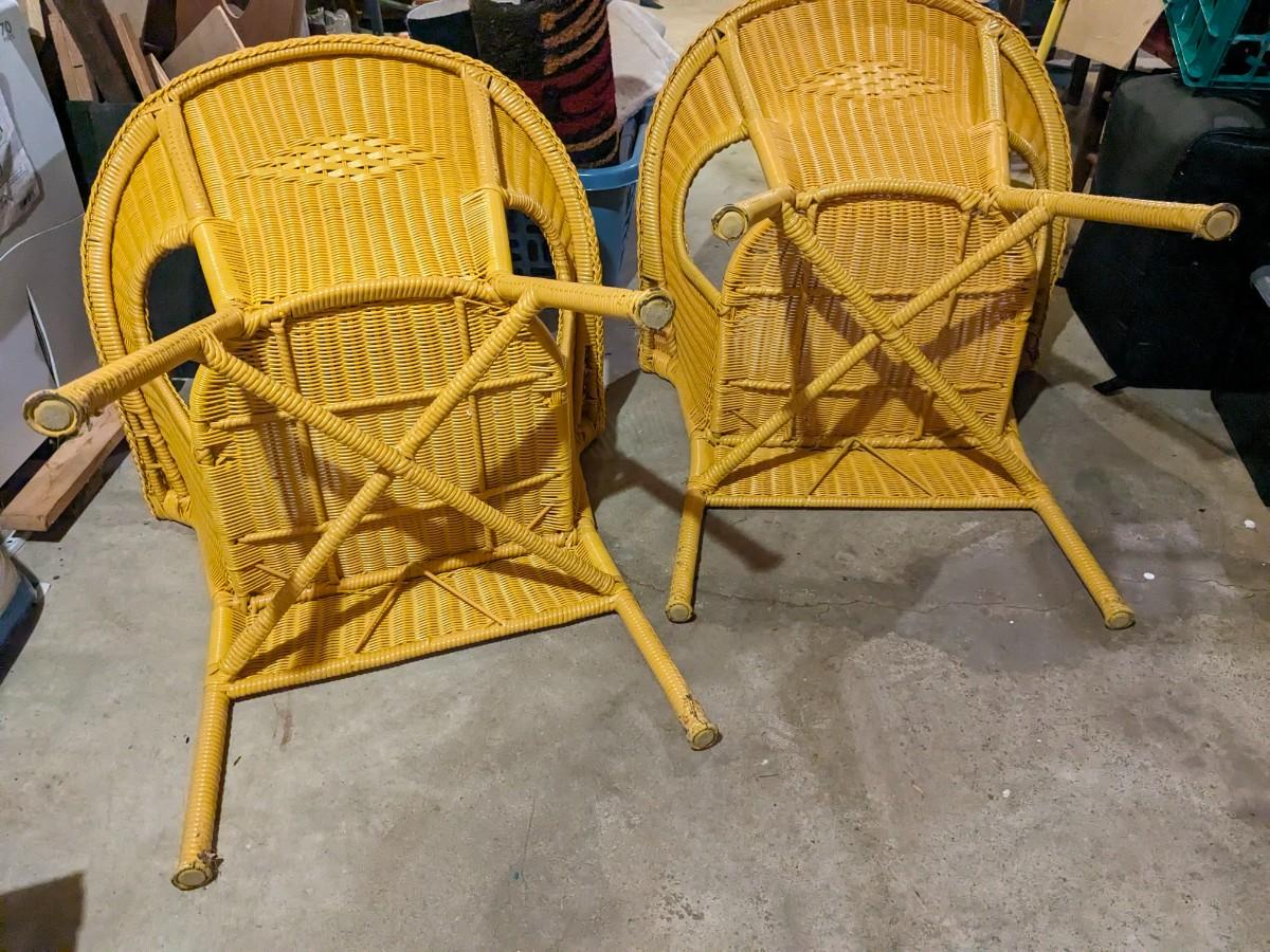 Set of 2 lIke New Plastic Wicker Metal Framing Chairs