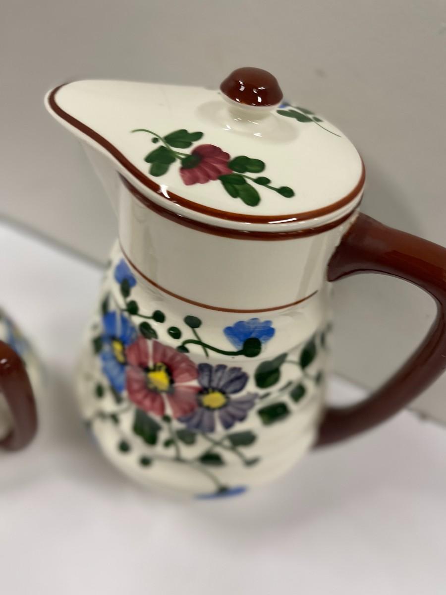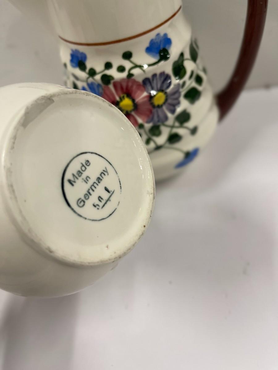 Set of 2 matching hand painted ceramic pitchers with lids. One is 8 1/2" and the other is 5 1/2". Made in Germany
