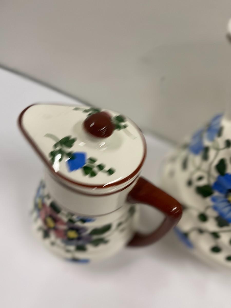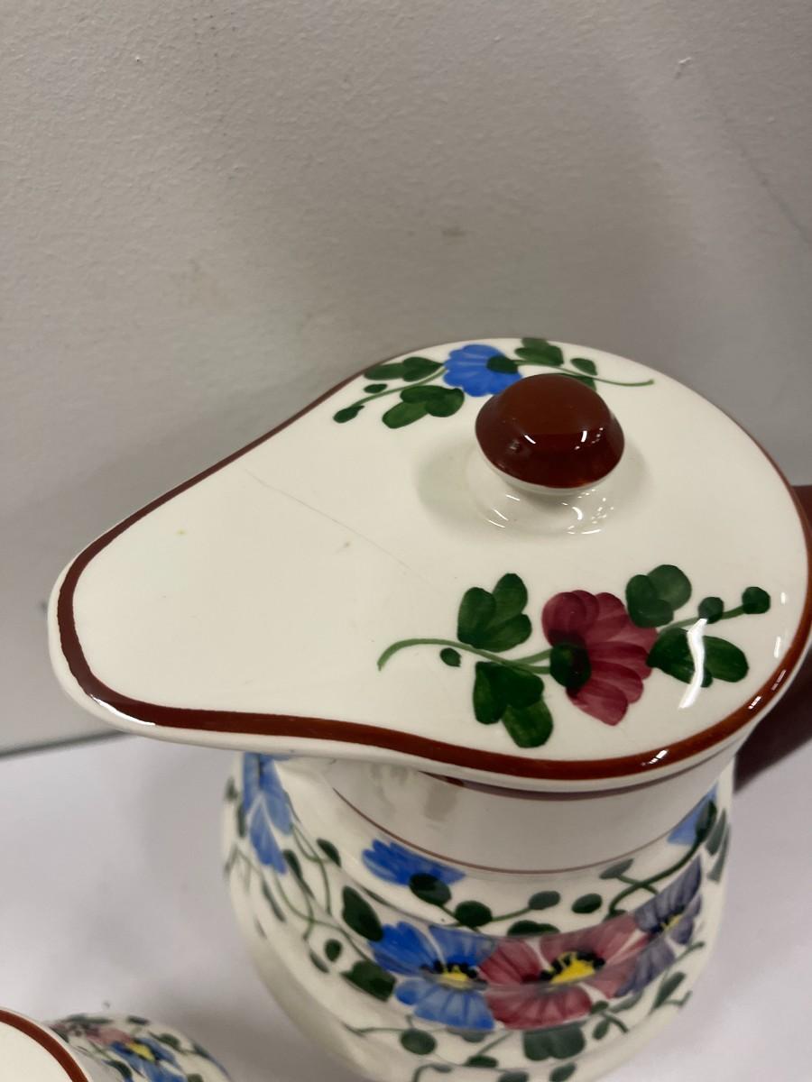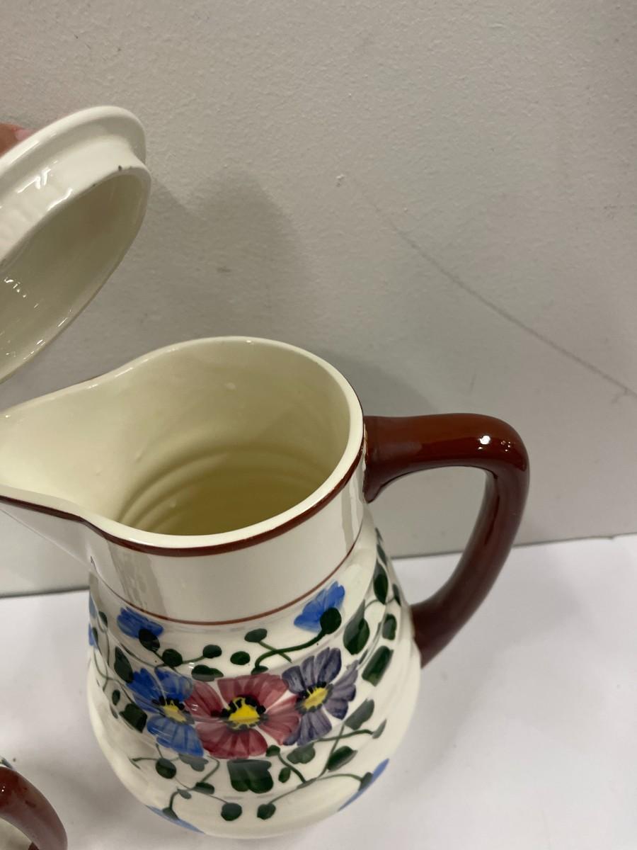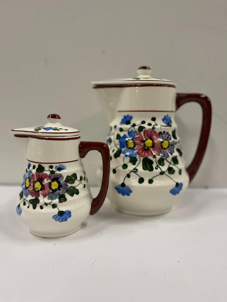 Set of 2 matching hand painted ceramic pitchers with lids. One is 8 1/2" and the other is 5 1/2". Made in Germany