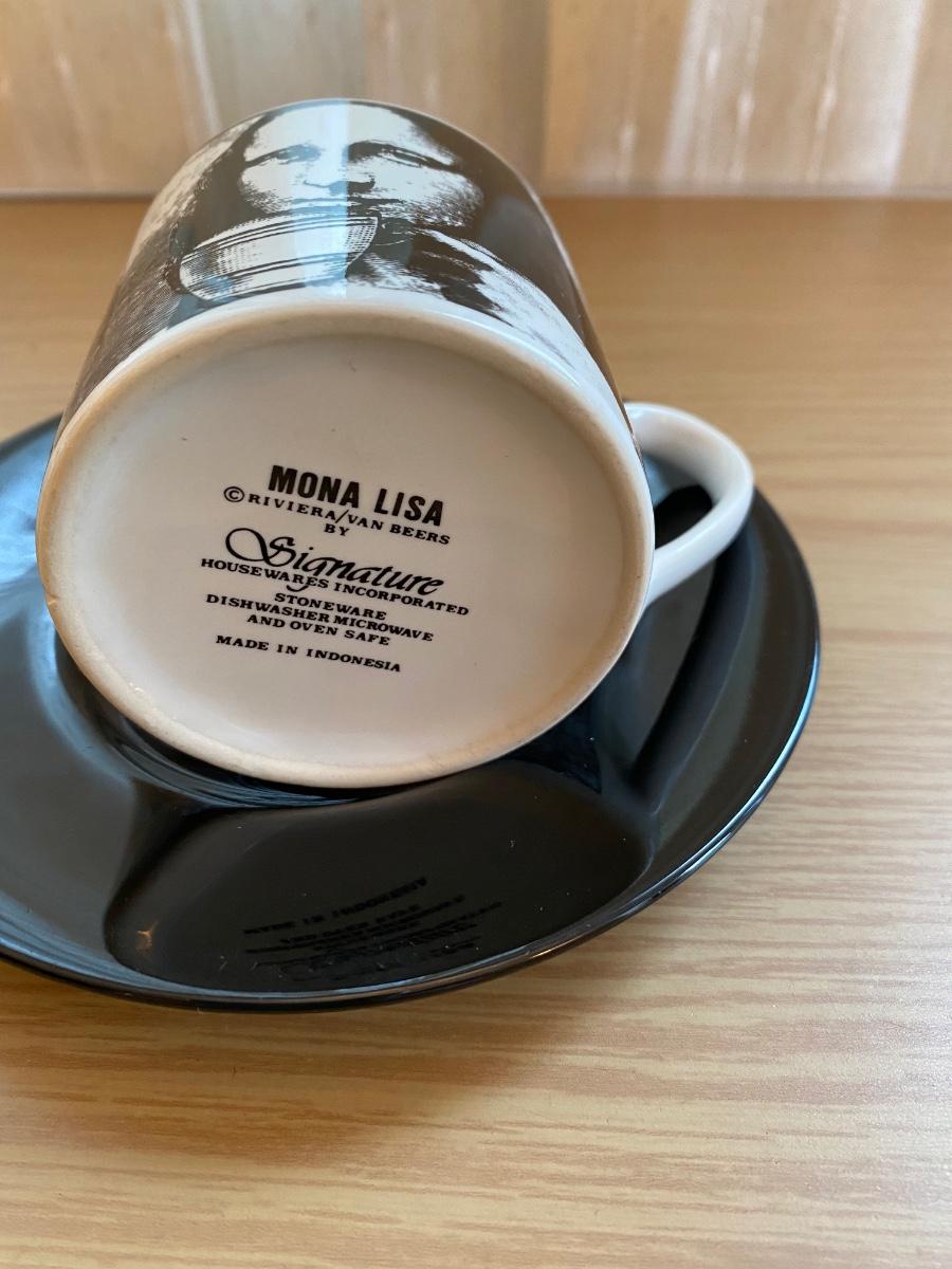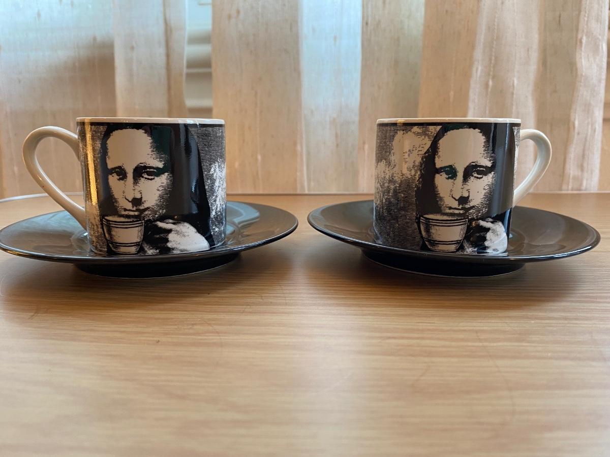 Set of 2 “Mona Lisa” stoneware cups & saucers, demitasse
