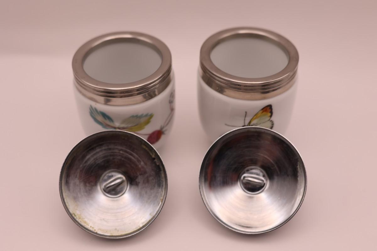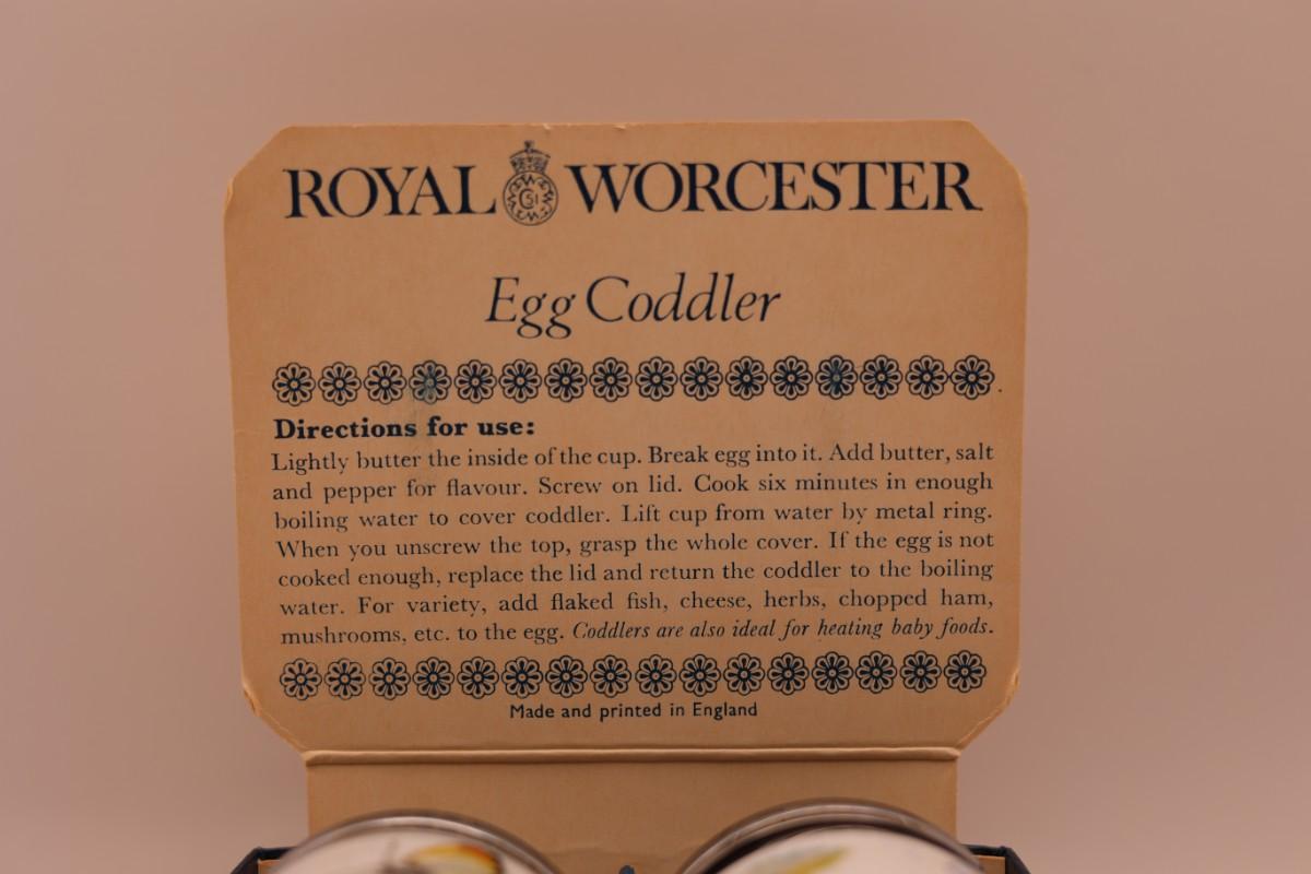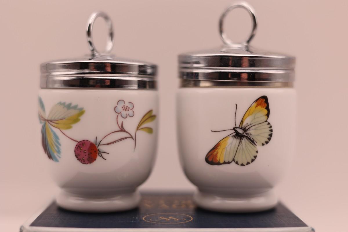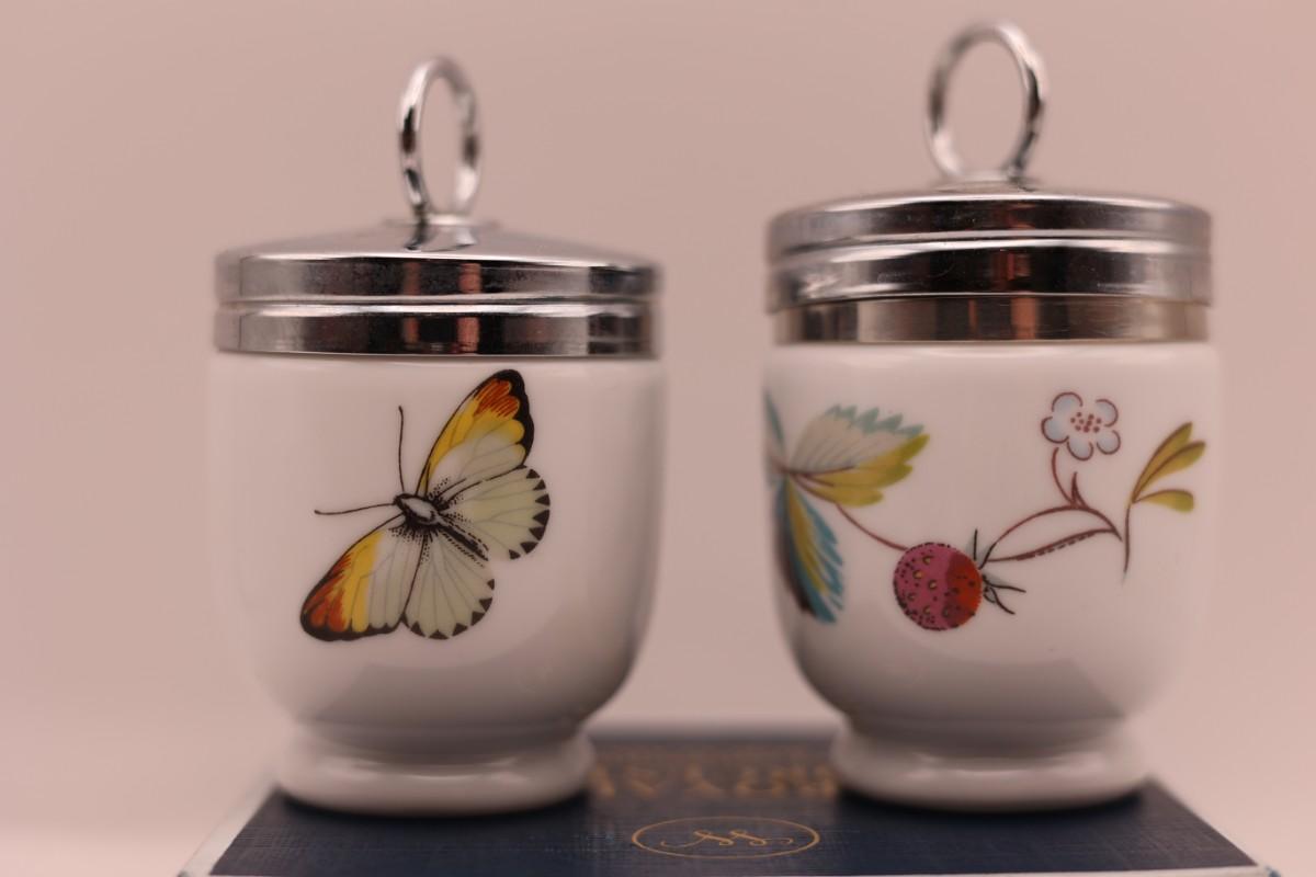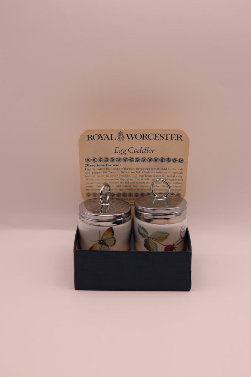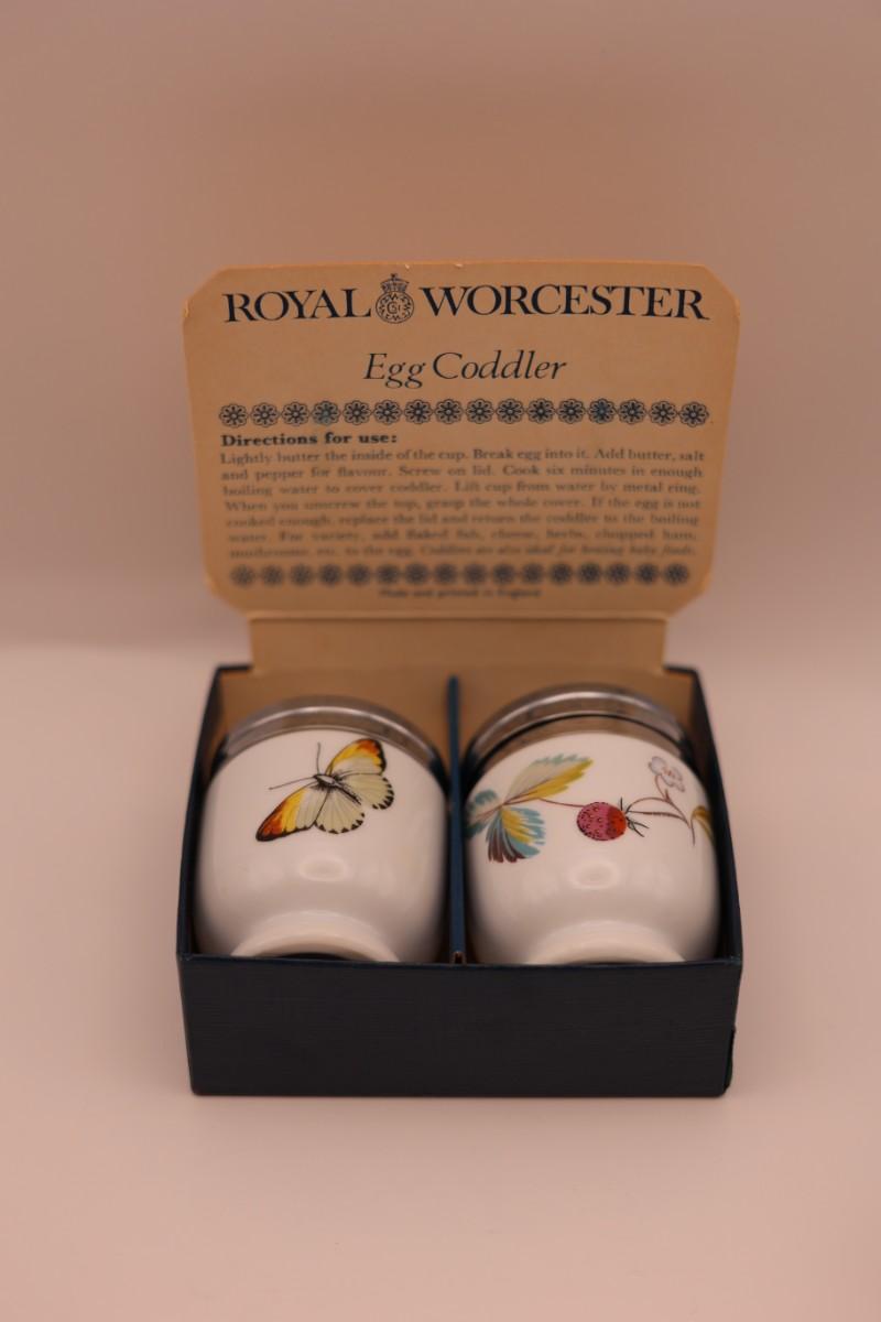 Set of two Royal Worcester porcelain egg coddlers with metal screw lids, including original box and instructions. Floral and butterfly designs.