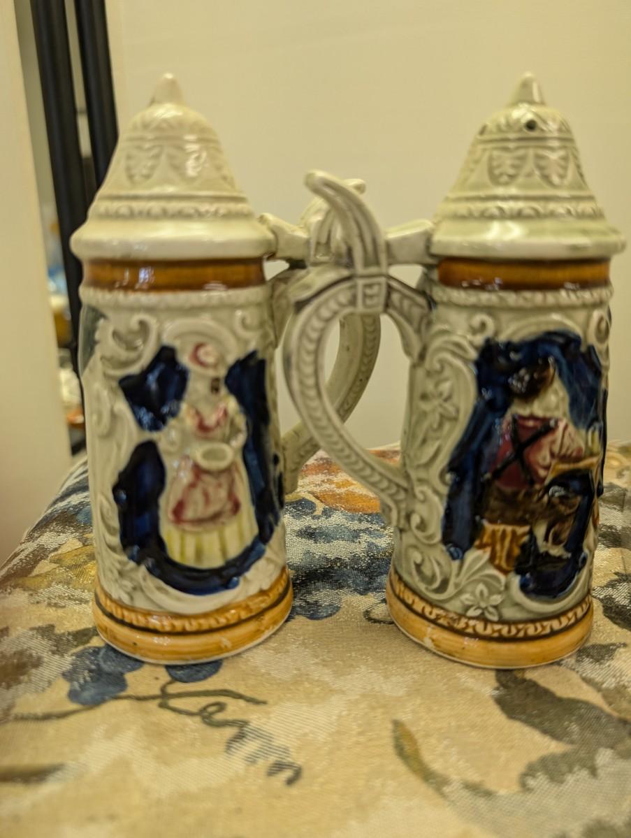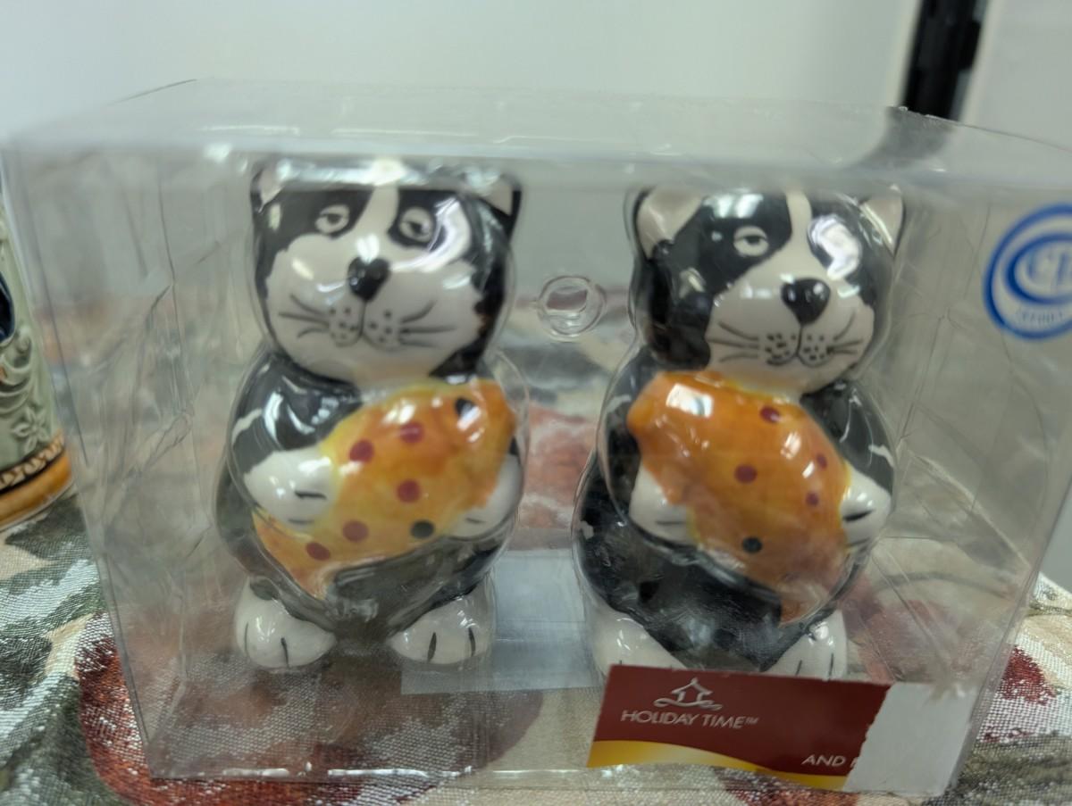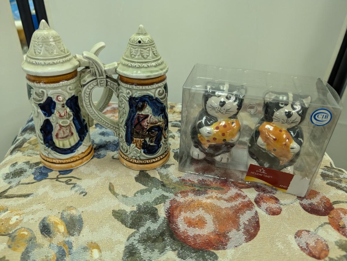 Miniature beer stein shakes and NIB black and white cat salt shakers.