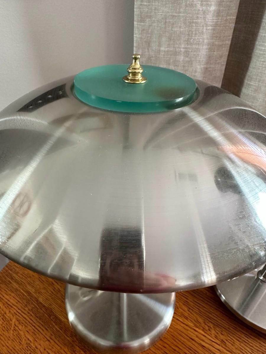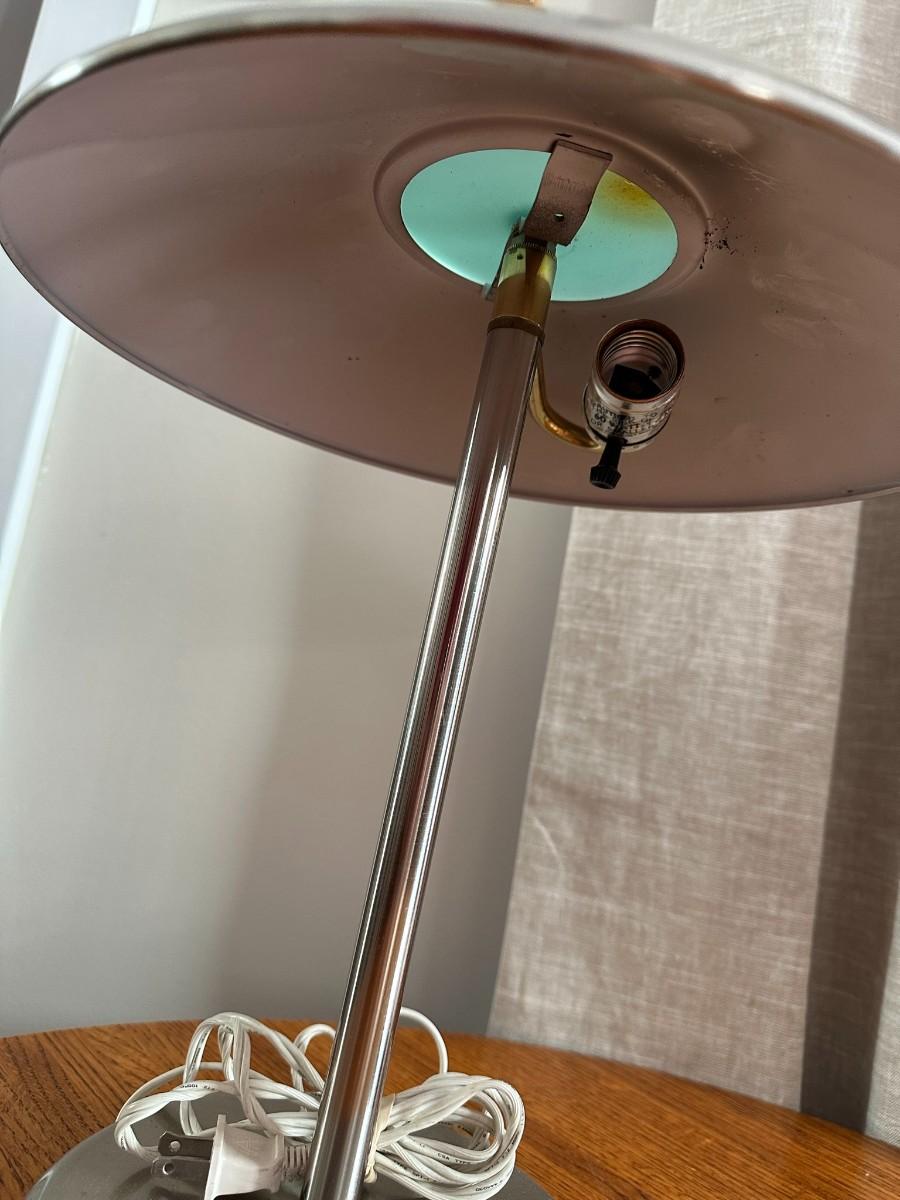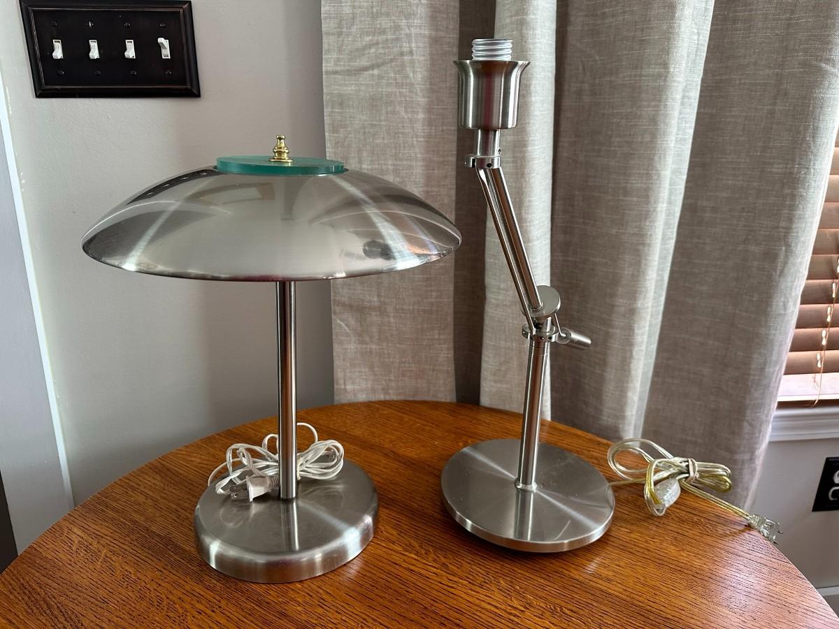Silver-tone metal lamp with metal dome shape measures 15" with finial. Additional metal lamp has adjustable arm and measures 20.5" at full height w/o bulb or shade.