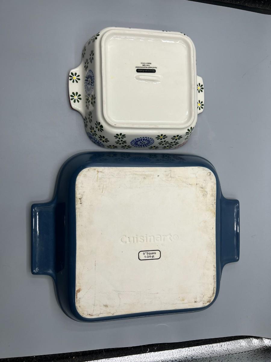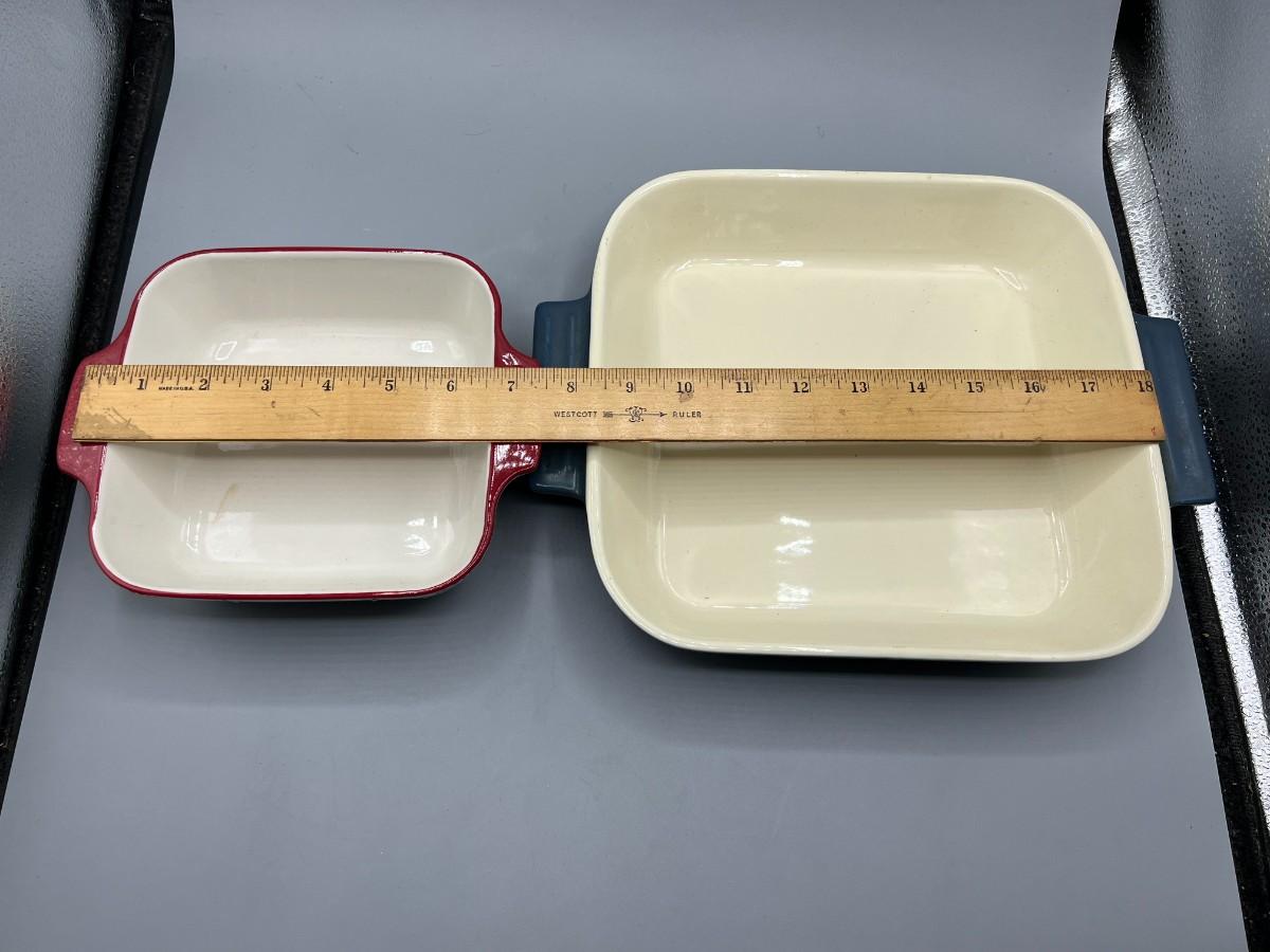 Set of 2 casserole dishes. Square shape with handles. In good condition. One about 7" and the other about 10".