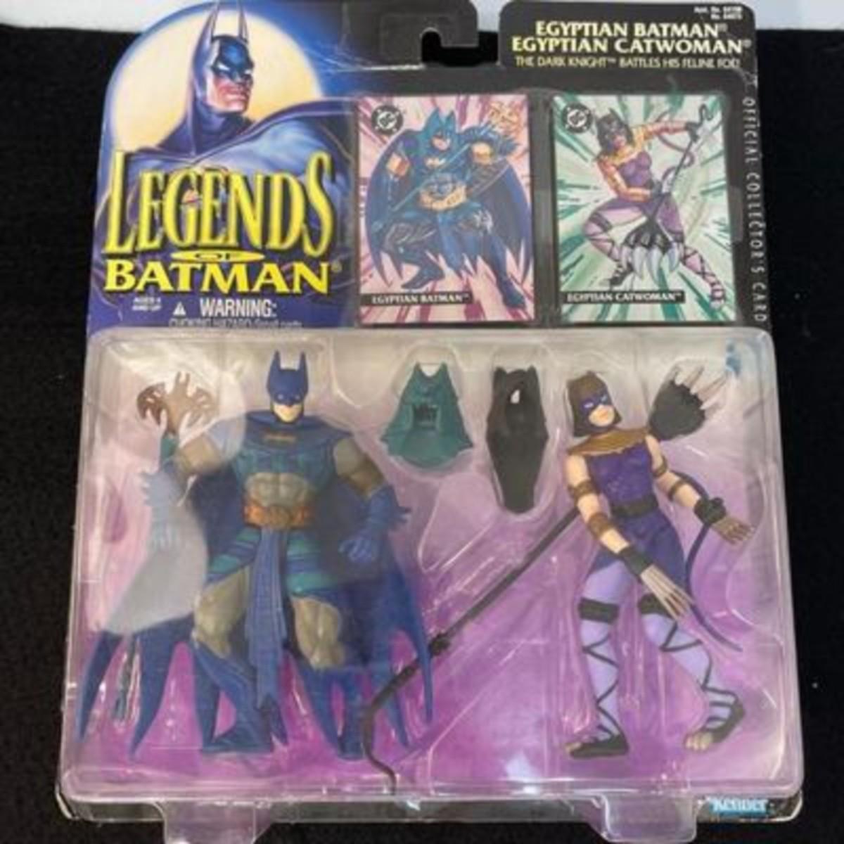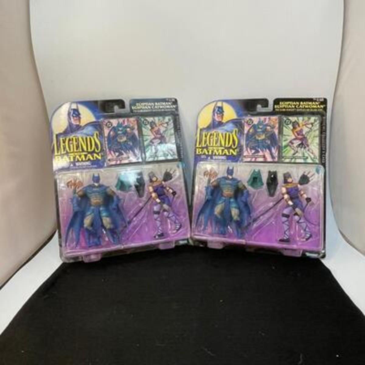 Set of 2 Unopened Legends of Batman Egyptian Batman & Catwoman Action Figures. Unopened packages. Some wear to the cardboard edges.