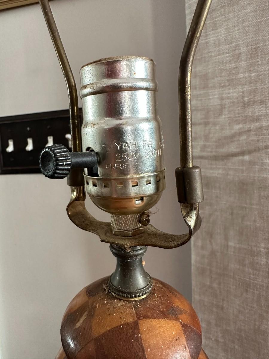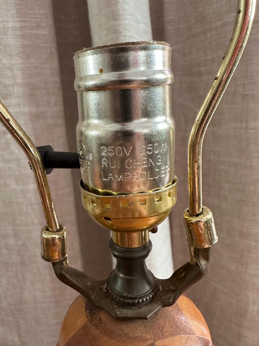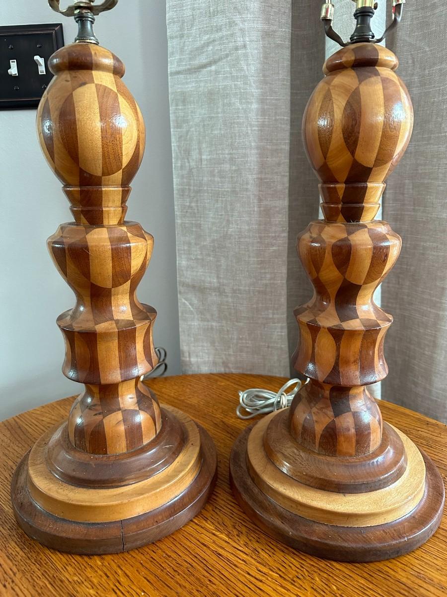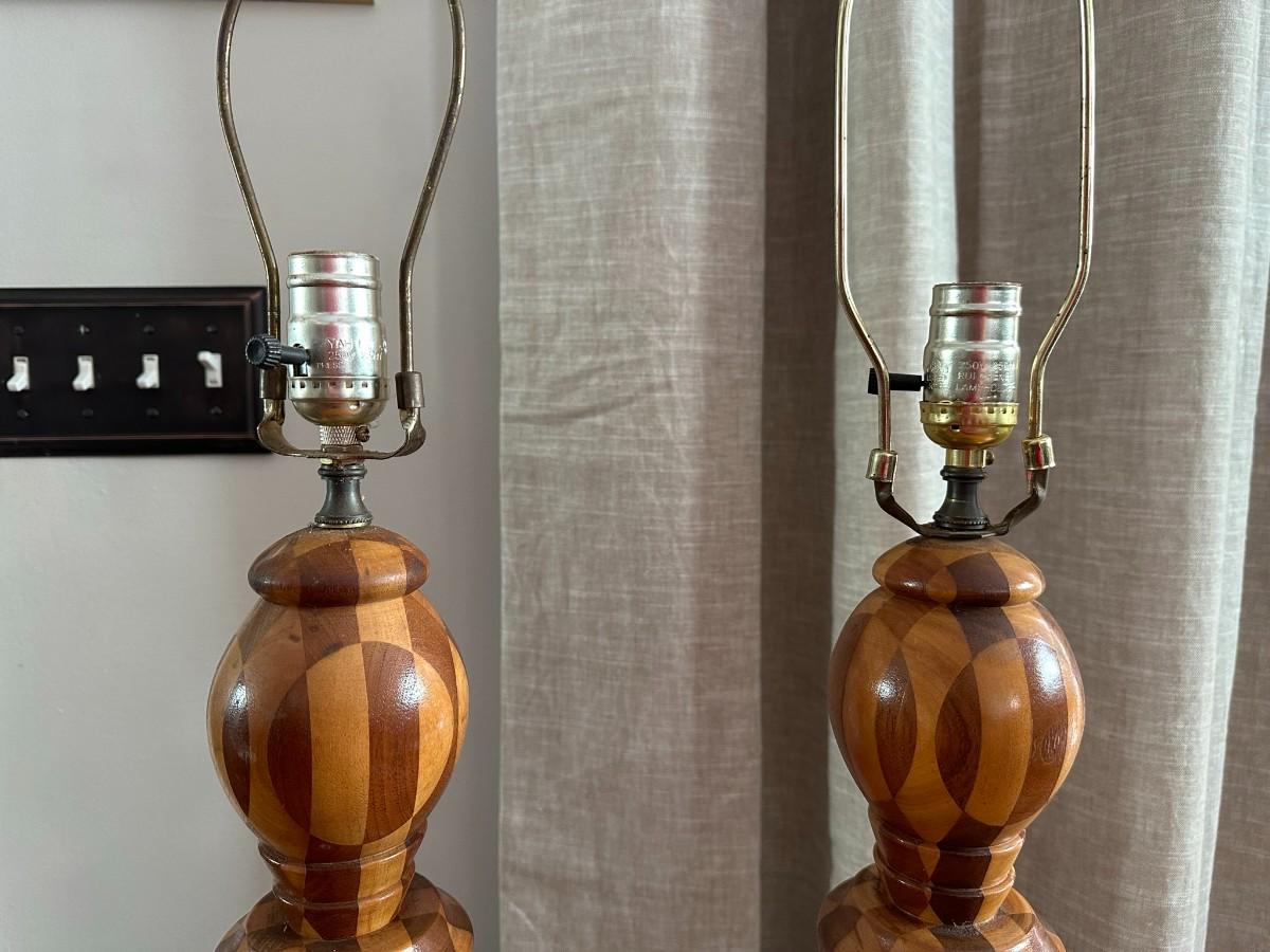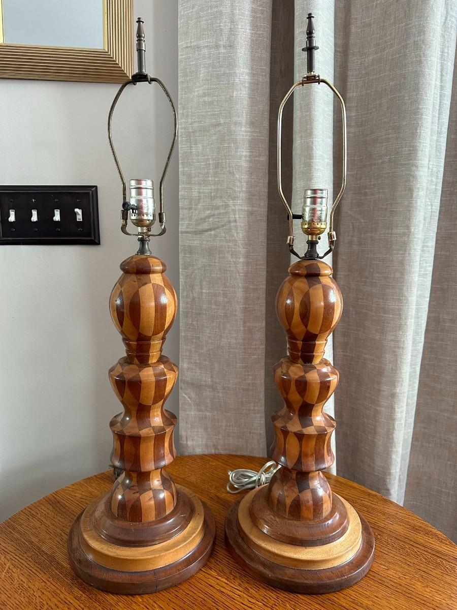 2 wood lamps with two-tone design. 21" without harp, includes finials.
