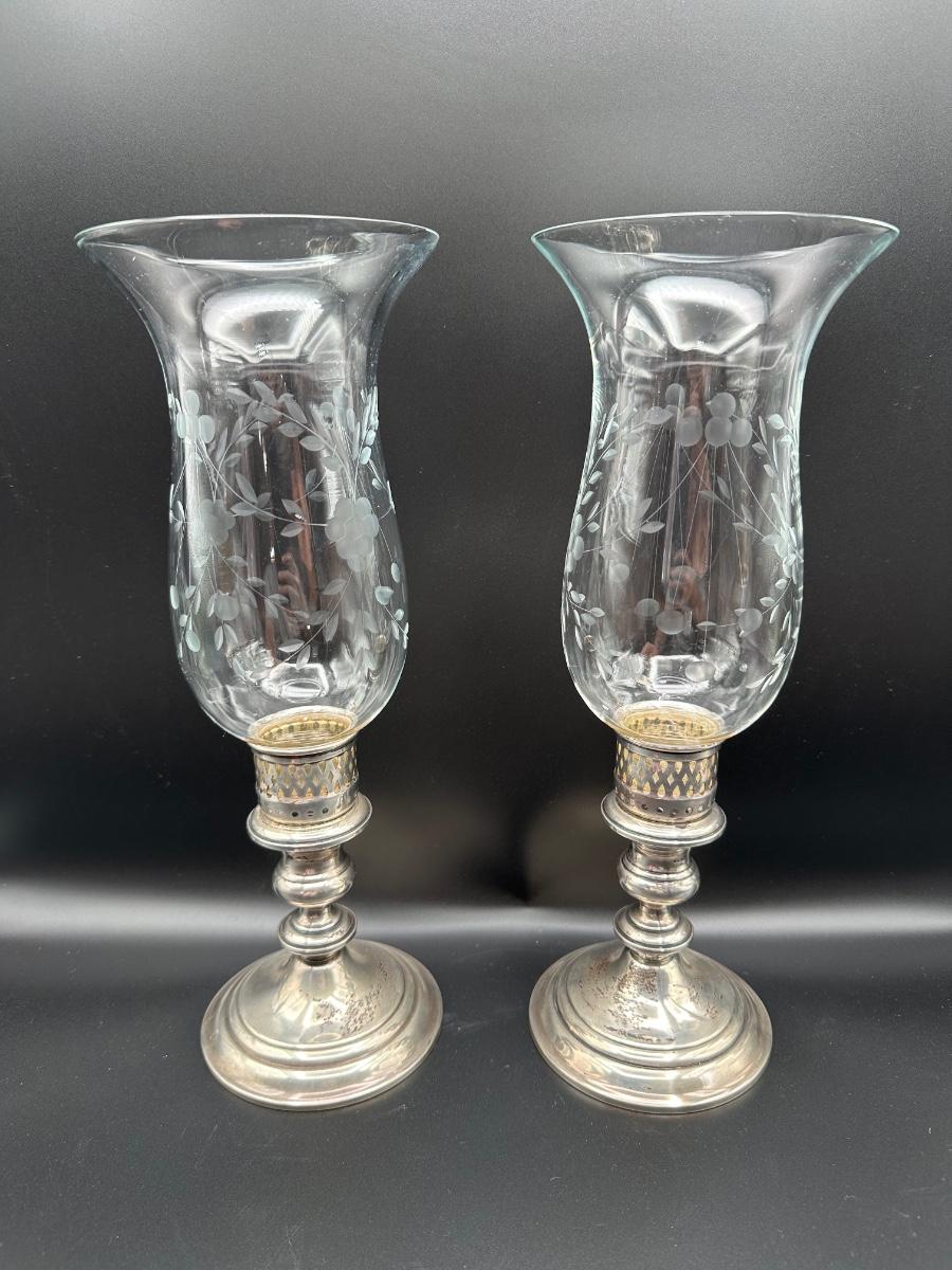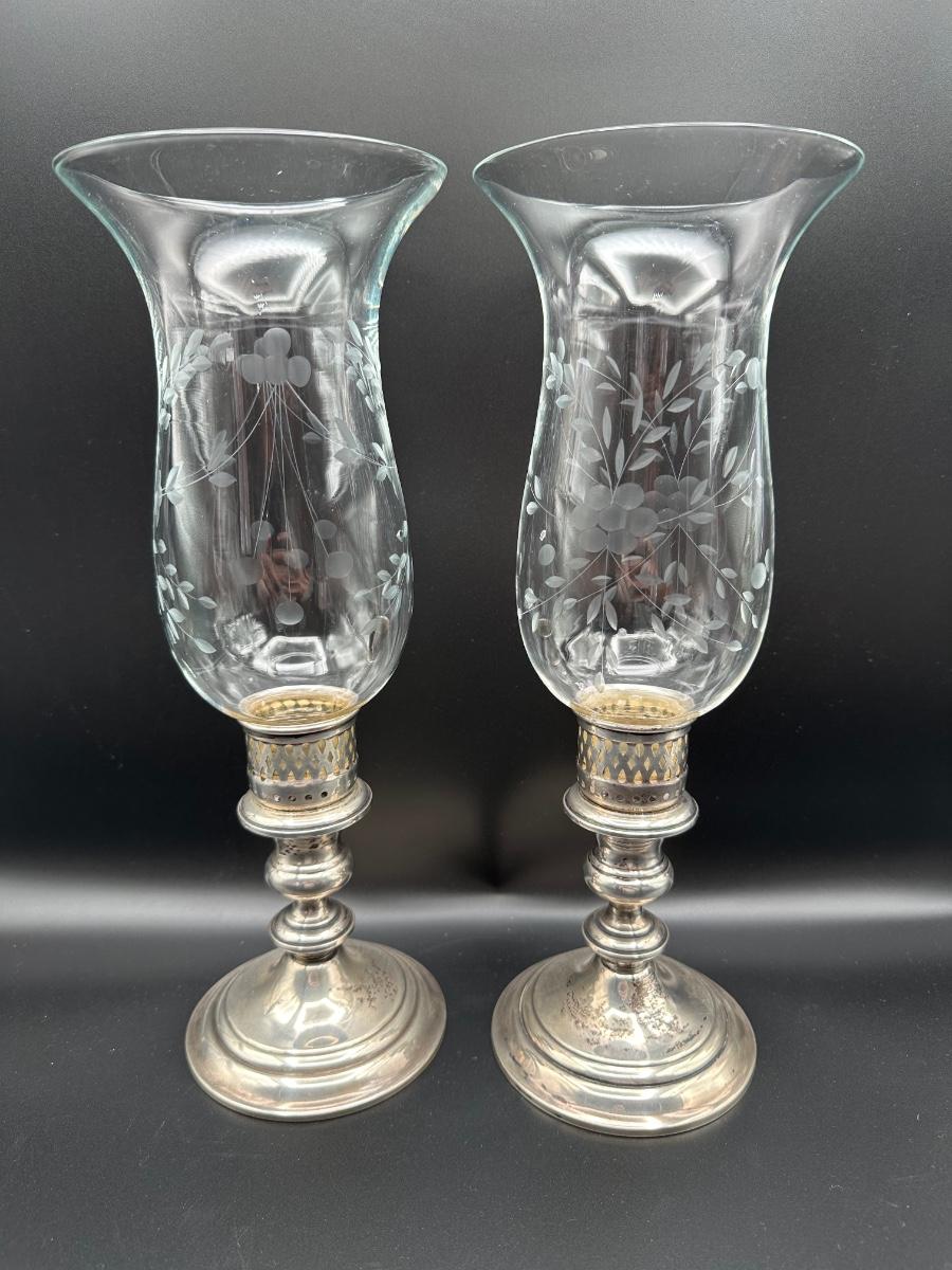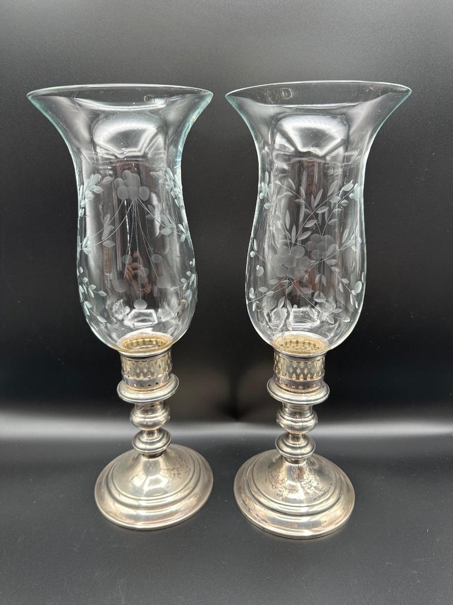Set of 2 Vintage Sterling Silver Hurricane Glass Shade Candle Holders