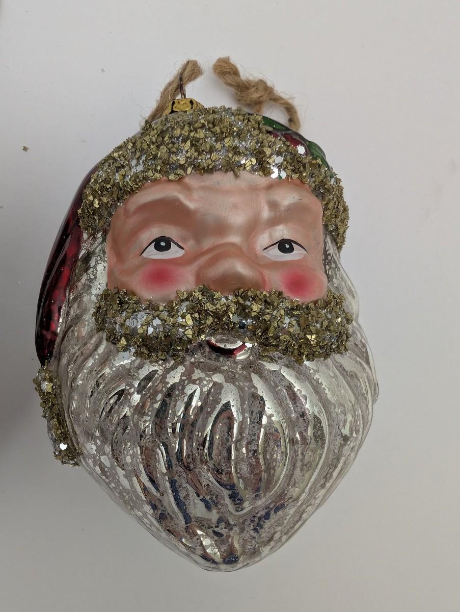 This pair of vintage inspired glass Santa head ornaments brings old world holiday charm to your tree. Each features a jolly Santa face with rosy cheeks a flowing silver beard and glitter trimmed hat and beard details for a festive sparkle. Hung with rustic twine these ornaments add a nostalgic touch and make a wonderful addition to traditional Christmas décor.