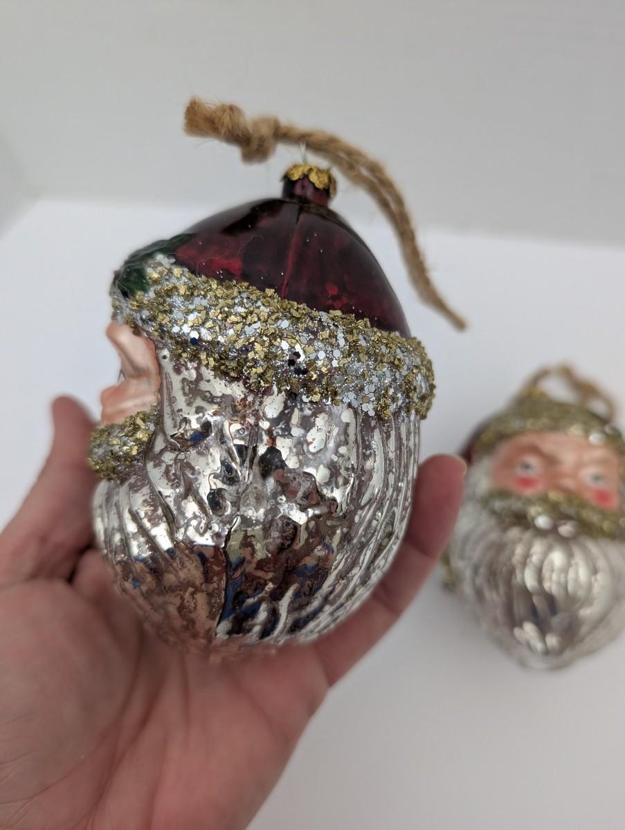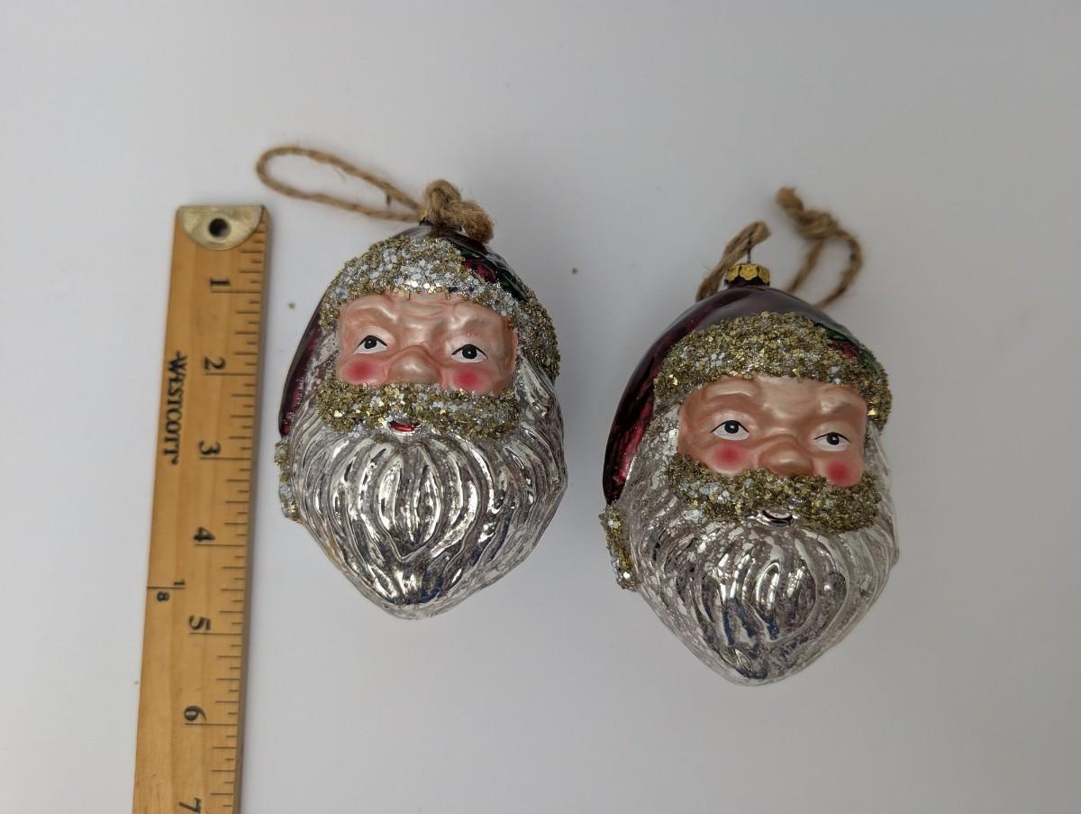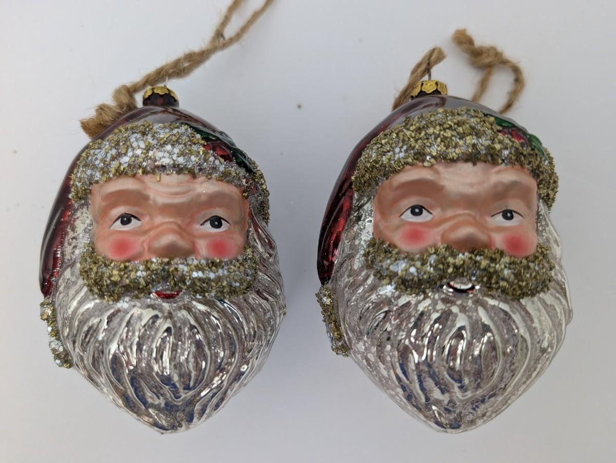 Set Of 2 Vintage Style Glass Santa Head Christmas Ornaments With Glitter Accents