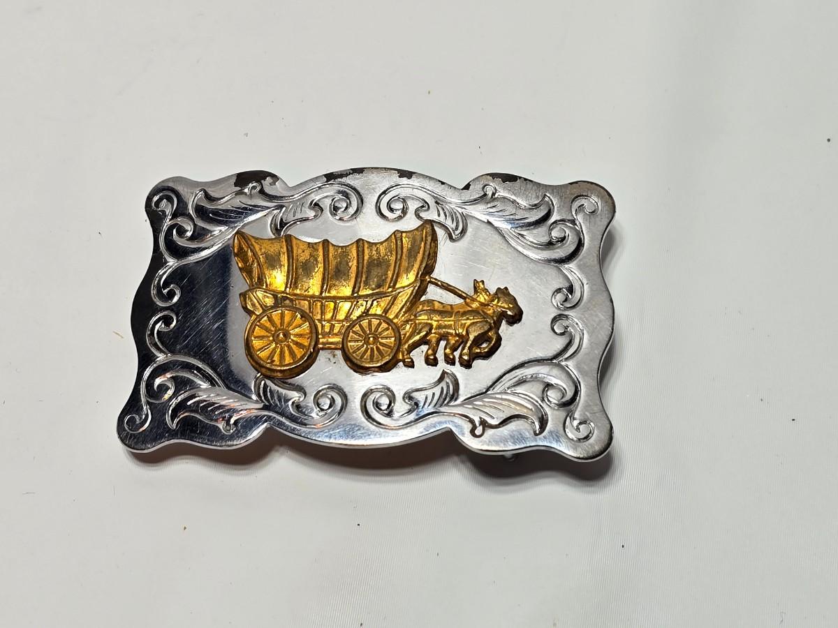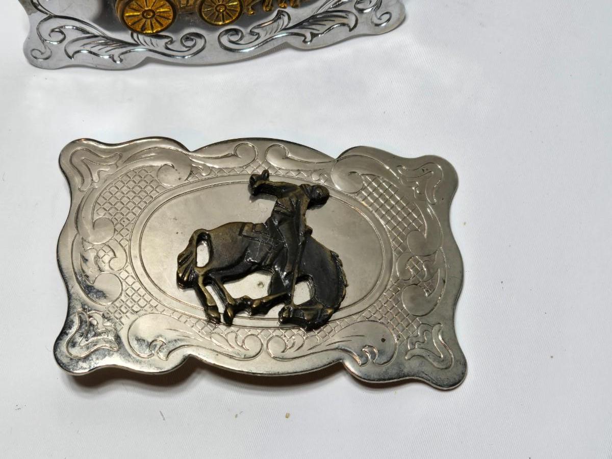 Set of 2 western belt buckles - Bucking Bronc, Wyoming belt buckle = Covered Wagon Belt Buckle Cowboy Pioneer Western Wear Old West