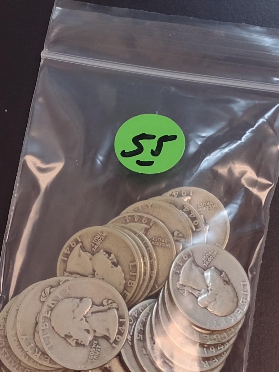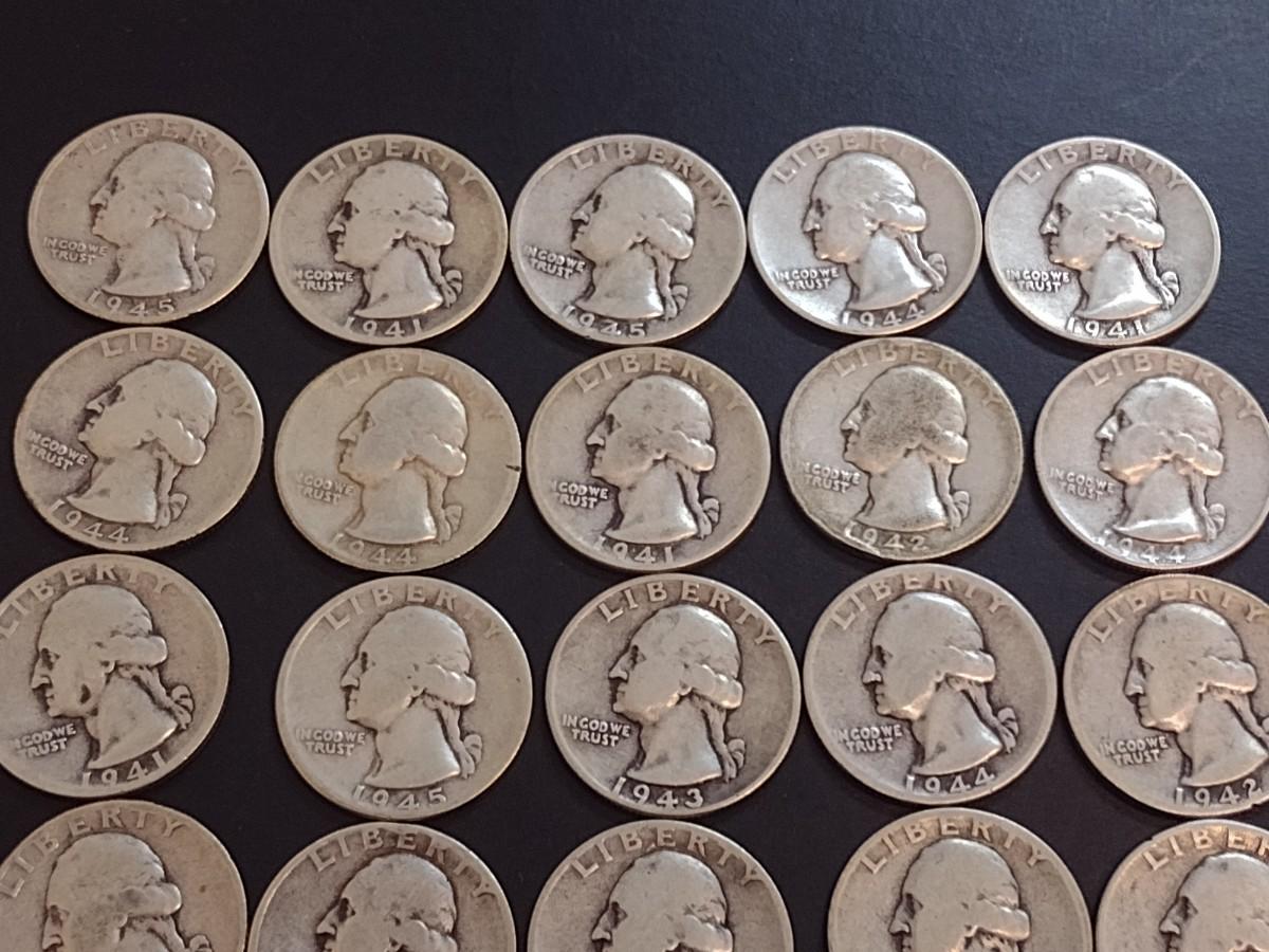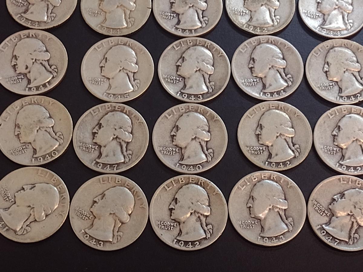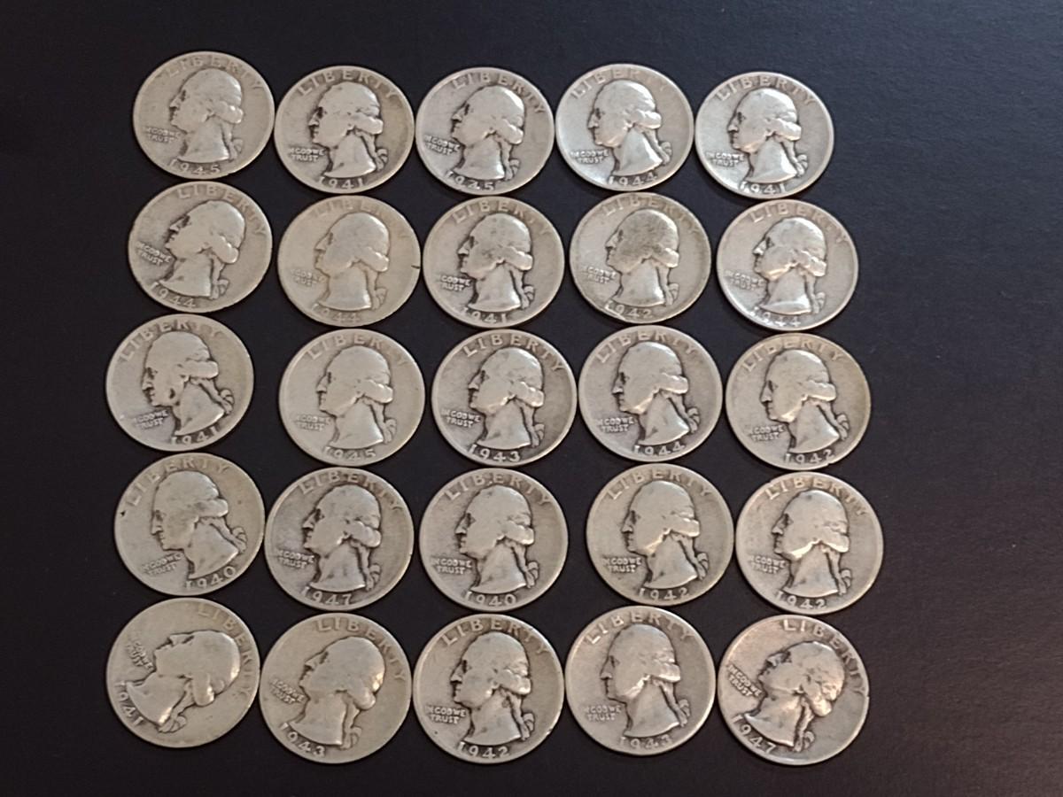 Set of 25 1940-49 U.S. Mint Washington Silver Quarters Circulated (55)