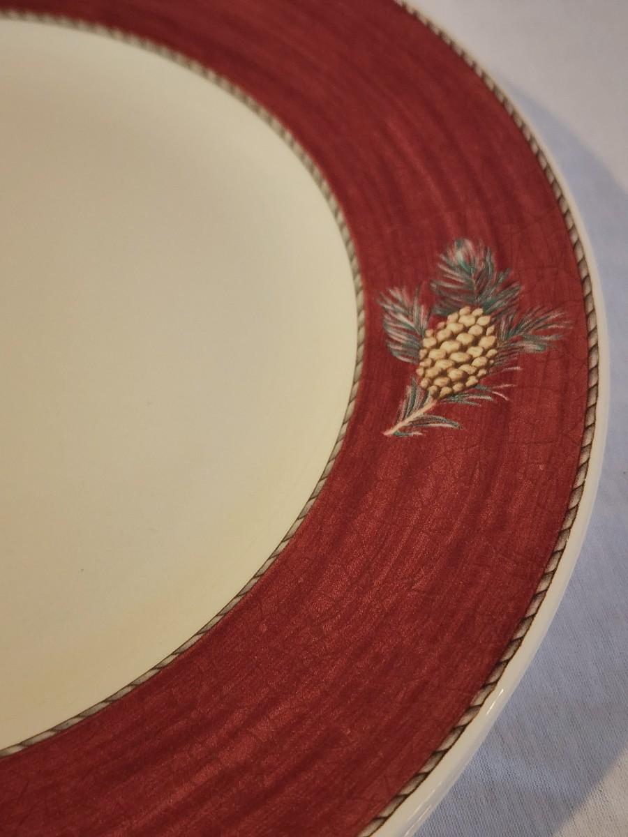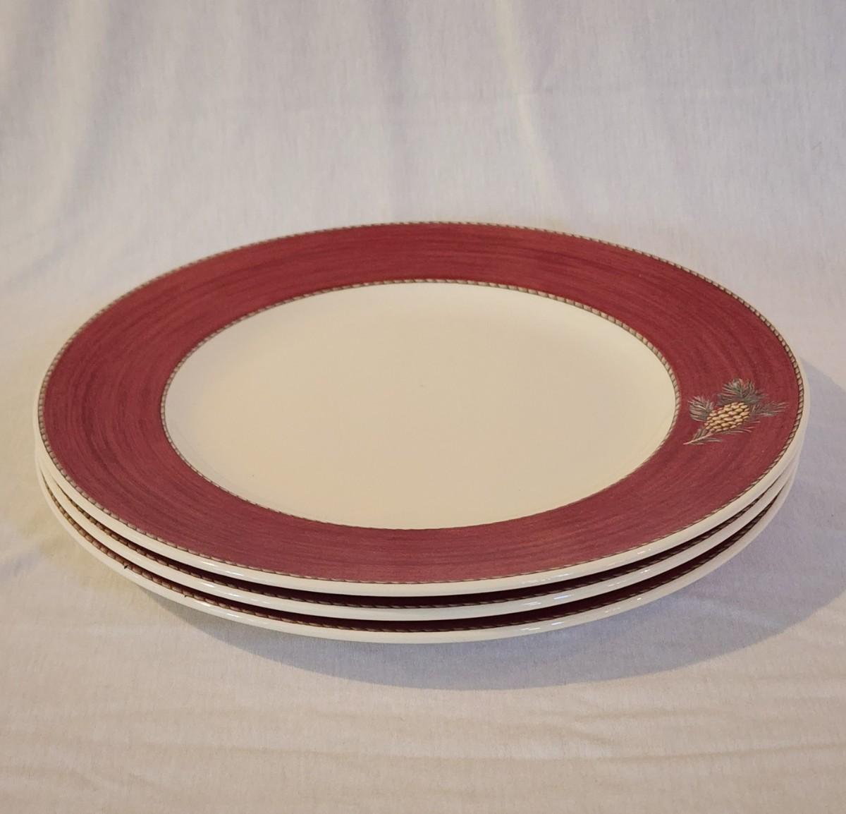 Three 10 3/4" plates. White on the inside with maroon border and pinecone decoration on the rim.