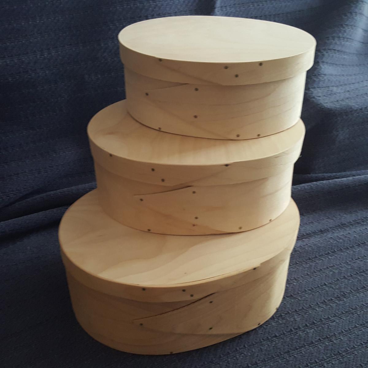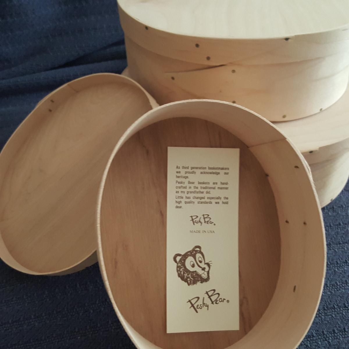 This auction lot is for a Stacking Set of 3 USA-Made Shaker-Style Boxes. The boxes are sanded wood and unstained. The largest box measures about 9.5-inches across the widest part of the oval and about 7.5-inches across the middle. The box stands about 3.5-inches tall. The remaining two boxes are progressively smaller to fit within. This set of boxes is part of a new liquidation we are doing for a lady who owned a large herb catalog business in the early 80s and these were part of her stock - which over time, as the catalog changed - got shoved to the back of her basement unsold. She told us that she bought these wholesale from the Pesky Bear Basket Company in Wisconsin. They do not show these boxes in their on-line catalog and may no longer make them.
