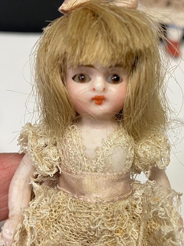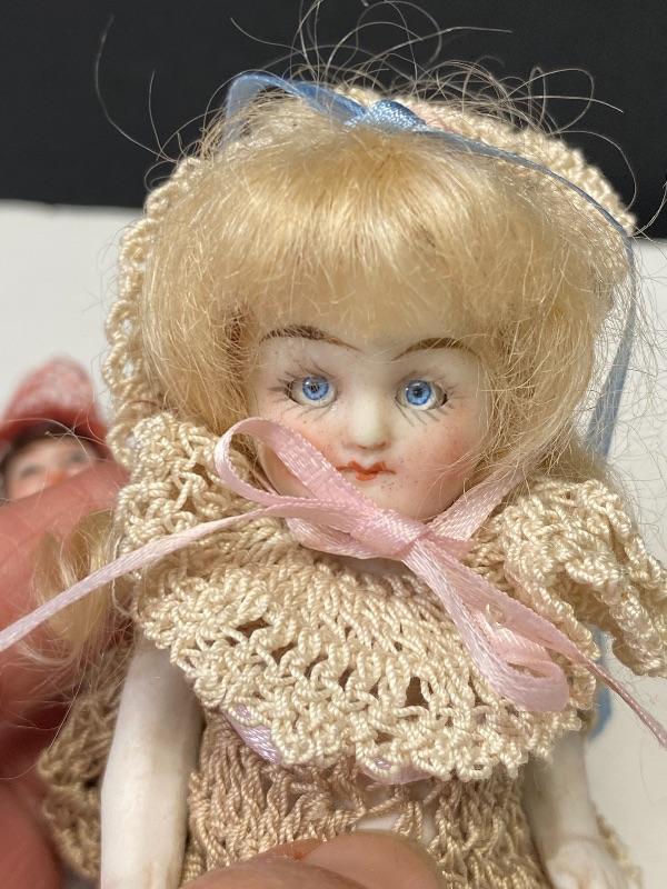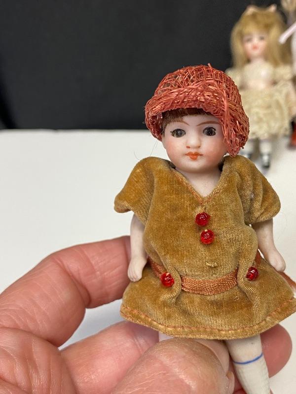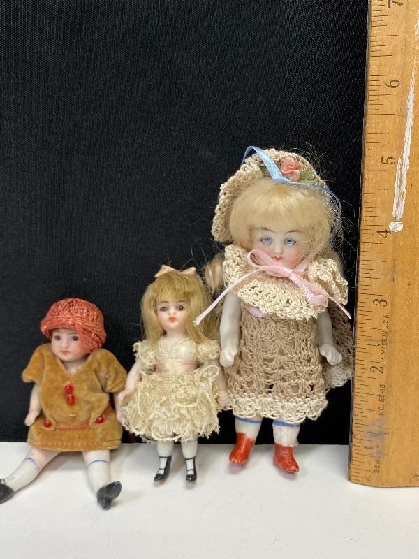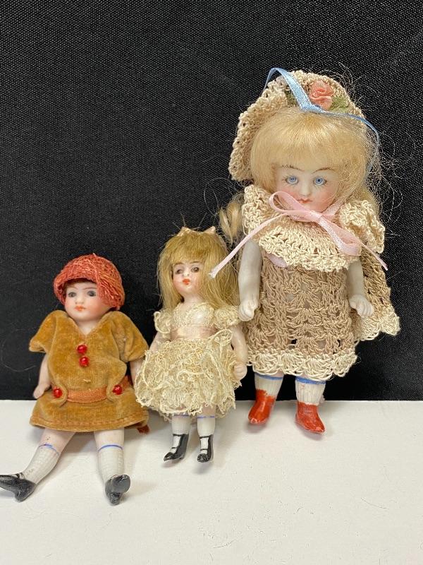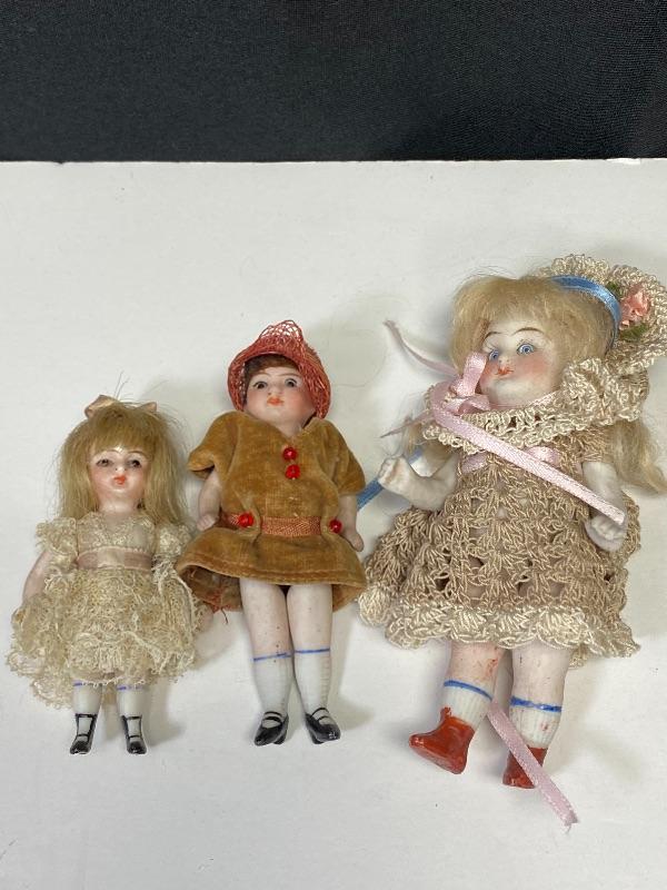Set of 3 antique bisque dollhouse dolls. Various sizes, tallest being 5" and the smallest about 3". All three have glass eyes. Jointed limbs, the smallest does have fixed legs. The 5" doll does have marks on back, "6248 2/0". The eyes on the small one are set a little off, one bulges slightly. All display nicely.