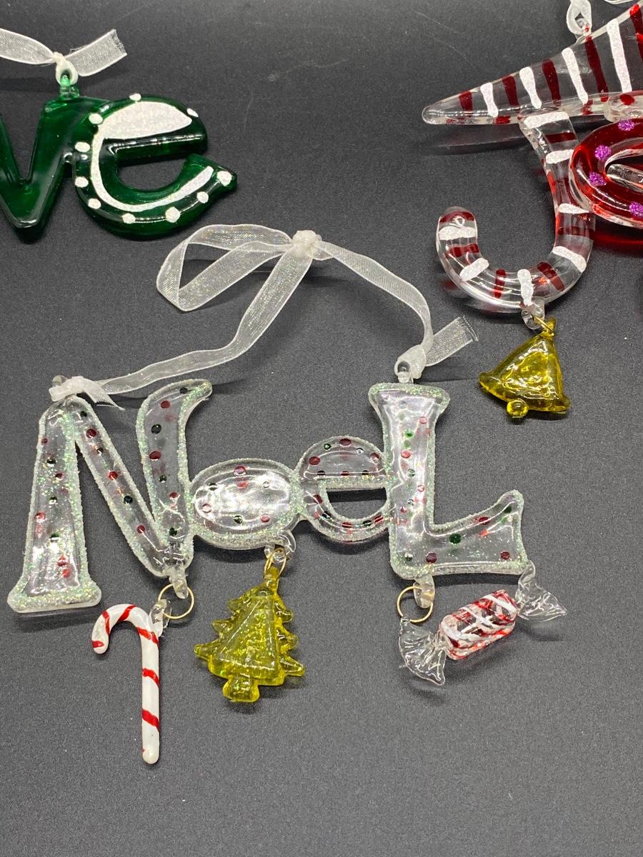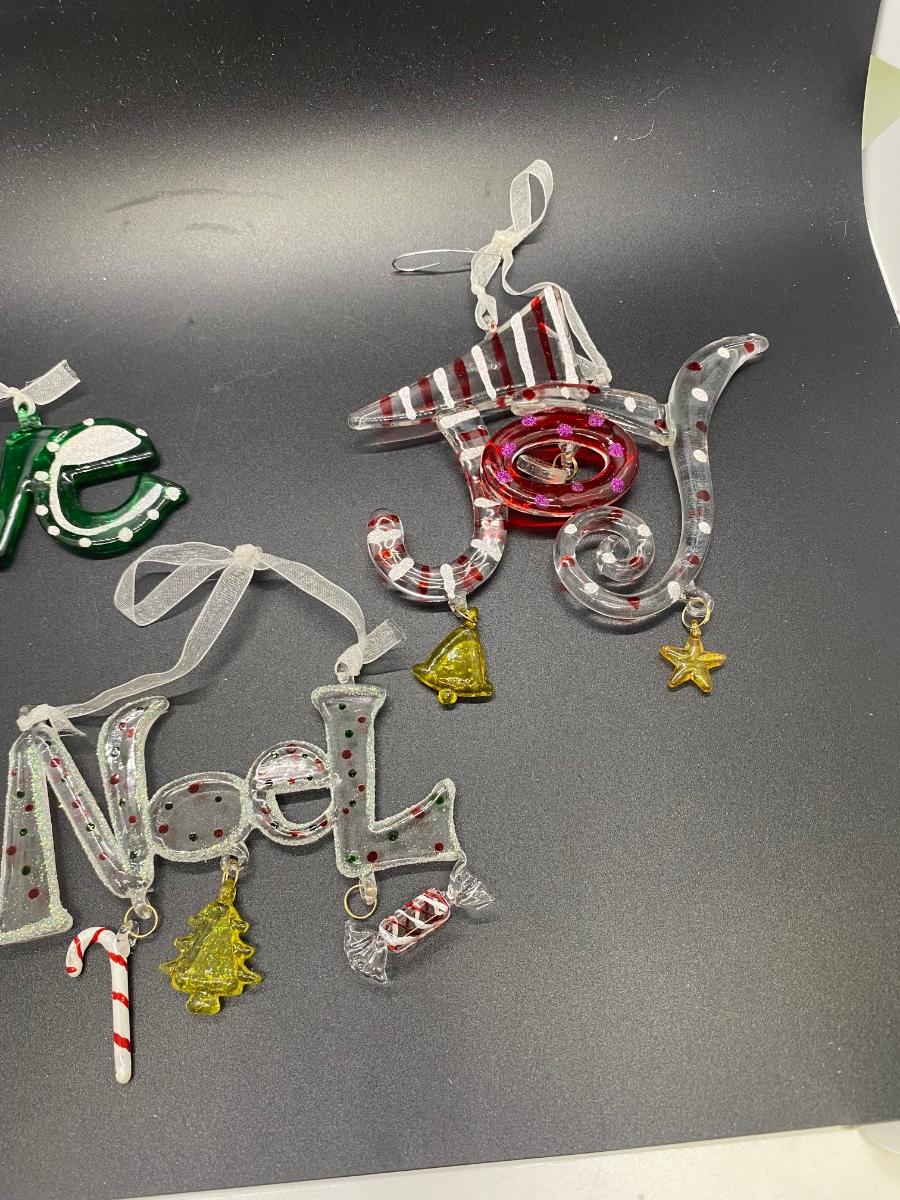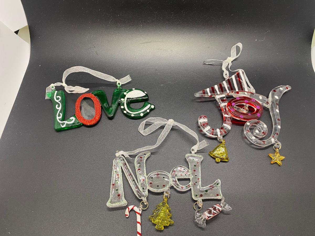 Set of 3 art glass hanging Christmas holiday ornaments. Hang on wall or tree. Fragile, The Noel ornament has a dangling candy that has come off the metal loop.