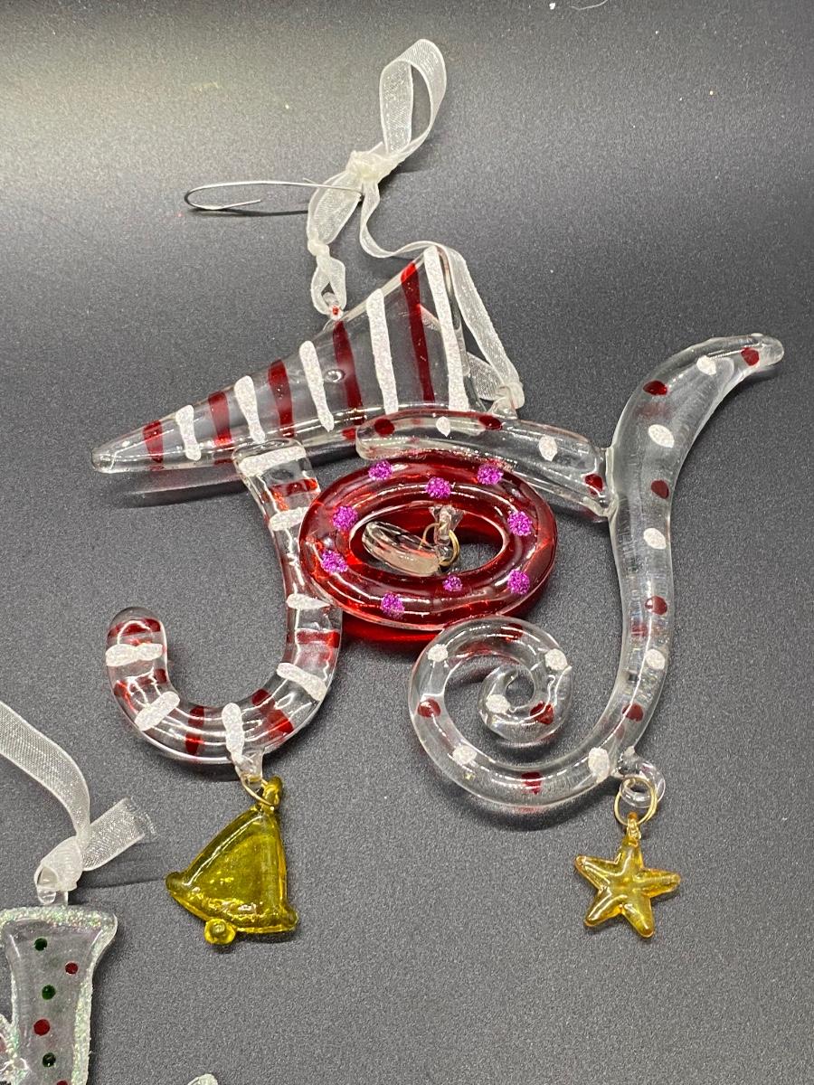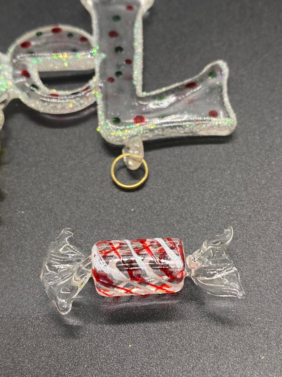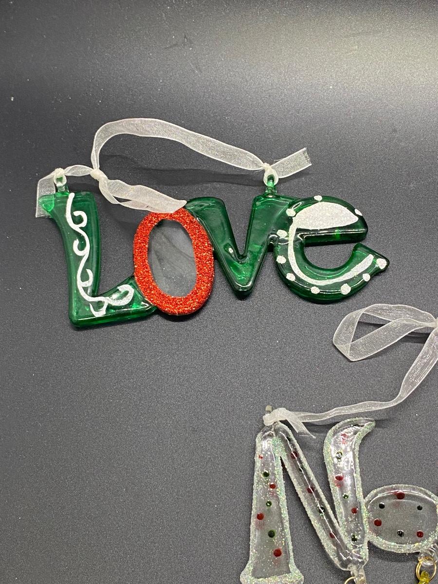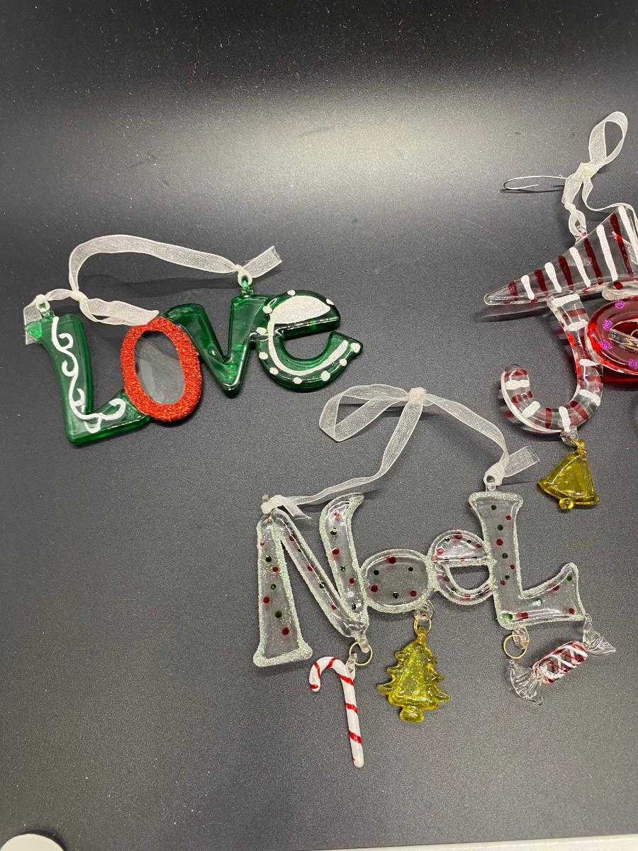 Set of 3 art glass hanging Christmas holiday ornaments. Hang on wall or tree. Fragile, The Noel ornament has a dangling candy that has come off the metal loop.
