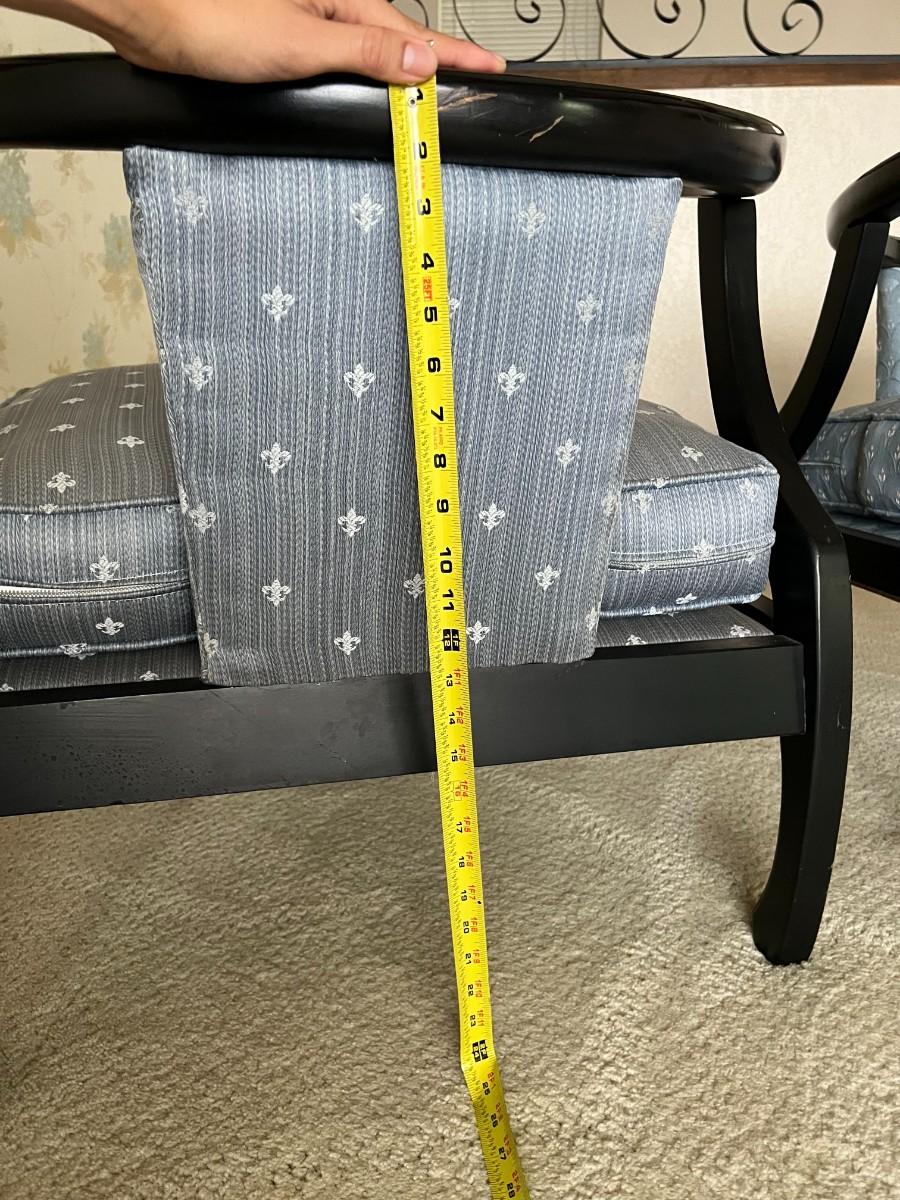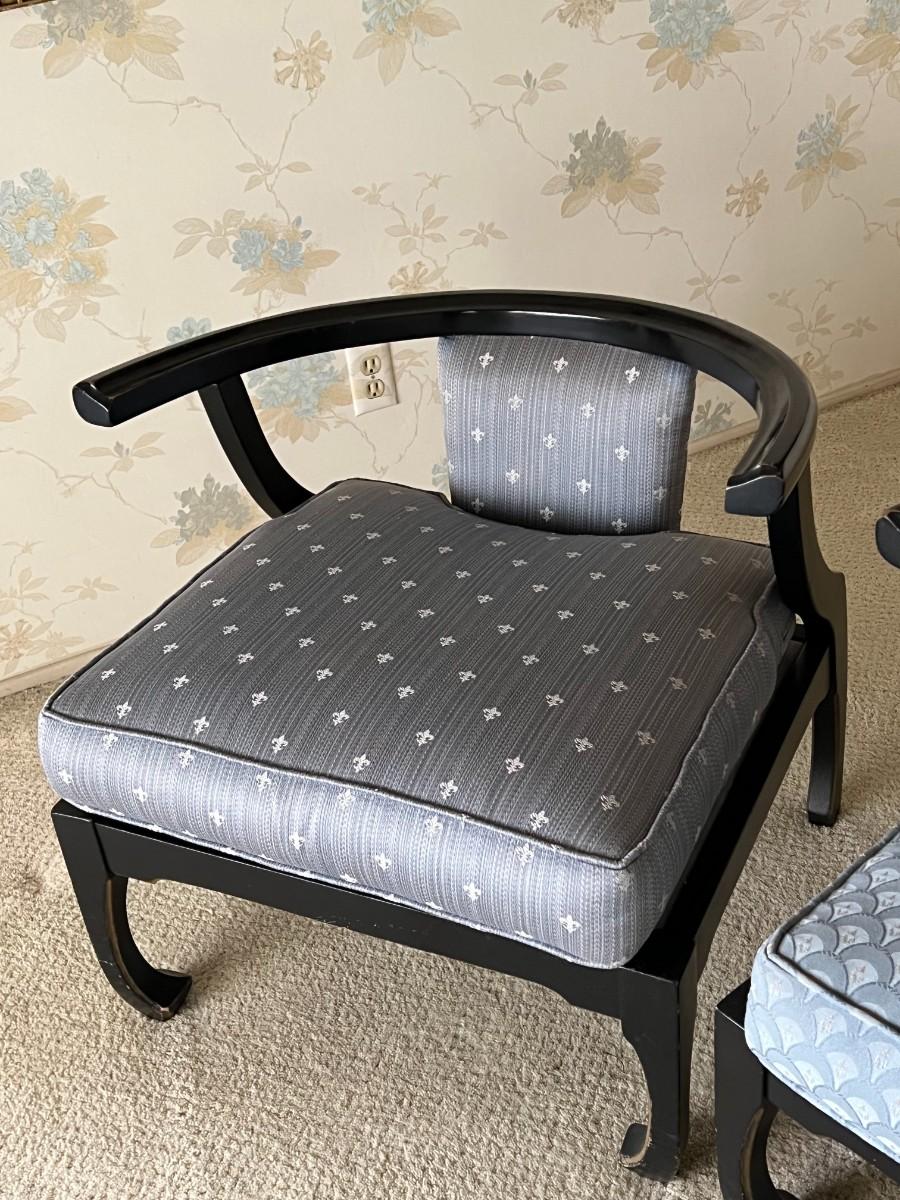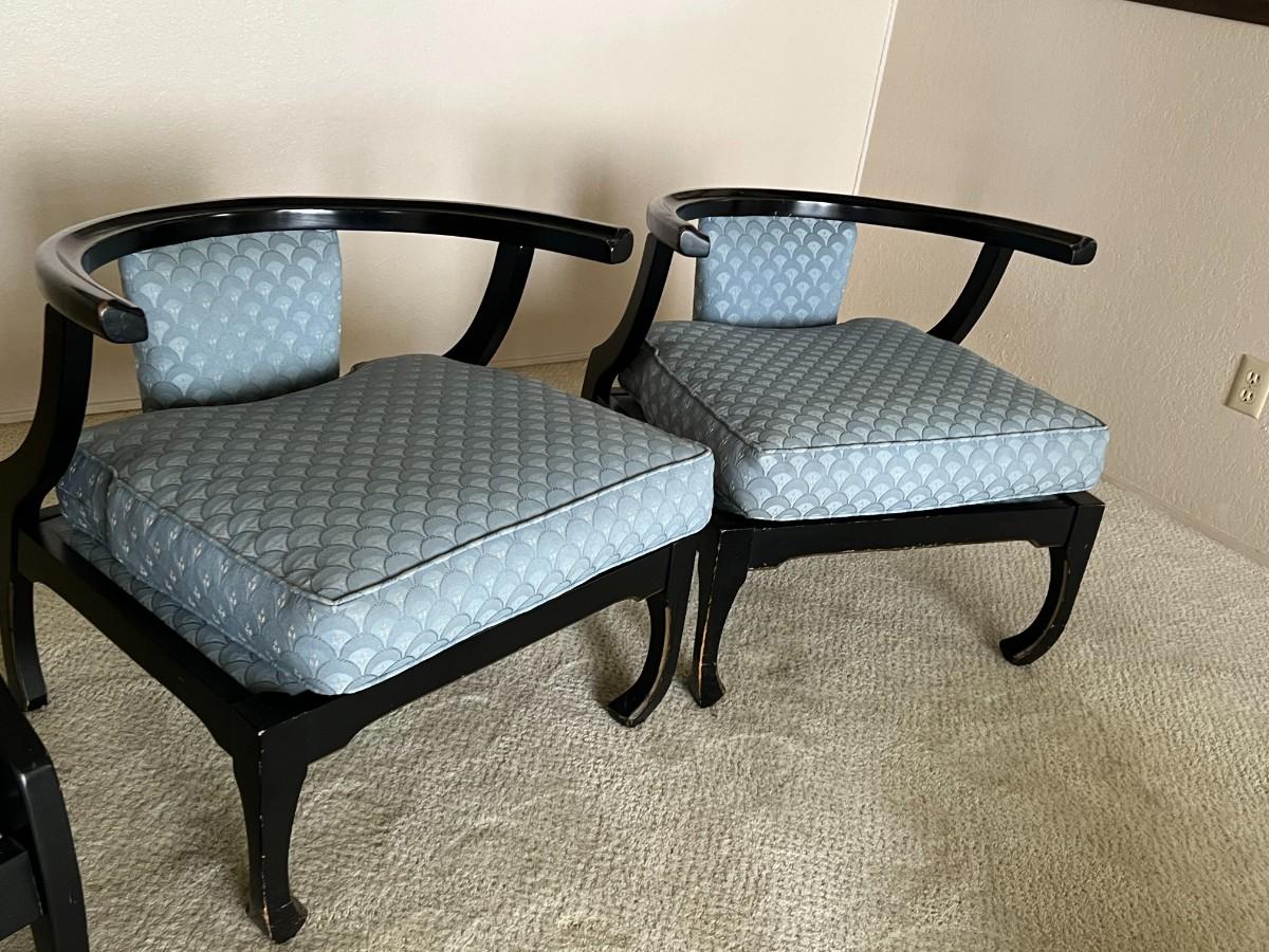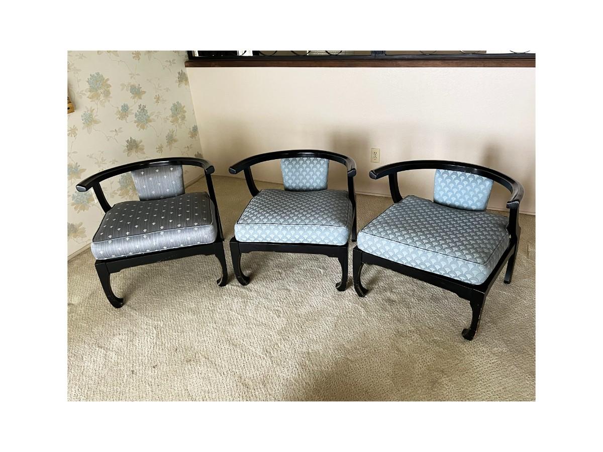 Set of 3 Asian Style Mid Century Wide Seat Cushioned Chairs. Black painted wood, with slight Asian flare. Blue upholstery is probably not original based on frame design. In good condition, there is some wear to the paint from age.